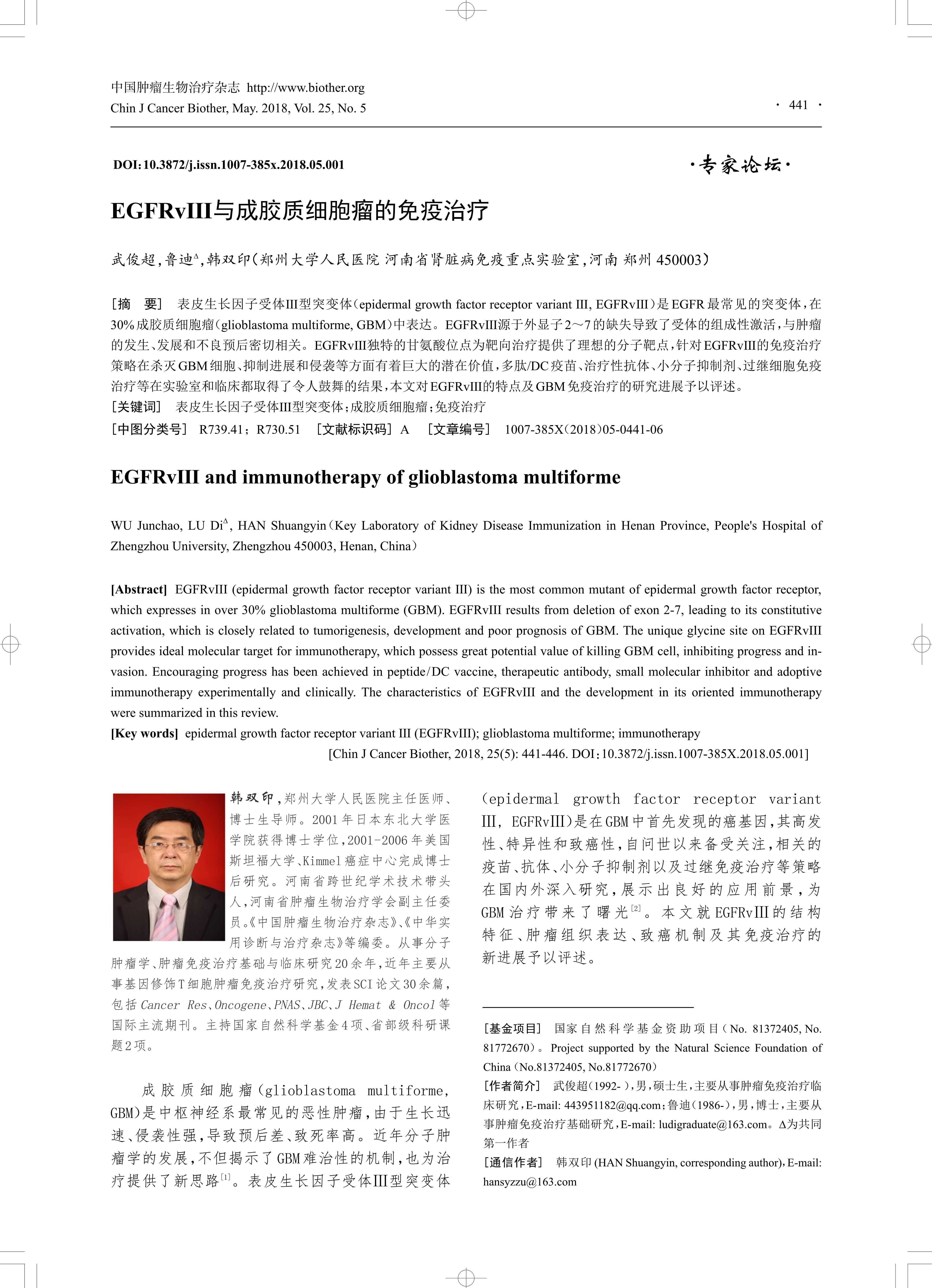 [Abstract] EGFRvIII (epidermal growth factor receptor variant Ⅲ) is the most common mutant of epidermal growth factor receptor,which expresses in over 30% glioblastoma multiforme (GBM). EGFRvIII results from deletion of exon 2-7, leading to its constitutive activation, which is closely related to tumorigenesis, development and poor prognosis of GBM. The unique glycine site on EGFRvIII provides ideal molecular target for immunotherapy, which possess great potential value of killing GBM cell, inhibiting progress and invasion.Encouraging progress has been achieved in peptide/DC vaccine, therapeutic antibody, small molecular inhibitor and adoptive immunotherapy experimentally and clinically. The characteristics of EGFRvIII and the development in its oriented immunotherapy were summarized in this review.