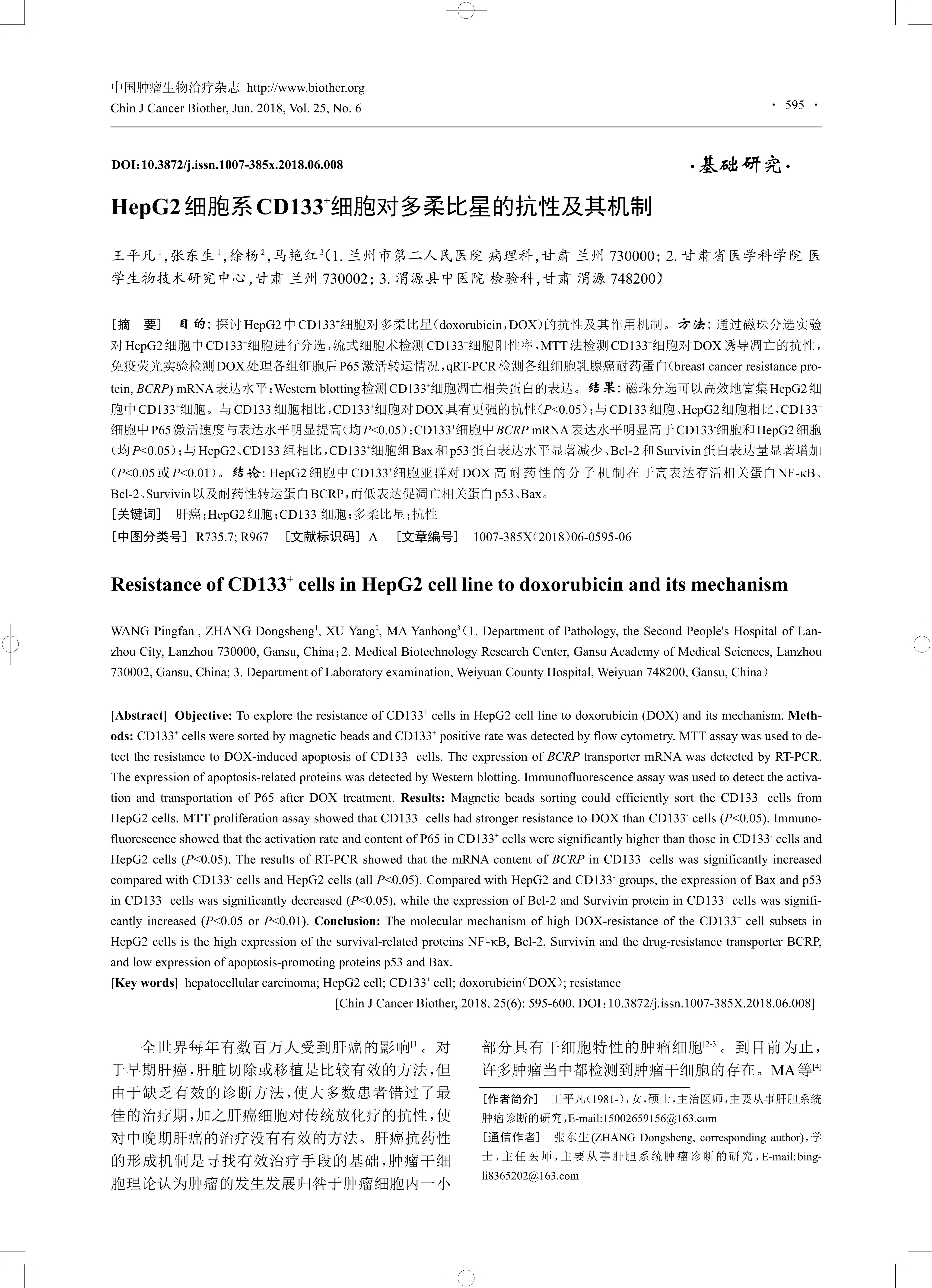 [摘要] 目的: 探讨HepG2 中CD133+细胞对多柔比星(doxorubicin,DOX)的抗性及其作用机制。方法: 通过磁珠分选实验对HepG2 细胞中CD133+细胞进行分选,流式细胞术检测CD133+细胞阳性率,MTT法检测CD133+细胞对DOX诱导凋亡的抗性,免疫荧光实验检测DOX处理各组细胞后P65 激活转运情况,qRT-PCR检测各组细胞乳腺癌耐药蛋白(breast cancer resistance protein,BCRP) mRNA表达水平;Western blotting 检测CD133+细胞凋亡相关蛋白的表达。结果: 磁珠分选可以高效地富集HepG2 细胞中CD133+细胞。与CD133-细胞相比,CD133+细胞对DOX具有更强的抗性(P<0.05);与CD133-细胞、HepG2 细胞相比,CD133+细胞中P65 激活速度与表达水平明显提高(均P<0.05);CD133+细胞中BCRP mRNA表达水平明显高于CD133-细胞和HepG2 细胞(均P<0.05);与HepG2、CD133-组相比,CD133+细胞组Bax 和p53 蛋白表达水平显著减少、Bcl-2 和Survivin 蛋白表达量显著增加(P<0.05 或P<0.01)。结论: HepG2 细胞中CD133+细胞亚群对DOX 高耐药性的分子机制在于高表达存活相关蛋白NF-κB、Bcl-2、Survivin以及耐药性转运蛋白BCRP,而低表达促凋亡相关蛋白p53、Bax。