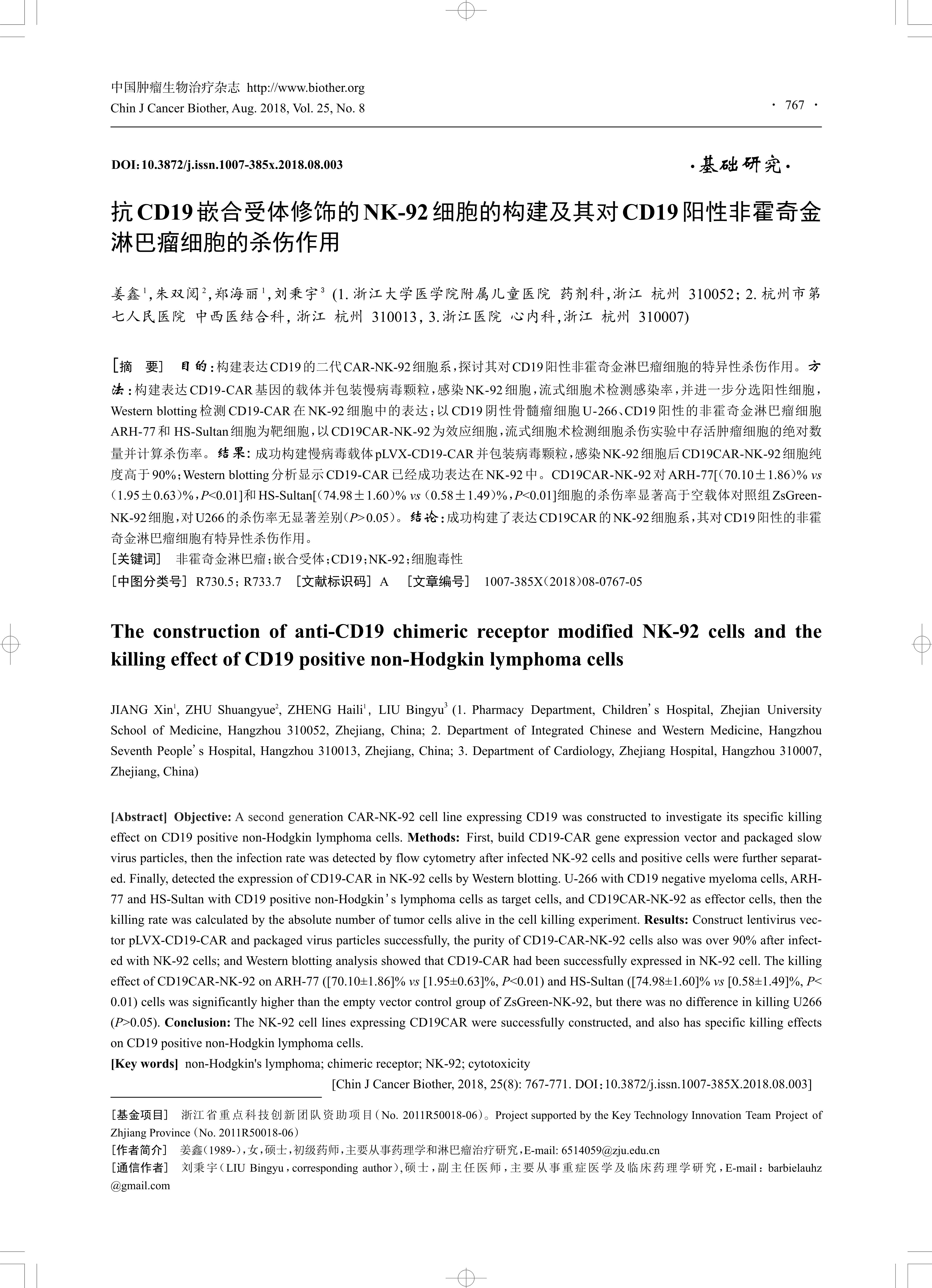 Objective: A second generation CAR-NK-92 cell line expressing CD19 was constructed to investigate its specific killing effect on CD19 positive non-Hodgkin lymphoma cells. Methods: First, build CD19-CAR gene expression vector and packaged slow virus particles, then the infection rate was detected by flow cytometry after infected NK-92 cells and positive cells were further separated.Finally, detected the expression of CD19-CAR in NK-92 cells by Western blotting. U-266 with CD19 negative myeloma cells, ARH-77 and HS-Sultan with CD19 positive non-Hodgkin ’ s lymphoma cells as target cells, and CD19CAR-NK-92 as effector cells, then the killing rate was calculated by the absolute number of tumor cells alive in the cell killing experiment. Results: Construct lentivirus vector pLVX-CD19-CAR and packaged virus particles successfully, the purity of CD19-CAR-NK-92 cells also was over 90% after infected with NK-92 cells; and Western blotting analysis showed that CD19-CAR had been successfully expressed in NK-92 cell. The killing effect of CD19CAR-NK-92 on ARH-77 ([70.10±1.86]% vs [1.95±0.63]%, P<0.01) and HS-Sultan ([74.98±1.60]% vs [0.58±1.49]%, P<0.01) cells was significantly higher than the empty vector control group of ZsGreen-NK-92, but there was no difference in killing U266 (P>0.05). Conclusion: The NK-92 cell lines expressing CD19CAR were successfully constructed, and also has specific killing effects on CD19 positive non-Hodgkin lymphoma cells.