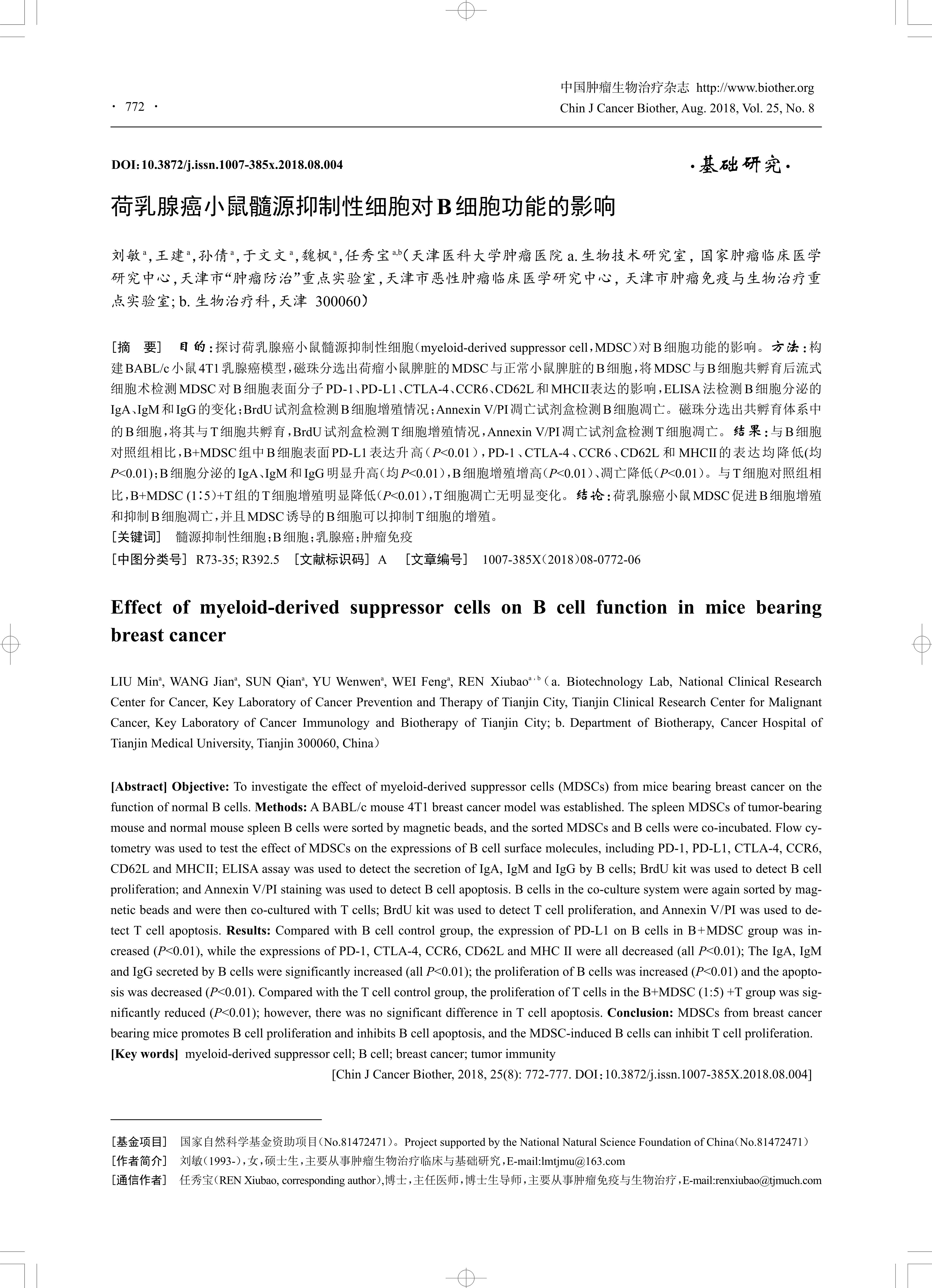 Objective: To investigate the effect of myeloid-derived suppressor cells (MDSCs) from mice bearing breast cancer on the function of normal B cells. Methods: A BABL/c mouse 4T1 breast cancer model was established. The spleen MDSCs of tumor-bearing mouse and normal mouse spleen B cells were sorted by magnetic beads, and the sorted MDSCs and B cells were co-incubated. Flow cytometry was used to test the effect of MDSCs on the expressions of B cell surface molecules, including PD-1, PD-L1, CTLA-4, CCR6,CD62L and MHCⅡ; ELISA assay was used to detect the secretion of IgA, IgM and IgG by B cells; BrdU kit was used to detect B cell proliferation; and Annexin V/PI staining was used to detect B cell apoptosis. B cells in the co-culture system were again sorted by magnetic beads and were then co-cultured with T cells; BrdU kit was used to detect T cell proliferation, and Annexin V/PI was used to detect T cell apoptosis. Results: Compared with B cell control group, the expression of PD-L1 on B cells in B+MDSC group was increased (P<0.01), while the expressions of PD-1, CTLA-4, CCR6, CD62L and MHC Ⅱ were all decreased (all P<0.01); The IgA, IgM and IgG secreted by B cells were significantly increased (all P<0.01); the proliferation of B cells was increased (P<0.01) and the apoptosis was decreased (P<0.01). Compared with the T cell control group, the proliferation of T cells in the B+MDSC (1:5) +T group was significantly reduced (P<0.01); however, there was no significant difference in T cell apoptosis. Conclusion: MDSCs from breast cancer bearing mice promotes B cell proliferation and inhibits B cell apoptosis, and the MDSC-induced B cells can inhibit T cell proliferation.