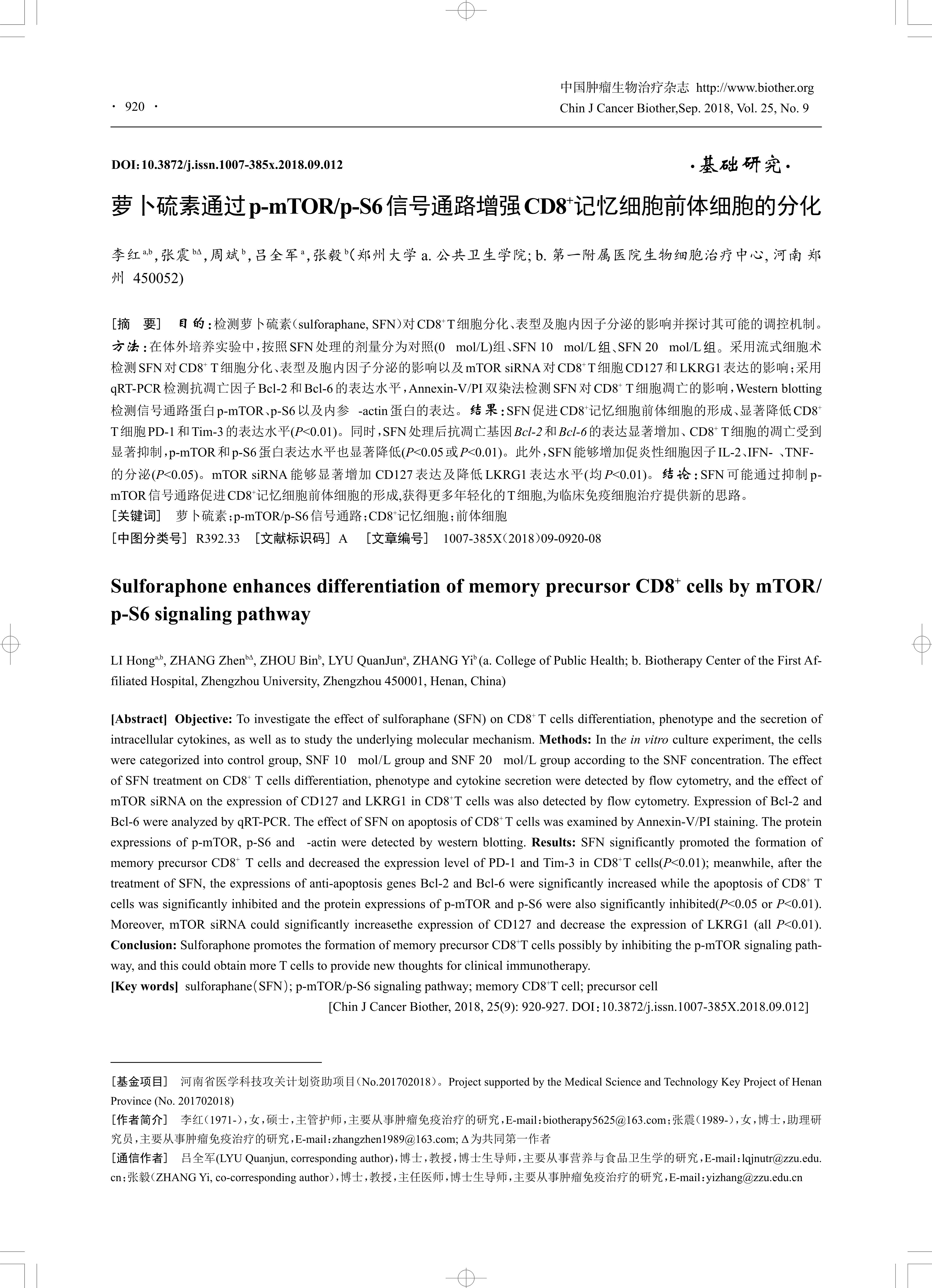 Objective: To investigate the effect of sulforaphane (SFN) on CD8+ T cells differentiation, phenotype and the secretion of intracellular cytokines, as well as to study the underlying molecular mechanism. Methods: In the in vitro culture experiment, the cells were categorized into control group, SNF 10 mmol/L group and SNF 20 mmol/L group according to the SNF concentration. The effect of SFN treatment on CD8+ T cells differentiation, phenotype and cytokine secretion were detected by flow cytometry, and the effect of mTOR siRNA on the expression of CD127 and LKRG1 in CD8+T cells was also detected by flow cytometry. Expression of Bcl-2 and Bcl-6 were analyzed by qRT-PCR. The effect of SFN on apoptosis of CD8+T cells was examined by Annexin-V/PI staining. The protein expressions of p-mTOR, p-S6 and b-actin were detected by western blotting. Results: SFN significantly promoted the formation of memory precursor CD8+ T cells and decreased the expression level of PD-1 and Tim-3 in CD8+T cells(P<0.01); meanwhile, after the treatment of SFN, the expressions of anti-apoptosis genes Bcl-2 and Bcl-6 were significantly increased while the apoptosis of CD8+ T cells was significantly inhibited and the protein expressions of p-mTOR and p-S6 were also significantly inhibited(P<0.05 or P<0.01).Moreover, mTOR siRNA could significantly increasethe expression of CD127 and decrease the expression of LKRG1 (all P<0.01).Conclusion: Sulforaphone promotes the formation of memory precursor CD8+T cells possibly by inhibiting the p-mTOR signaling pathway,and this could obtain more T cells to provide new thoughts for clinical immunotherapy.