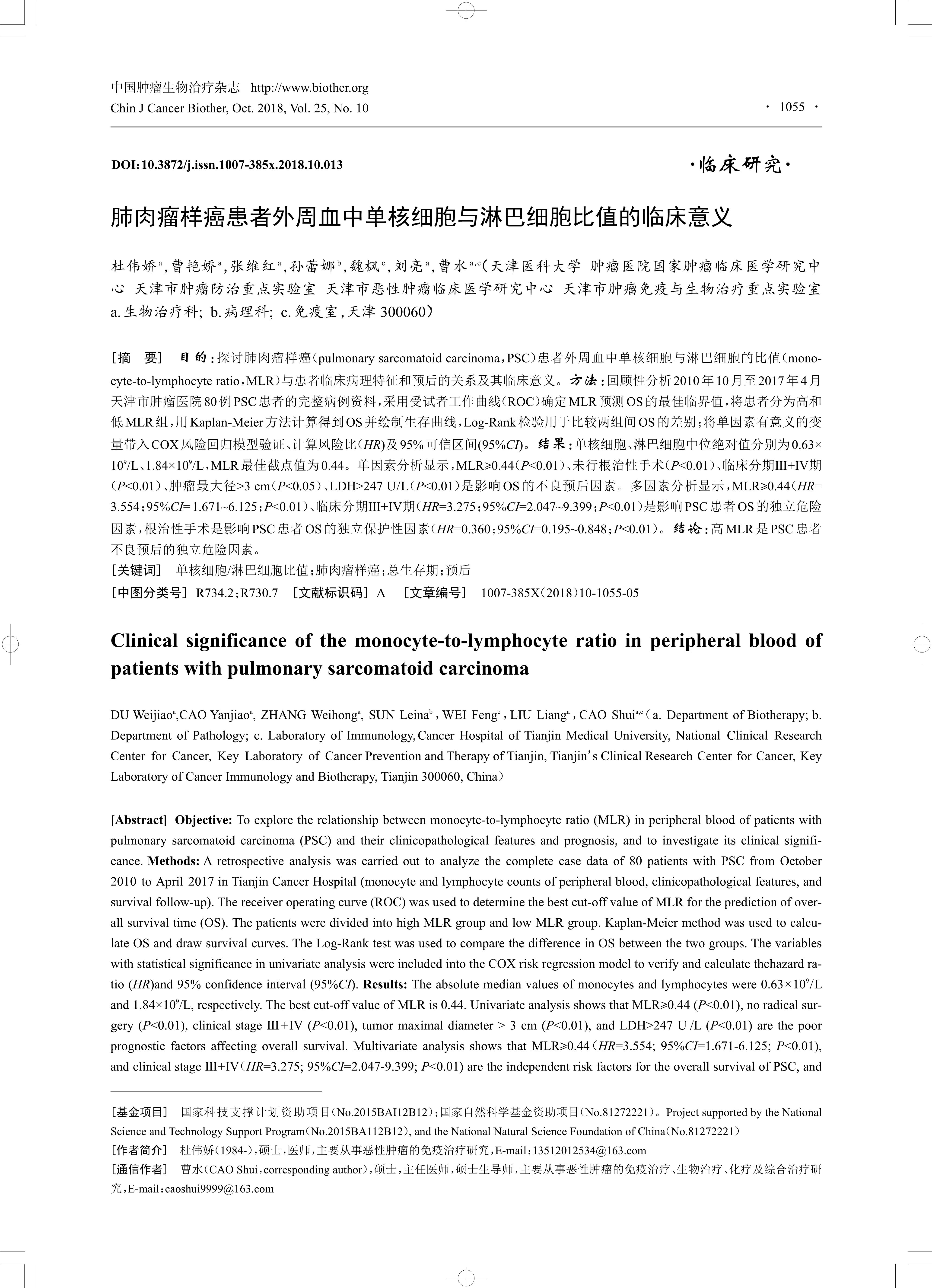 目的:探讨肺肉瘤样癌(pulmonary sarcomatoid carcinoma,PSC)患者外周血中单核细胞与淋巴细胞的比值(monocyte-to-lymphocyte ratio,MLR)与患者临床病理特征和预后的关系及其临床意义。方法:回顾性分析2010 年10 月至2017 年4 月天津市肿瘤医院80 例PSC患者的完整病例资料,采用受试者工作曲线(ROC)确定MLR预测OS的最佳临界值,将患者分为高和低MLR组,用Kaplan-Meier 方法计算得到OS并绘制生存曲线,Log-Rank 检验用于比较两组间OS的差别;将单因素有意义的变量带入COX风险回归模型验证、计算风险比(HR)及95%可信区间(95%CI)。结果:单核细胞、淋巴细胞中位绝对值分别为0.63×109/L、1.84×109/L,MLR最佳截点值为0.44。单因素分析显示,MLR≥0.44(P<0.01)、未行根治性手术(P<0.01)、临床分期Ⅲ+Ⅳ期(P<0.01)、肿瘤最大径>3 cm(P<0.05)、LDH>247 U/L(P<0.01)是影响OS 的不良预后因素。多因素分析显示,MLR≥0.44(HR=3.554;95%CI=1.671~6.125;P<0.01)、临床分期Ⅲ+Ⅳ期(HR=3.275;95%CI=2.047~9.399;P<0.01)是影响PSC患者OS的独立危险因素,根治性手术是影响PSC 患者OS的独立保护性因素(HR=0.360;95%CI=0.195~0.848;P<0.01)。结论:高MLR是PSC 患者不良预后的独立危险因素。