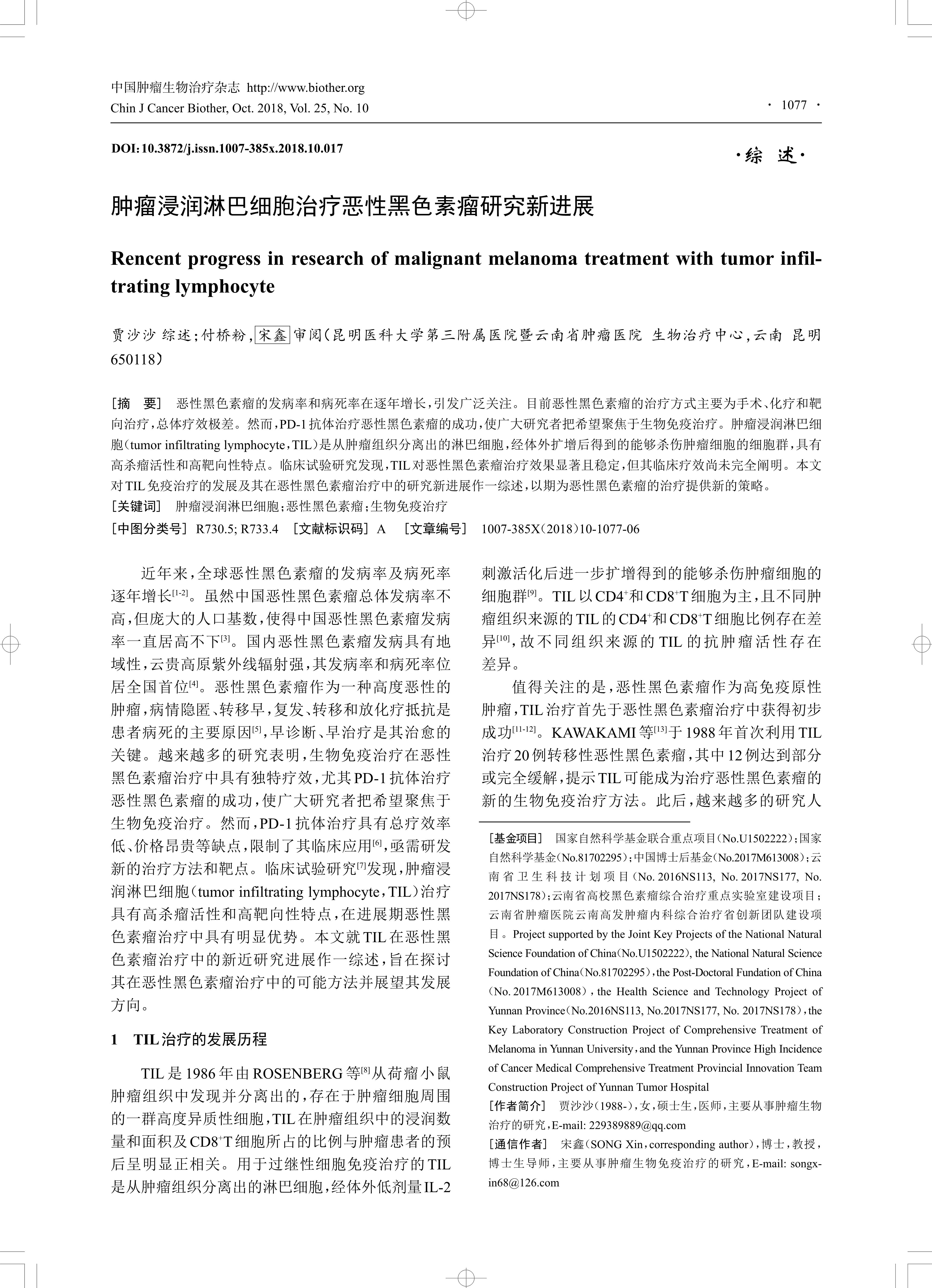 [摘要] 恶性黑色素瘤的发病率和病死率在逐年增长,引发广泛关注。目前恶性黑色素瘤的治疗方式主要为手术、化疗和靶向治疗,总体疗效极差。然而,PD-1 抗体治疗恶性黑色素瘤的成功,使广大研究者把希望聚焦于生物免疫治疗。肿瘤浸润淋巴细胞(tumor infiltrating lymphocyte,TIL)是从肿瘤组织分离出的淋巴细胞,经体外扩增后得到的能够杀伤肿瘤细胞的细胞群,具有高杀瘤活性和高靶向性特点。临床试验研究发现,TIL对恶性黑色素瘤治疗效果显著且稳定,但其临床疗效尚未完全阐明。本文对TIL免疫治疗的发展及其在恶性黑色素瘤治疗中的研究新进展作一综述,以期为恶性黑色素瘤的治疗提供新的策略。