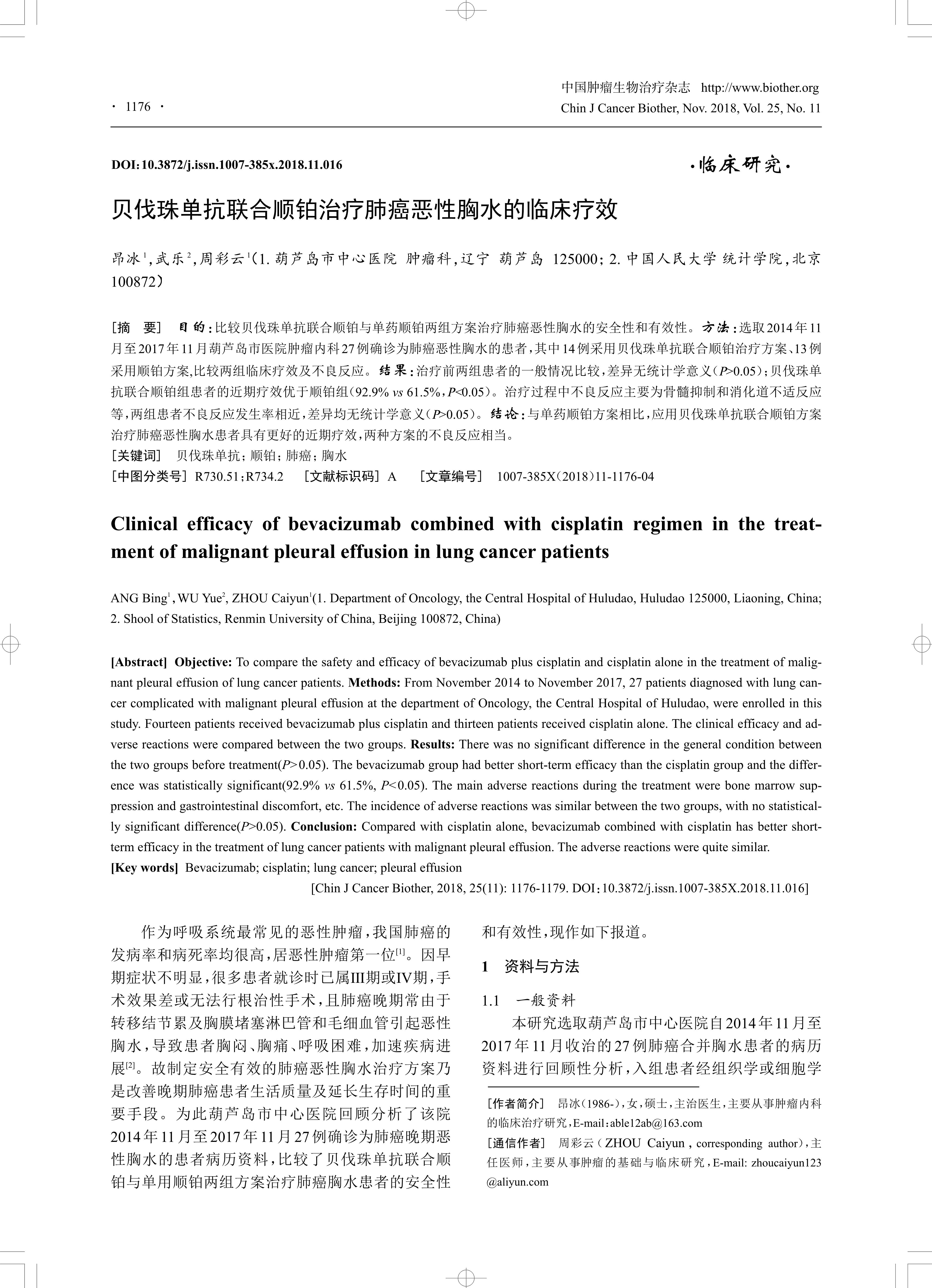 目的:比较贝伐珠单抗联合顺铂与单药顺铂两组方案治疗肺癌恶性胸水的安全性和有效性。方法:选取2014 年11月至2017 年11 月葫芦岛市医院肿瘤内科27 例确诊为肺癌恶性胸水的患者,其中14 例采用贝伐珠单抗联合顺铂治疗方案、13 例采用顺铂方案,比较两组临床疗效及不良反应。结果:治疗前两组患者的一般情况比较,差异无统计学意义(P>0.05);贝伐珠单抗联合顺铂组患者的近期疗效优于顺铂组(92.9% vs 61.5%,P<0.05)。治疗过程中不良反应主要为骨髓抑制和消化道不适反应等,两组患者不良反应发生率相近,差异均无统计学意义(P>0.05)。结论:与单药顺铂方案相比,应用贝伐珠单抗联合顺铂方案治疗肺癌恶性胸水患者具有更好的近期疗效,两种方案的不良反应相当。