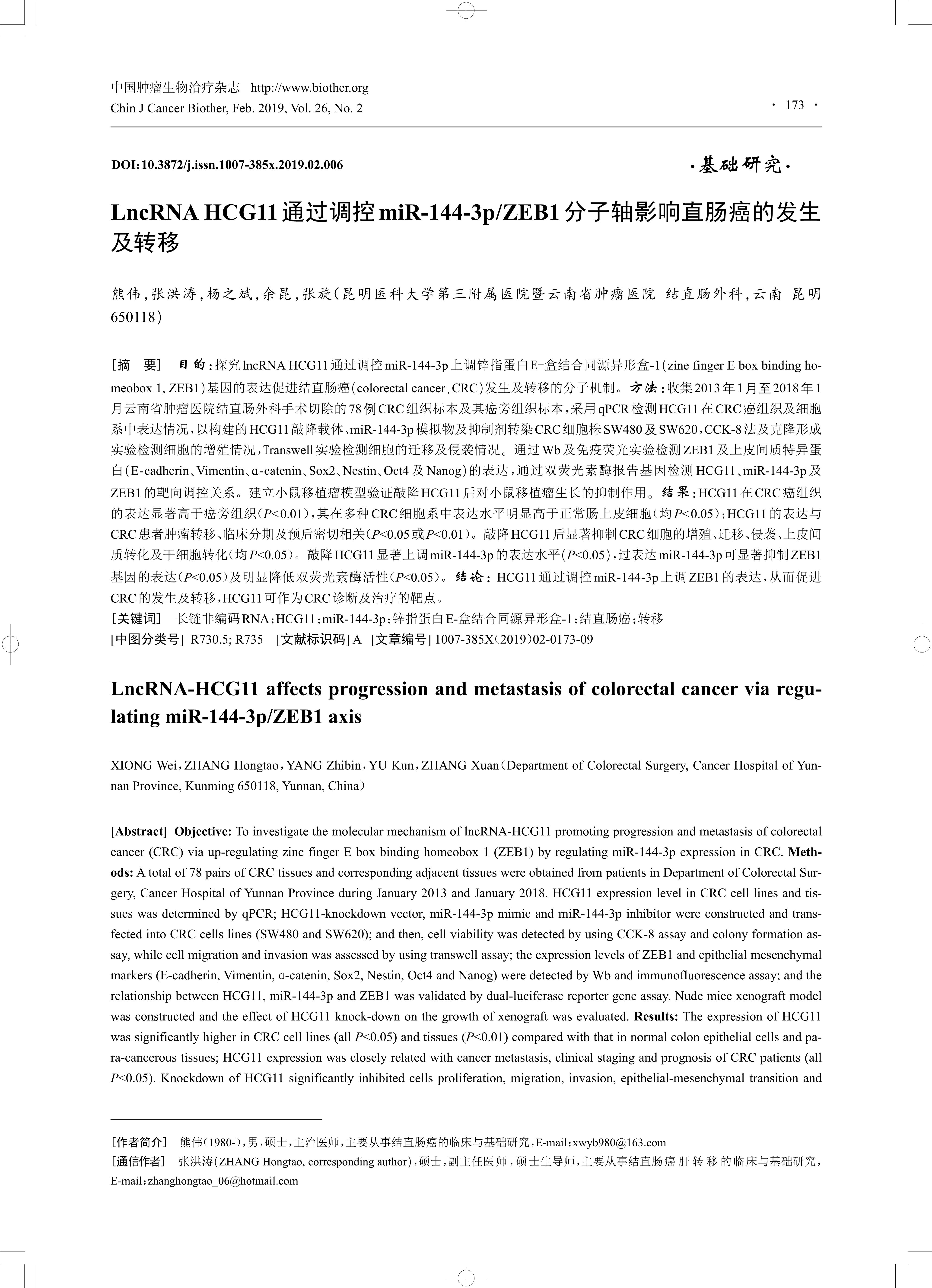 [Abstract] Objective: To investigate the molecular mechanism of lncRNA-HCG11 promoting progression and metastasis of colorectal cancer (CRC) via up-regulating zinc finger E box binding homeobox 1 (ZEB1) by regulating miR-144-3p expression in CRC. Methods:A total of 78 pairs of CRC tissues and corresponding adjacent tissues were obtained from patients in Department of Colorectal Surgery,Cancer Hospital of Yunnan Province during January 2013 and January 2018. HCG11 expression level in CRC cell lines and tissues was determined by qPCR; HCG11-knockdown vector, miR-144-3p mimic and miR-144-3p inhibitor were constructed and transfected into CRC cells lines (SW480 and SW620); and then, cell viability was detected by using CCK-8 assay and colony formation assay,while cell migration and invasion was assessed by using transwell assay; the expression levels of ZEB1 and epithelial mesenchymal markers (E-cadherin, Vimentin, ɑ-catenin, Sox2, Nestin, Oct4 and Nanog) were detected by Wb and immunofluorescence assay; and the relationship between HCG11, miR-144-3p and ZEB1 was validated by dual-luciferase reporter gene assay. Nude mice xenograft model was constructed and the effect of HCG11 knock-down on the growth of xenograft was evaluated. Results: The expression of HCG11 was significantly higher in CRC cell lines (all P<0.05) and tissues (P<0.01) compared with that in normal colon epithelial cells and para-cancerous tissues; HCG11 expression was closely related with cancer metastasis, clinical staging and prognosis of CRC patients (all P<0.05). Knockdown of HCG11 significantly inhibited cells proliferation, migration, invasion, epithelial-mesenchymal transition and CRC stem cell formation (all P<0.05). Moreover, knockdown of HCG11 significantly up-regulated miR-144-3p expression (P<0.05),while over-expression of miR-144-3p significantly inhibited ZEB1 expression (P<0.05) and reduced dual-luciferase activity (P<0.05).Conclusion: HCG11 regulates miR-144-3p to up-regulate ZEB1 expression, and further promotes CRC progression and metastasis;therefore, HCG11 could be used as a target for clinical diagnosis and treatment for CRC.