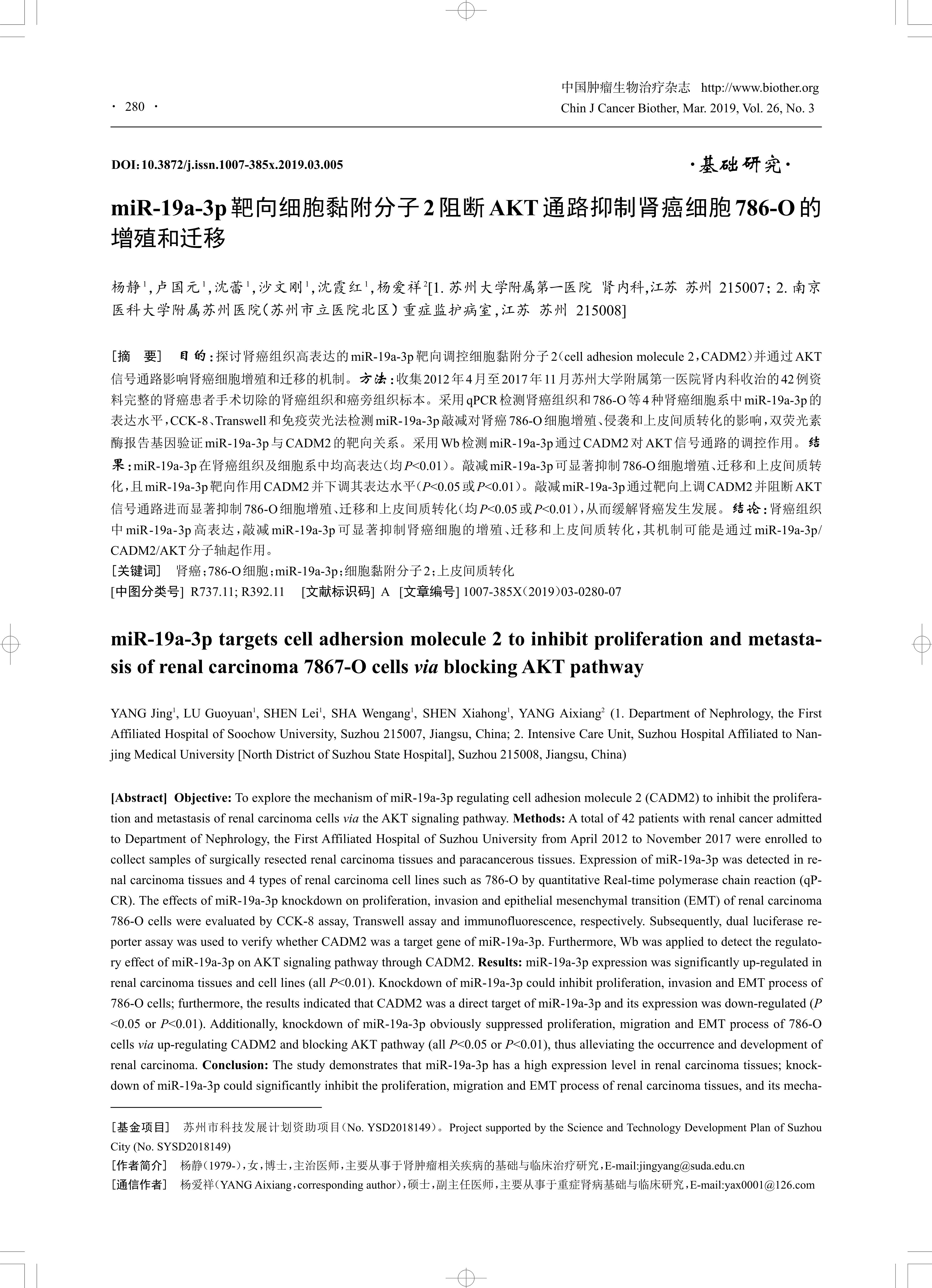 [Abstract] Objective: To explore the mechanism of miR-19a-3p regulating cell adhesion molecule 2 (CADM2) to inhibit the proliferation and metastasis of renal carcinoma cells via the AKT signaling pathway. Methods: A total of 42 patients with renal cancer admitted to Department of Nephrology, the First Affiliated Hospital of Suzhou University from April 2012 to November 2017 were enrolled to collect samples of surgically resected renal carcinoma tissues and paracancerous tissues. Expression of miR-19a-3p was detected in renal carcinoma tissues and 4 types of renal carcinoma cell lines such as 786-O by quantitative Real-time polymerase chain reaction (qPCR).The effects of miR-19a-3p knockdown on proliferation, invasion and epithelial mesenchymal transition (EMT) of renal carcinoma 786-O cells were evaluated by CCK-8 assay, Transwell assay and immunofluorescence, respectively. Subsequently, dual luciferase reporter assay was used to verify whether CADM2 was a target gene of miR-19a-3p. Furthermore, Wb was applied to detect the regulatory effect of miR-19a-3p on AKT signaling pathway through CADM2. Results: miR-19a-3p expression was significantly up-regulated in renal carcinoma tissues and cell lines (all P<0.01). Knockdown of miR-19a-3p could inhibit proliferation, invasion and EMT process of 786-O cells; furthermore, the results indicated that CADM2 was a direct target of miR-19a-3p and its expression was down-regulated (P<0.05 or P<0.01). Additionally, knockdown of miR-19a-3p obviously suppressed proliferation, migration and EMT process of 786-O cells via up-regulating CADM2 and blocking AKT pathway (all P<0.05 or P<0.01), thus alleviating the occurrence and development of renal carcinoma. Conclusion: The study demonstrates that miR-19a-3p has a high expression level in renal carcinoma tissues; knockdown of miR-19a-3p could significantly inhibit the proliferation, migration and EMT process of renal carcinoma tissues, and its mecha-nism may be associated with miR-19a-3p/CADM2/AKT axis.