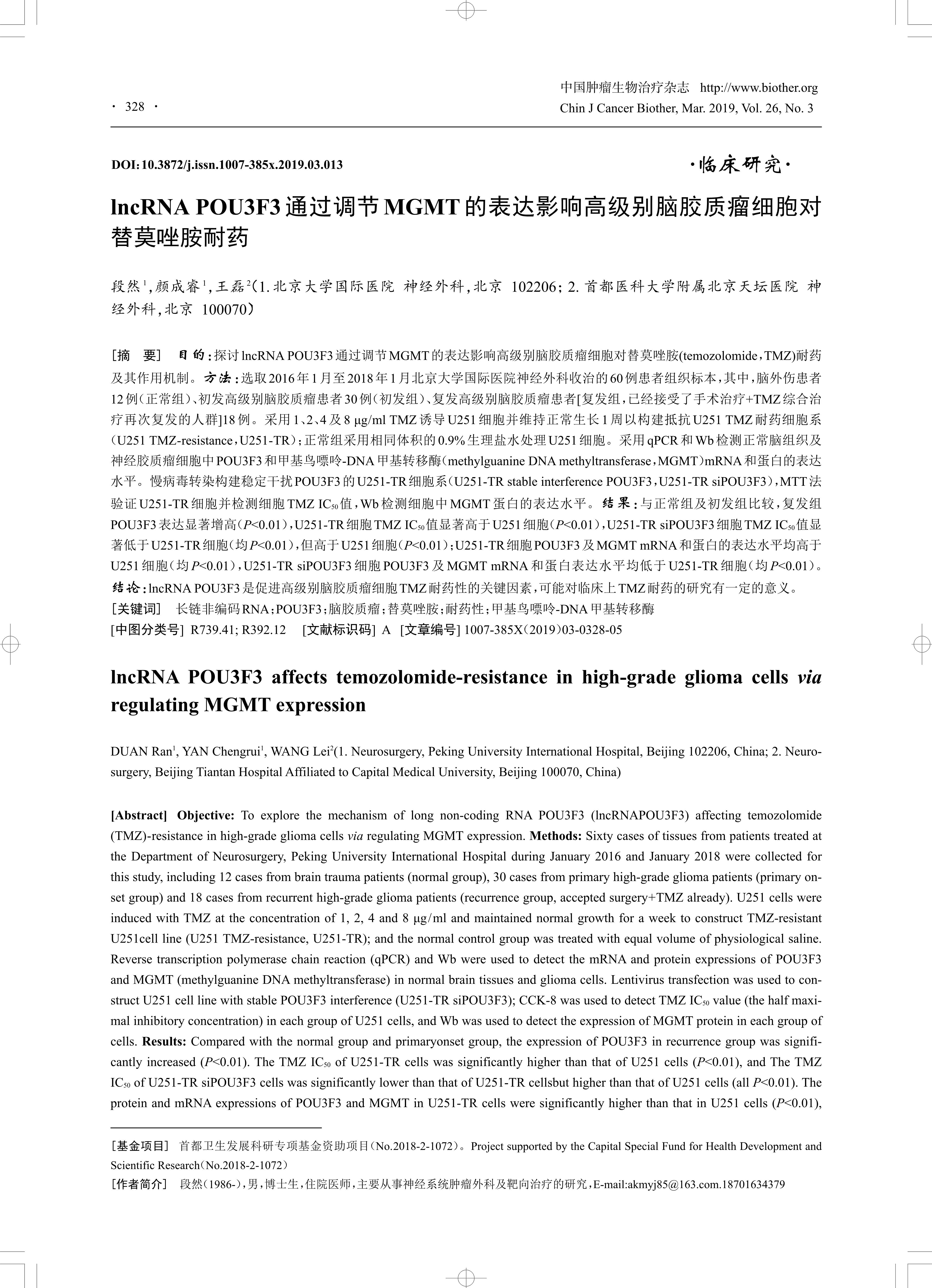 [摘要] 目的:探讨lncRNA POU3F3 通过调节MGMT的表达影响高级别脑胶质瘤细胞对替莫唑胺(temozolomide,TMZ)耐药及其作用机制。方法:选取2016 年1 月至2018 年1 月北京大学国际医院神经外科收治的60 例患者组织标本,其中,脑外伤患者12 例(正常组)、初发高级别脑胶质瘤患者30 例(初发组)、复发高级别脑胶质瘤患者[复发组,已经接受了手术治疗+TMZ综合治疗再次复发的人群]18 例。采用1、2、4 及8 μg/ml TMZ诱导U251 细胞并维持正常生长1 周以构建抵抗U251 TMZ耐药细胞系(U251 TMZ-resistance,U251-TR);正常组采用相同体积的0.9%生理盐水处理U251 细胞。采用qPCR和Wb检测正常脑组织及神经胶质瘤细胞中POU3F3 和甲基鸟嘌呤-DNA甲基转移酶(methylguanine DNA methyltransferase,MGMT)mRNA和蛋白的表达水平。慢病毒转染构建稳定干扰POU3F3 的U251-TR细胞系(U251-TR stable interference POU3F3,U251-TR siPOU3F3),MTT法验证U251-TR 细胞并检测细胞TMZ IC50值,Wb检测细胞中MGMT蛋白的表达水平。结果:与正常组及初发组比较,复发组POU3F3 表达显著增高(P<0.01),U251-TR细胞TMZ IC50值显著高于U251 细胞(P<0.01),U251-TR siPOU3F3 细胞TMZ IC50值显著低于U251-TR细胞(均P<0.01),但高于U251 细胞(P<0.01);U251-TR细胞POU3F3 及MGMT mRNA和蛋白的表达水平均高于U251 细胞(均P<0.01),U251-TR siPOU3F3 细胞POU3F3 及MGMT mRNA和蛋白表达水平均低于U251-TR 细胞(均P<0.01)。结论:lncRNA POU3F3 是促进高级别脑胶质瘤细胞TMZ耐药性的关键因素,可能对临床上TMZ耐药的研究有一定的意义。
