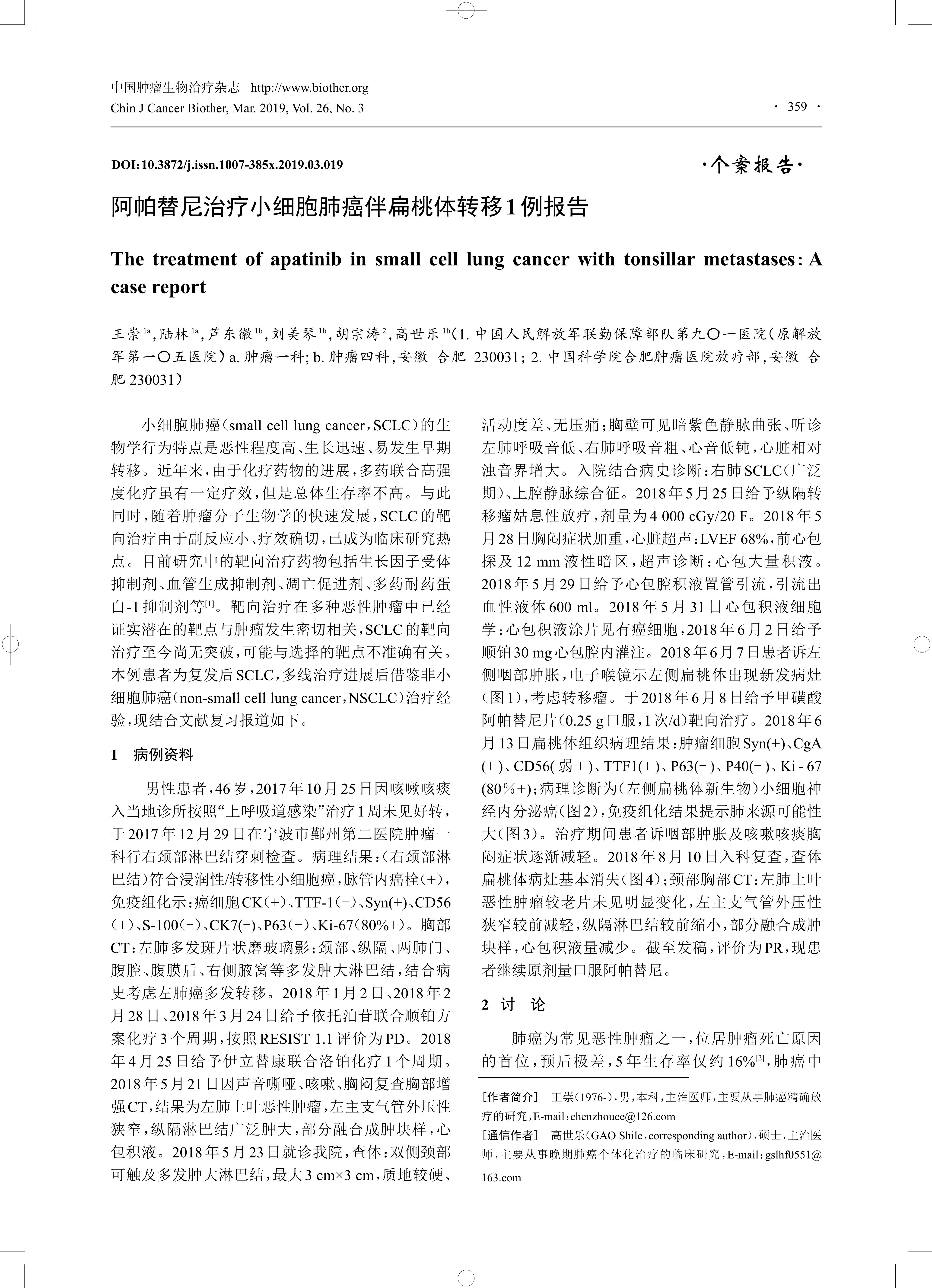 王崇a,陆林a,芦东徽b,等, et al. 阿帕替尼治疗小细胞肺癌伴扁桃体转移1 例报告[J].中国肿瘤生物治疗杂志, 2019, 26(3): 359-361. DOI:10.3872/j. issn.1007-385X.2019.03.019.