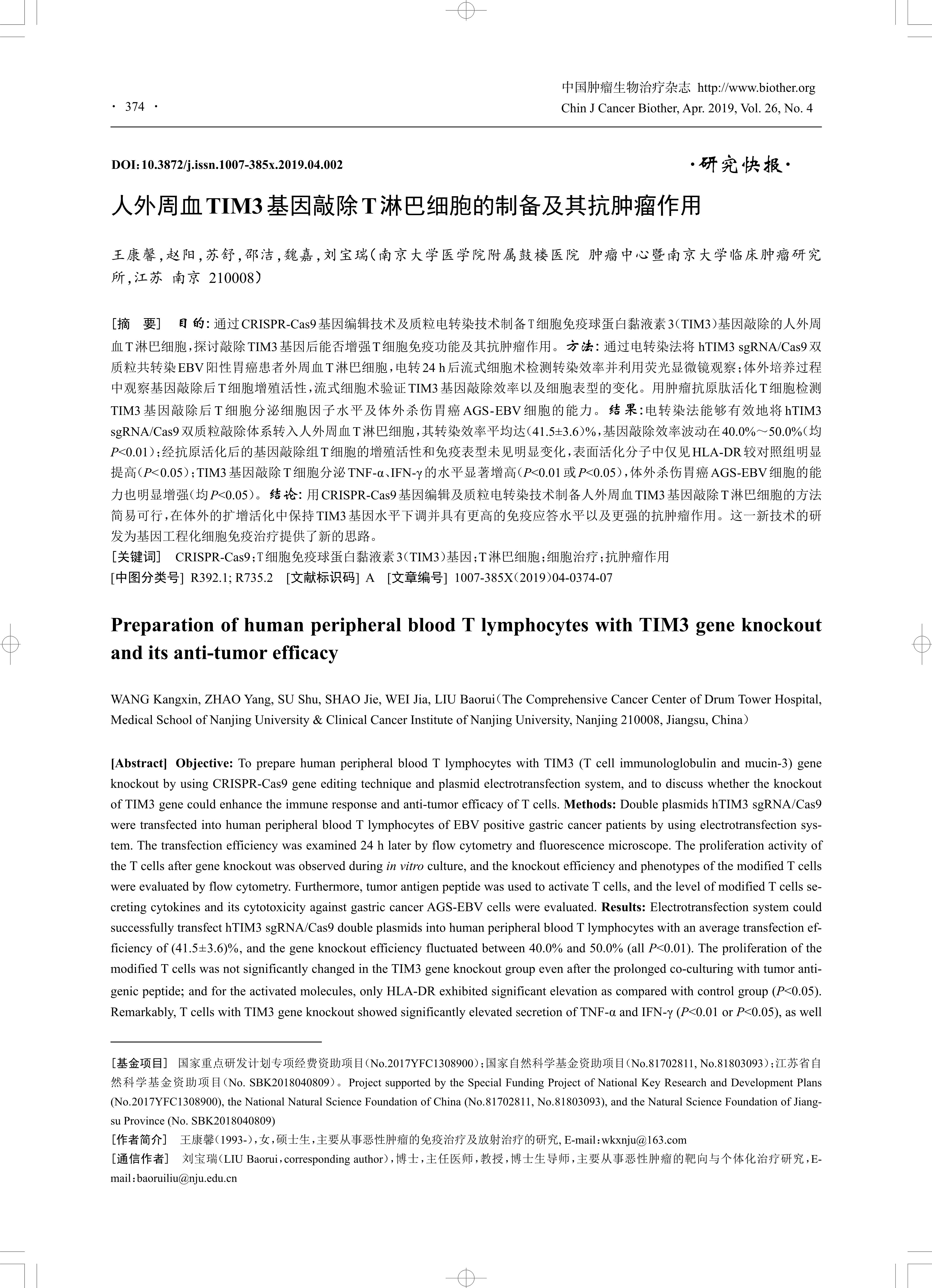 [Abstract] Objective: To prepare human peripheral blood T lymphocytes with TIM3 (T cell immunologlobulin and mucin-3) gene knockout by using CRISPR-Cas9 gene editing technique and plasmid electrotransfection system, and to discuss whether the knockout of TIM3 gene could enhance the immune response and anti-tumor efficacy of T cells. Methods: Double plasmids hTIM3 sgRNA/Cas9 were transfected into human peripheral blood T lymphocytes of EBV positive gastric cancer patients by using electrotransfection system.The transfection efficiency was examined 24 h later by flow cytometry and fluorescence microscope. The proliferation activity of the T cells after gene knockout was observed during in vitro culture, and the knockout efficiency and phenotypes of the modified T cells were evaluated by flow cytometry. Furthermore, tumor antigen peptide was used to activate T cells, and the level of modified T cells secreting cytokines and its cytotoxicity against gastric cancer AGS-EBV cells were evaluated. Results: Electrotransfection system could successfully transfect hTIM3 sgRNA/Cas9 double plasmids into human peripheral blood T lymphocytes with an average transfection efficiency of (41.5±3.6)%, and the gene knockout efficiency fluctuated between 40.0% and 50.0% (all P<0.01). The proliferation of the modified T cells was not significantly changed in the TIM3 gene knockout group even after the prolonged co-culturing with tumor antigenicpeptide; and for the activated molecules, only HLA-DR exhibited significant elevation as compared with control group (P<0.05).Remarkably, T cells with TIM3 gene knockout showed significantly elevated secretion of TNF-α and IFN-γ (P<0.01 or P<0.05), as well as obviously enhanced in vitro cytotoxicity against gastric cancer AGS-EBV cells (P<0.05). Conclusion: It’s simple and feasible of CRISPR-Cas9 gene editing technique and plasmid electrotransfection system to prepare T lymphocytes with engineered TIM3 gene knockout. The expression level of TIM3 was down-regulated in in vitro culture. More importantly, the modified T cells performed superior immune response and cytotoxicity, which may provide a new idea for gene engineering cell immunotherapy.