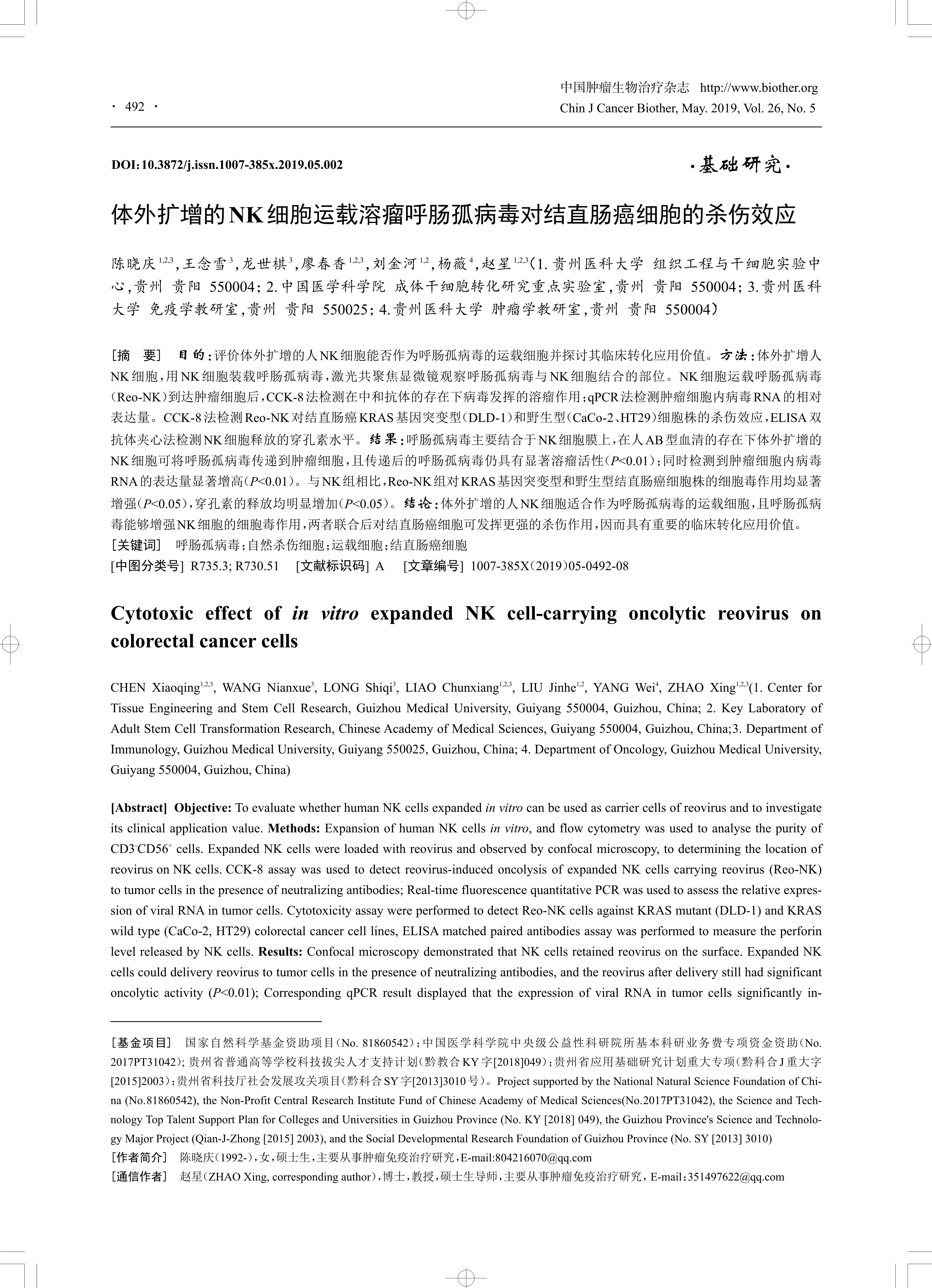 [Abstract] Objective: To evaluate whether human NK cells expanded in vitro can be used as carrier cells of reovirus and to investigate its clinical application value. Methods: Expansion of human NK cells in vitro, and flow cytometry was used to analyse the purity of CD3-CD56+ cells. Expanded NK cells were loaded with reovirus and observed by confocal microscopy, to determining the location of reovirus on NK cells. CCK-8 assay was used to detect reovirus-induced oncolysis of expanded NK cells carrying reovirus (Reo-NK)to tumor cells in the presence of neutralizing antibodies; Real-time fluorescence quantitative PCR was used to assess the relative expression of viral RNA in tumor cells. Cytotoxicity assay were performed to detect Reo-NK cells against KRAS mutant (DLD-1) and KRAS wild type (CaCo-2, HT29) colorectal cancer cell lines, ELISA matched paired antibodies assay was performed to measure the perforin level released by NK cells. Results: Confocal microscopy demonstrated that NK cells retained reovirus on the surface. Expanded NK cells could delivery reovirus to tumor cells in the presence of neutralizing antibodies, and the reovirus after delivery still had significant oncolytic activity (P<0.01); Corresponding qPCR result displayed that the expression of viral RNA in tumor cells significantly in-creased over time (P<0.01). Compared with NK group, Reo-NK group evidently enhanced the cytotoxicity on colorectal cancer cell lines with both KRAS gene mutant and wild (all P<0.05), and significantly increased the release of perforin (all P<0.05). Conclusion:In vitro expanded NK cells provide a convincing cell carrier for reovirus, while reovirus enhances the cytotoxicity of NK cells, and the combination of the two show a stronger killing effect on colorectal cancer cells,that has important clinical application value.