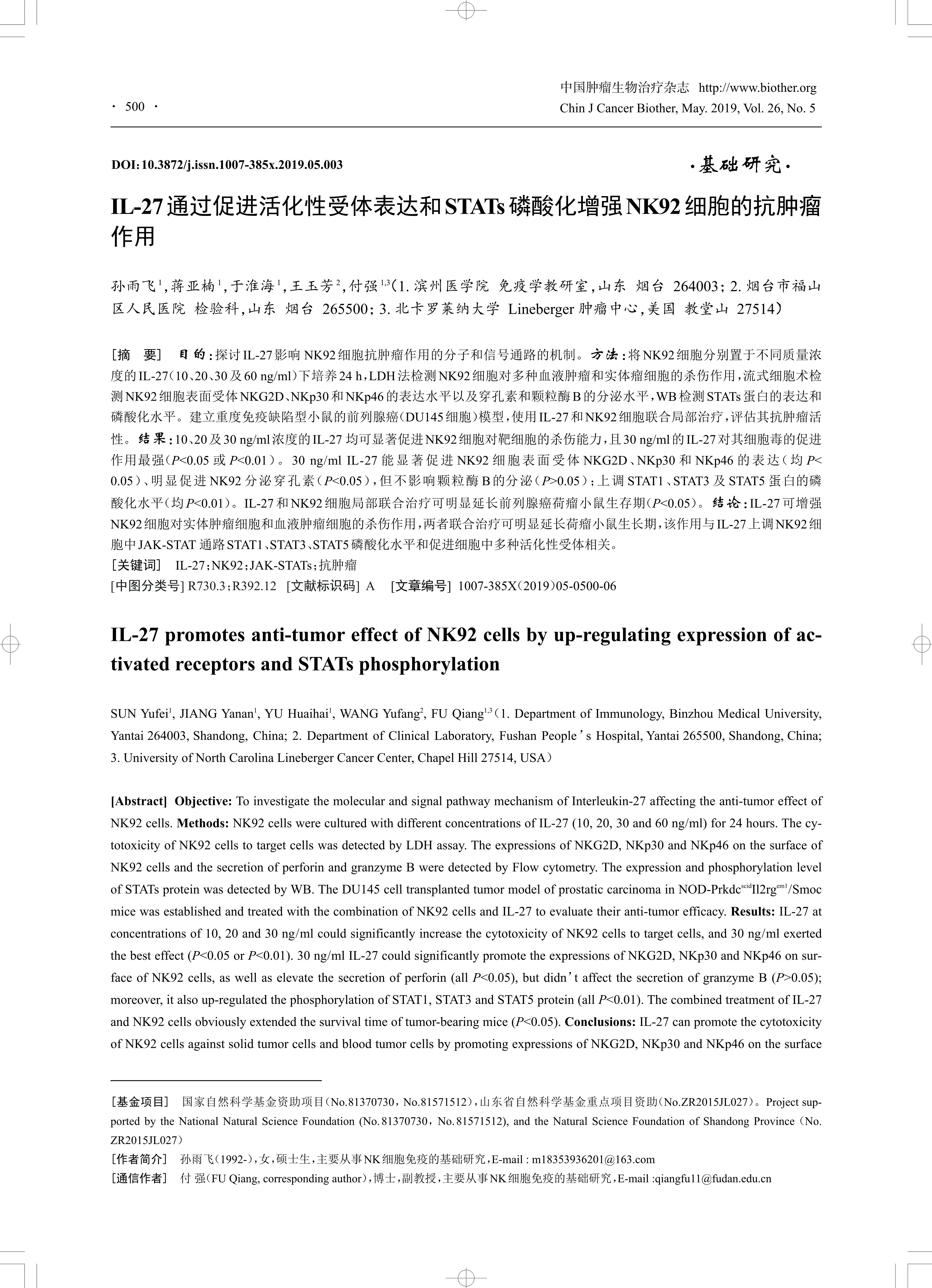 [Abstract] Objective: To investigate the molecular and signal pathway mechanism of Interleukin-27 affecting the anti-tumor effect of NK92 cells. Methods: NK92 cells were cultured with different concentrations of IL-27 (10, 20, 30 and 60 ng/ml) for 24 hours. The cytotoxicity of NK92 cells to target cells was detected by LDH assay. The expressions of NKG2D, NKp30 and NKp46 on the surface of NK92 cells and the secretion of perforin and granzyme B were detected by Flow cytometry. The expression and phosphorylation level of STATs protein was detected by WB. The DU145 cell transplanted tumor model of prostatic carcinoma in NOD-PrkdcscidIl2rgem1/Smoc mice was established and treated with the combination of NK92 cells and IL-27 to evaluate their anti-tumor efficacy. Results: IL-27 at concentrations of 10, 20 and 30 ng/ml could significantly increase the cytotoxicity of NK92 cells to target cells, and 30 ng/ml exerted the best effect (P<0.05 or P<0.01). 30 ng/ml IL-27 could significantly promote the expressions of NKG2D, NKp30 and NKp46 on surface of NK92 cells, as well as elevate the secretion of perforin (all P<0.05), but didn’t affect the secretion of granzyme B (P>0.05);moreover, it also up-regulated the phosphorylation of STAT1, STAT3 and STAT5 protein (all P<0.01). The combined treatment of IL-27 and NK92 cells obviously extended the survival time of tumor-bearing mice (P<0.05). Conclusions: IL-27 can promote the cytotoxicity of NK92 cells against solid tumor cells and blood tumor cells by promoting expressions of NKG2D, NKp30 and NKp46 on the surface of NK92 cells and the secretion of perforin, which might be related with the phosphorylation of STAT1, STAT3 and STAT5 in JAKSTAT pathway.