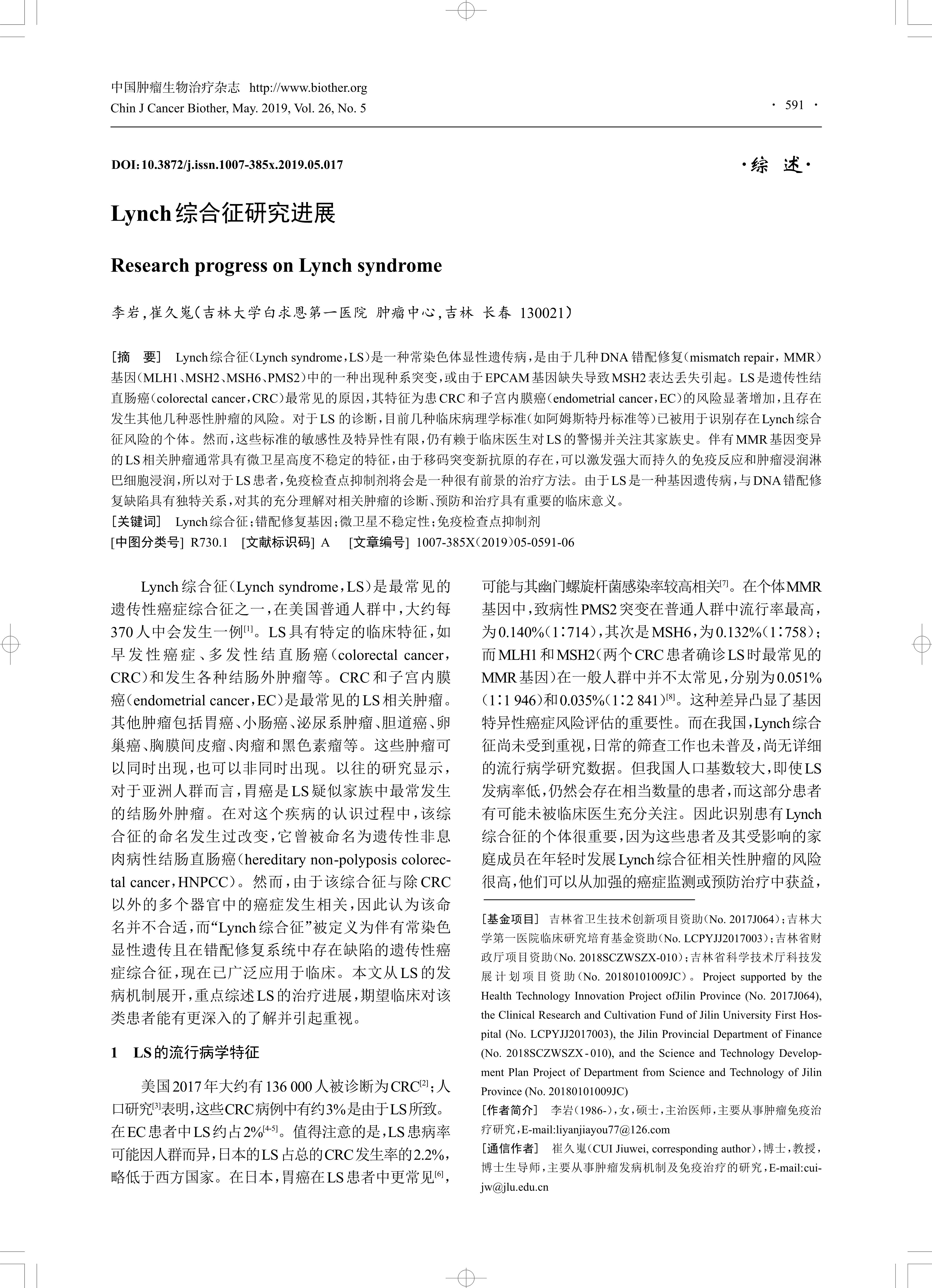 [摘要] Lynch 综合征(Lynch syndrome,LS)是一种常染色体显性遗传病,是由于几种DNA 错配修复(mismatch repair,MMR)基因(MLH1、MSH2、MSH6、PMS2)中的一种出现种系突变,或由于EPCAM基因缺失导致MSH2 表达丢失引起。LS是遗传性结直肠癌(colorectal cancer,CRC)最常见的原因,其特征为患CRC和子宫内膜癌(endometrial cancer,EC)的风险显著增加,且存在发生其他几种恶性肿瘤的风险。对于LS 的诊断,目前几种临床病理学标准(如阿姆斯特丹标准等)已被用于识别存在Lynch 综合征风险的个体。然而,这些标准的敏感性及特异性有限,仍有赖于临床医生对LS的警惕并关注其家族史。伴有MMR基因变异的LS相关肿瘤通常具有微卫星高度不稳定的特征,由于移码突变新抗原的存在,可以激发强大而持久的免疫反应和肿瘤浸润淋巴细胞浸润,所以对于LS患者,免疫检查点抑制剂将会是一种很有前景的治疗方法。由于LS是一种基因遗传病,与DNA错配修复缺陷具有独特关系,对其的充分理解对相关肿瘤的诊断、预防和治疗具有重要的临床意义。