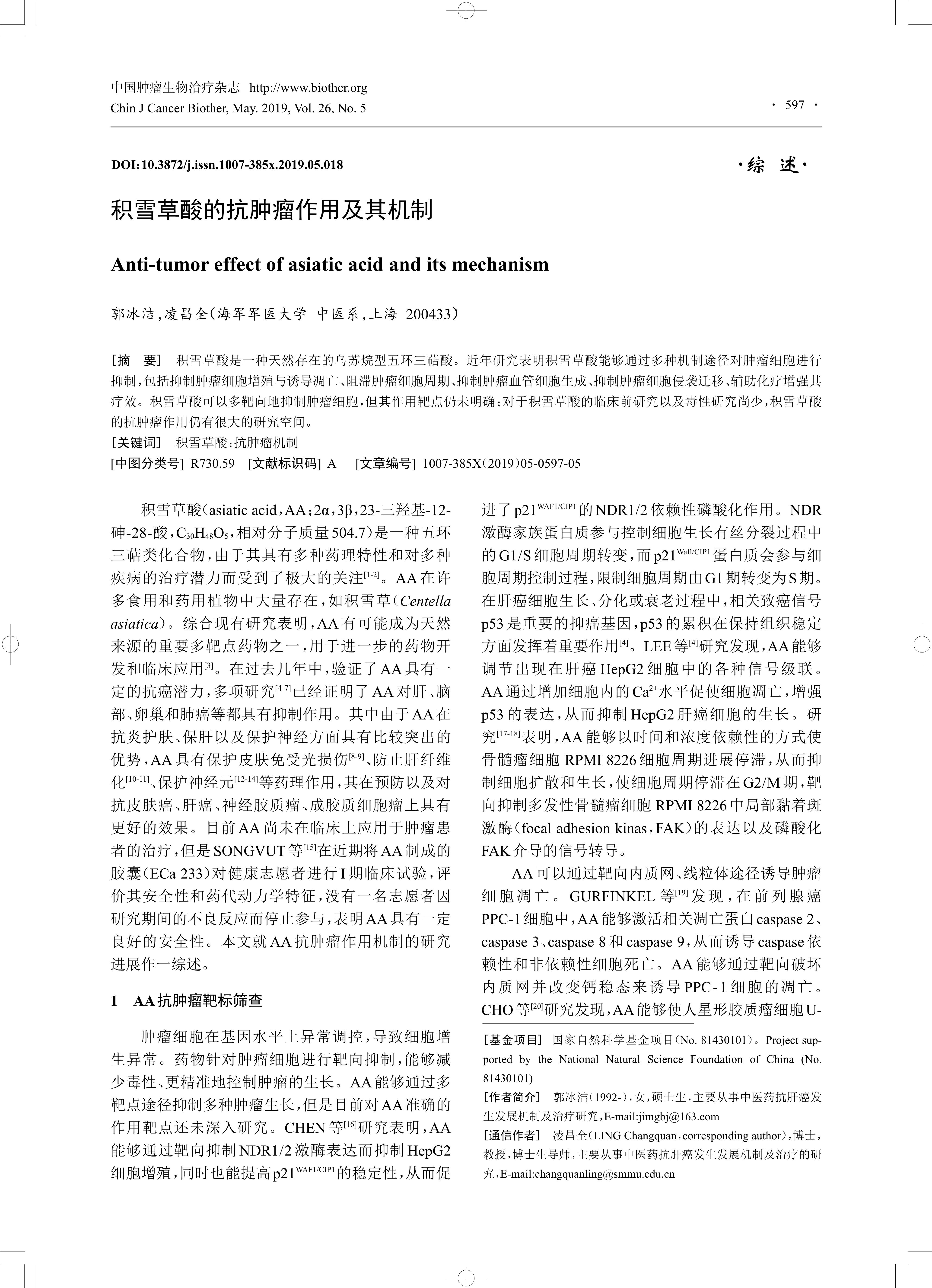 [摘要] 积雪草酸是一种天然存在的乌苏烷型五环三萜酸。近年研究表明积雪草酸能够通过多种机制途径对肿瘤细胞进行抑制,包括抑制肿瘤细胞增殖与诱导凋亡、阻滞肿瘤细胞周期、抑制肿瘤血管细胞生成、抑制肿瘤细胞侵袭迁移、辅助化疗增强其疗效。积雪草酸可以多靶向地抑制肿瘤细胞,但其作用靶点仍未明确;对于积雪草酸的临床前研究以及毒性研究尚少,积雪草酸的抗肿瘤作用仍有很大的研究空间。