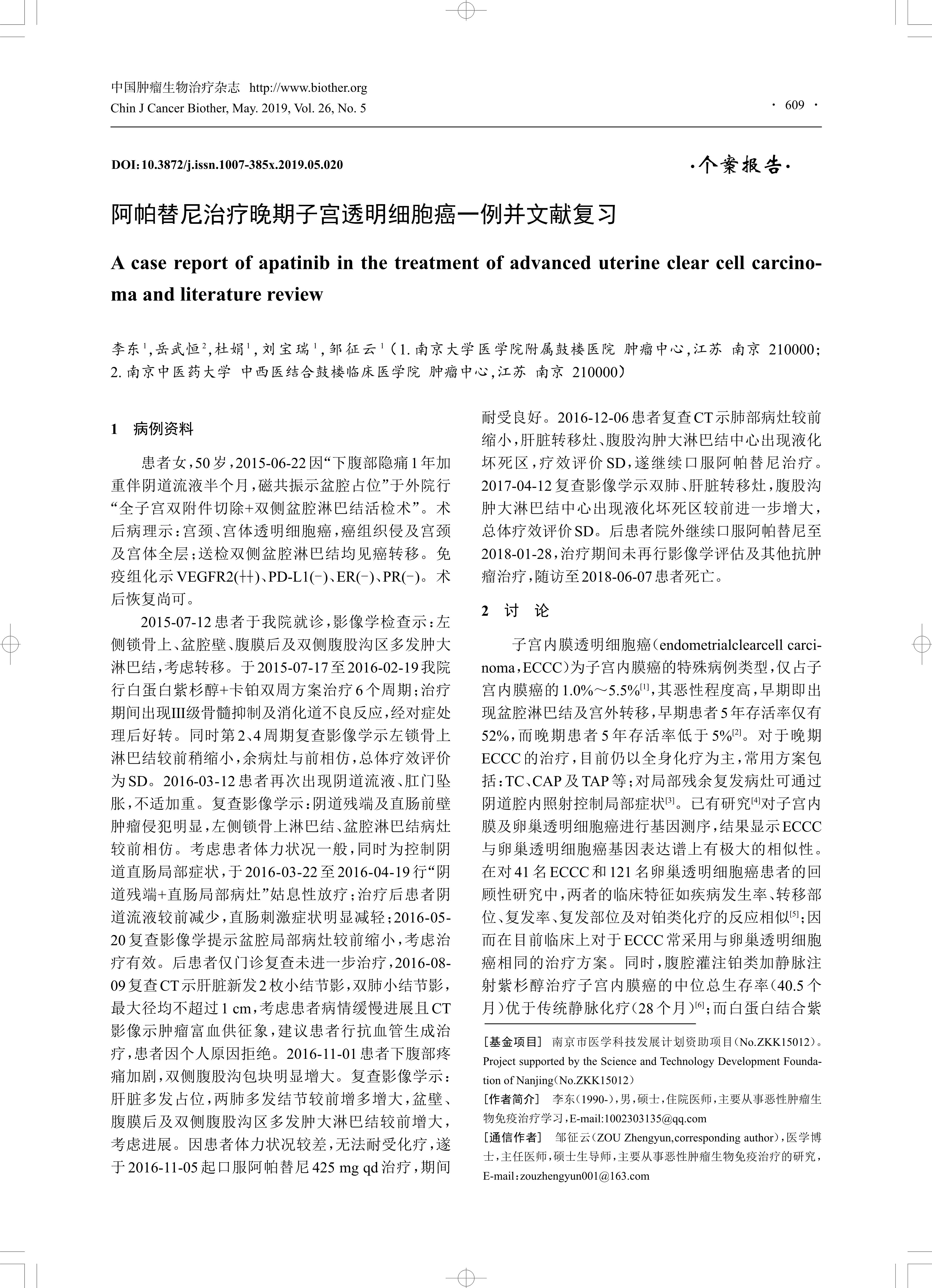 李东,岳武恒,杜娟,等, et al. 阿帕替尼治疗晚期子宫透明细胞癌一例并文献复习[J].中国肿瘤生物治疗杂志, 2019, 26(5): 609-611. DOI:10.3872/j. issn.1007-385X.2019.05.020.