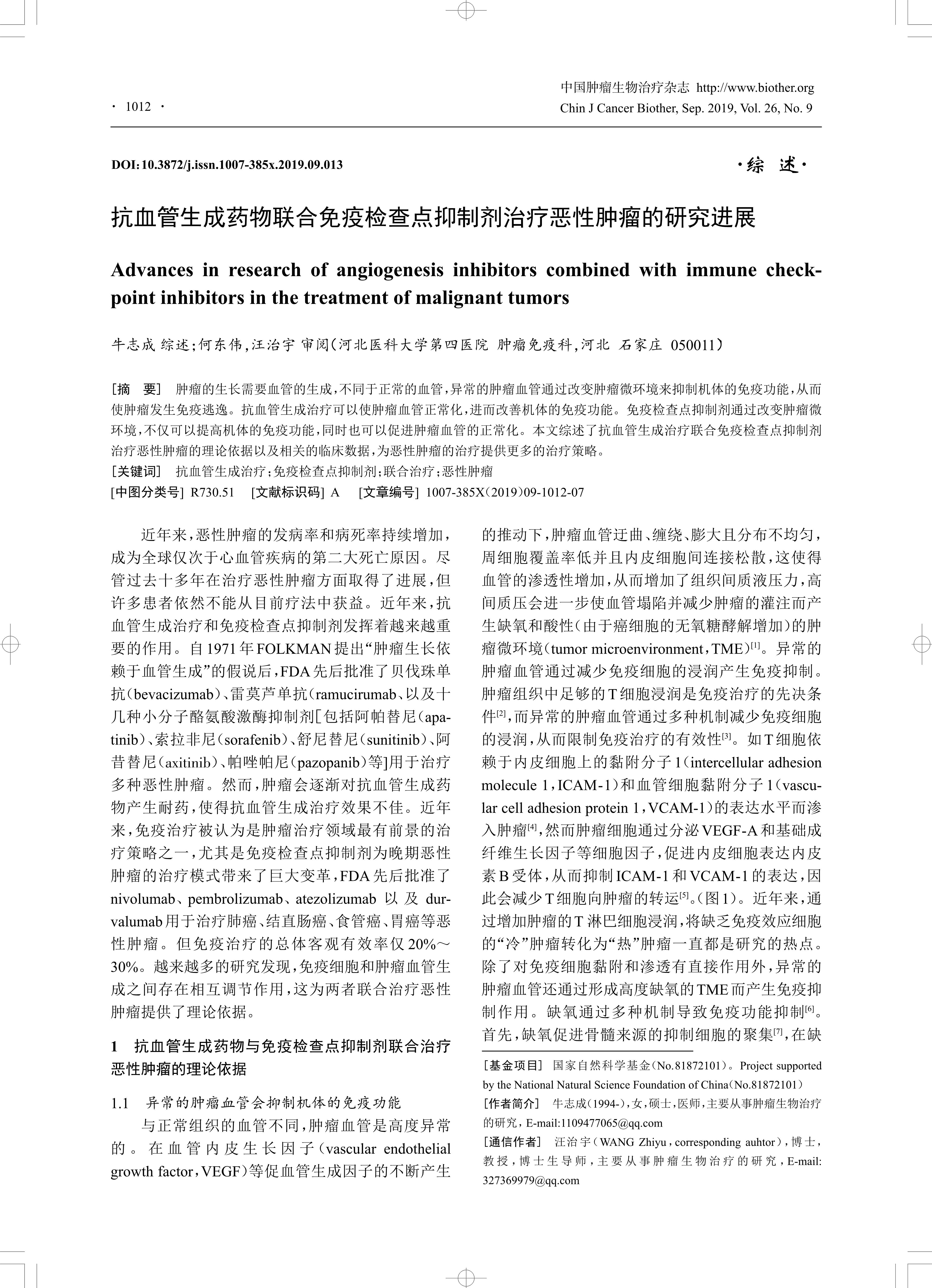 [摘要] 肿瘤的生长需要血管的生成,不同于正常的血管,异常的肿瘤血管通过改变肿瘤微环境来抑制机体的免疫功能,从而使肿瘤发生免疫逃逸。抗血管生成治疗可以使肿瘤血管正常化,进而改善机体的免疫功能。免疫检查点抑制剂通过改变肿瘤微环境,不仅可以提高机体的免疫功能,同时也可以促进肿瘤血管的正常化。本文综述了抗血管生成治疗联合免疫检查点抑制剂治疗恶性肿瘤的理论依据以及相关的临床数据,为恶性肿瘤的治疗提供更多的治疗策略。