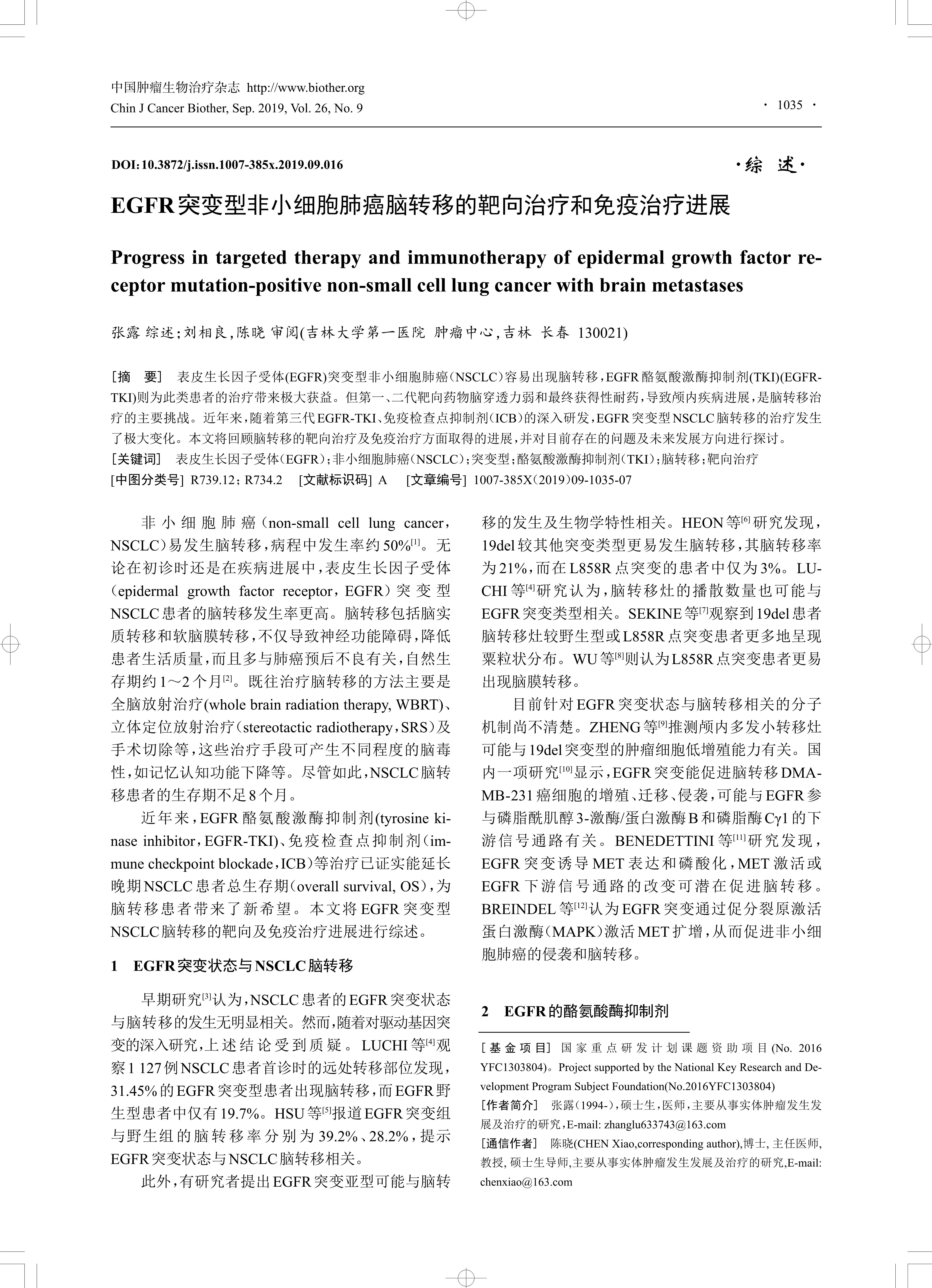 [摘要] 表皮生长因子受体(EGFR)突变型非小细胞肺癌(NSCLC)容易出现脑转移,EGFR 酪氨酸激酶抑制剂(TKI)(EGFRTKI)则为此类患者的治疗带来极大获益。但第一、二代靶向药物脑穿透力弱和最终获得性耐药,导致颅内疾病进展,是脑转移治疗的主要挑战。近年来,随着第三代EGFR-TKI、免疫检查点抑制剂(ICB)的深入研发,EGFR突变型NSCLC脑转移的治疗发生了极大变化。本文将回顾脑转移的靶向治疗及免疫治疗方面取得的进展,并对目前存在的问题及未来发展方向进行探讨。