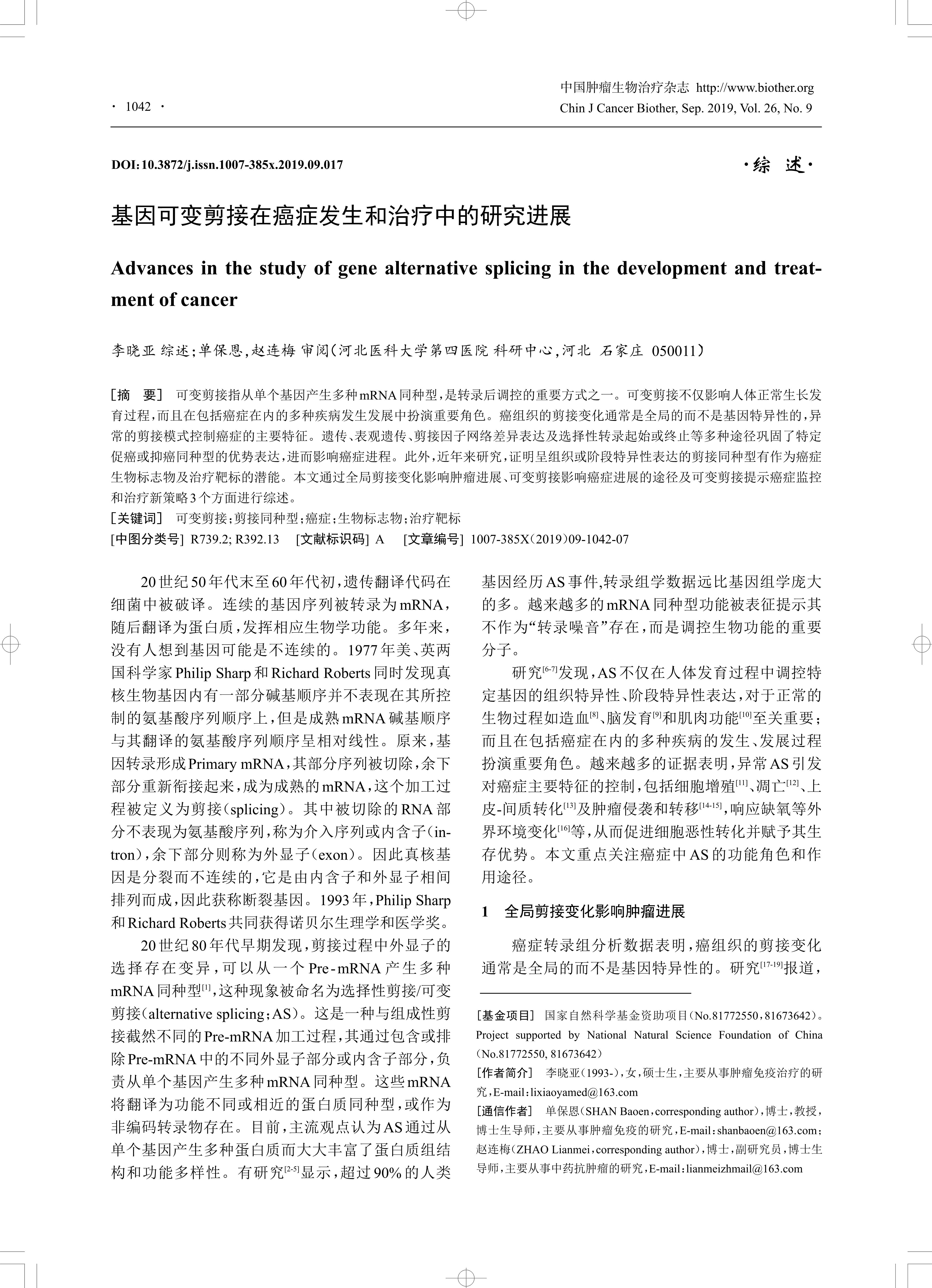 [摘要] 可变剪接指从单个基因产生多种mRNA同种型,是转录后调控的重要方式之一。可变剪接不仅影响人体正常生长发育过程,而且在包括癌症在内的多种疾病发生发展中扮演重要角色。癌组织的剪接变化通常是全局的而不是基因特异性的,异常的剪接模式控制癌症的主要特征。遗传、表观遗传、剪接因子网络差异表达及选择性转录起始或终止等多种途径巩固了特定促癌或抑癌同种型的优势表达,进而影响癌症进程。此外,近年来研究,证明呈组织或阶段特异性表达的剪接同种型有作为癌症生物标志物及治疗靶标的潜能。本文通过全局剪接变化影响肿瘤进展、可变剪接影响癌症进展的途径及可变剪接提示癌症监控和治疗新策略3 个方面进行综述。