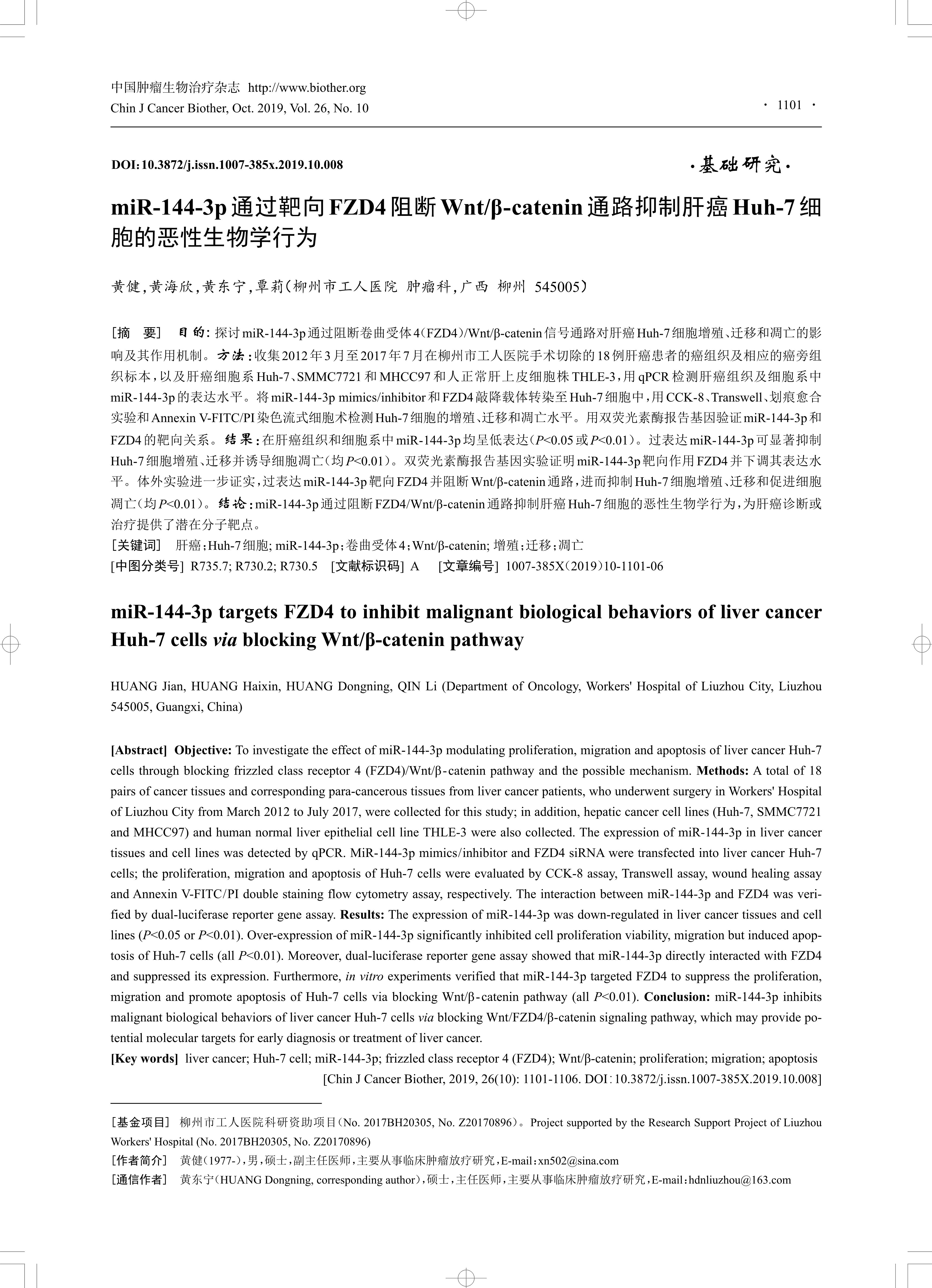 [Abstract] Objective: To investigate the effect of miR-144-3p modulating proliferation, migration and apoptosis of liver cancer Huh-7 cells through blocking frizzled class receptor 4 (FZD4)/Wnt/β -catenin pathway and the possible mechanism. Methods: A total of 18 pairs of cancer tissues and corresponding para-cancerous tissues from liver cancer patients, who underwent surgery in Workers' Hospital of Liuzhou City from March 2012 to July 2017, were collected for this study; in addition, hepatic cancer cell lines (Huh-7, SMMC7721 and MHCC97) and human normal liver epithelial cell line THLE-3 were also collected. The expression of miR-144-3p in liver cancer tissues and cell lines was detected by qPCR. MiR-144-3p mimics/inhibitor and FZD4 siRNA were transfected into liver cancer Huh-7 cells; the proliferation, migration and apoptosis of Huh-7 cells were evaluated by CCK-8 assay, Transwell assay, wound healing assay and Annexin V-FITC/PI double staining flow cytometry assay, respectively. The interaction between miR-144-3p and FZD4 was verified by dual-luciferase reporter gene assay. Results: The expression of miR-144-3p was down-regulated in liver cancer tissues and cell lines (P<0.05 or P<0.01). Over-expression of miR-144-3p significantly inhibited cell proliferation viability, migration but induced apoptosis of Huh-7 cells (all P<0.01). Moreover, dual-luciferase reporter gene assay showed that miR-144-3p directly interacted with FZD4 and suppressed its expression. Furthermore, in vitro experiments verified that miR-144-3p targeted FZD4 to suppress the proliferation,migration and promote apoptosis of Huh-7 cells via blocking Wnt/β -catenin pathway (all P<0.01). Conclusion: miR-144-3p inhibits malignant biological behaviors of liver cancer Huh-7 cells via blocking Wnt/FZD4/β-catenin signaling pathway, which may provide potential molecular targets for early diagnosis or treatment of liver cancer.