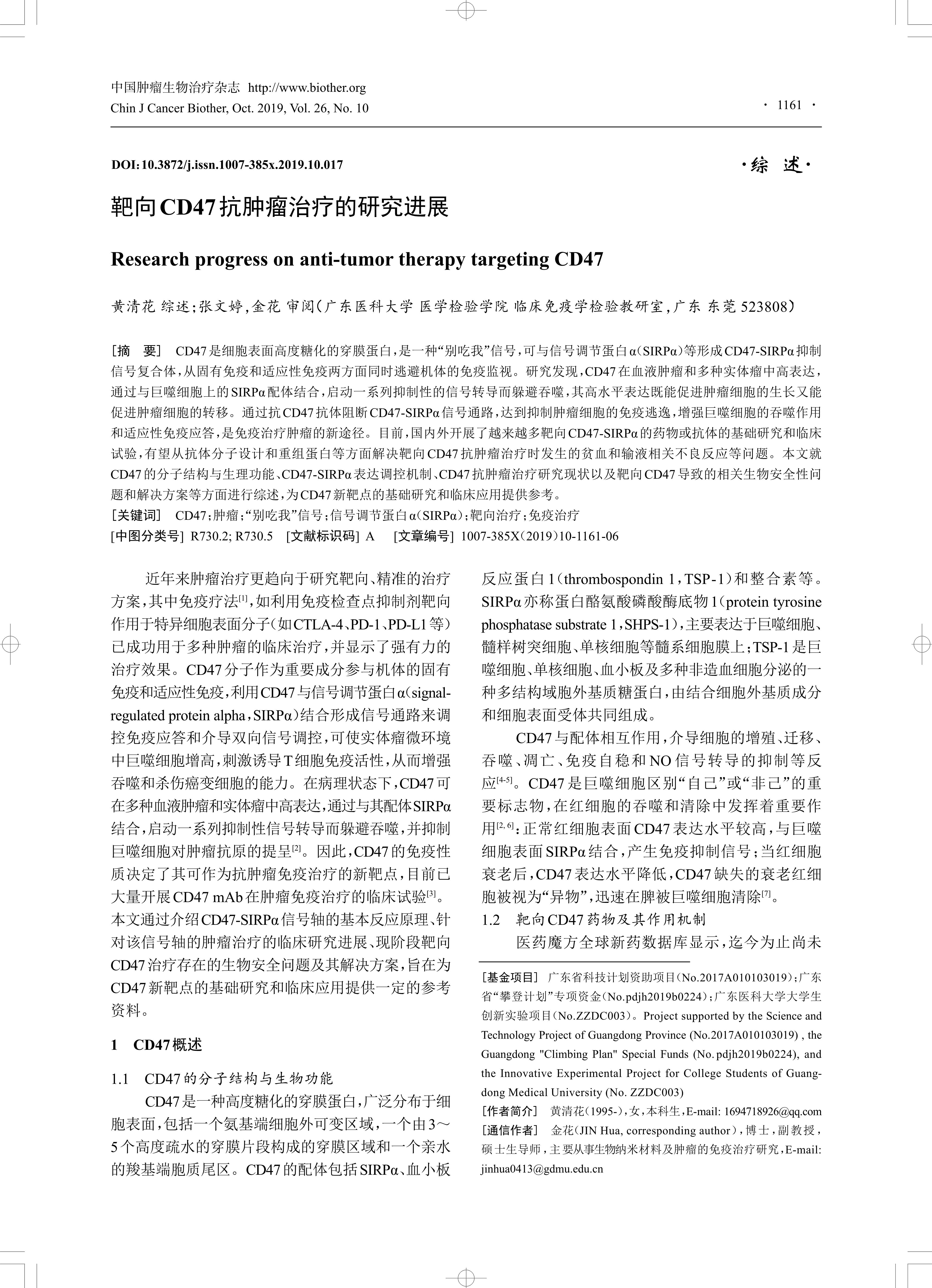 [摘要] CD47 是细胞表面高度糖化的穿膜蛋白,是一种“别吃我”信号,可与信号调节蛋白α(SIRPα)等形成CD47-SIRPα 抑制信号复合体,从固有免疫和适应性免疫两方面同时逃避机体的免疫监视。研究发现,CD47 在血液肿瘤和多种实体瘤中高表达,通过与巨噬细胞上的SIRPα 配体结合,启动一系列抑制性的信号转导而躲避吞噬,其高水平表达既能促进肿瘤细胞的生长又能促进肿瘤细胞的转移。通过抗CD47 抗体阻断CD47-SIRPα 信号通路,达到抑制肿瘤细胞的免疫逃逸,增强巨噬细胞的吞噬作用和适应性免疫应答,是免疫治疗肿瘤的新途径。目前,国内外开展了越来越多靶向CD47-SIRPα 的药物或抗体的基础研究和临床试验,有望从抗体分子设计和重组蛋白等方面解决靶向CD47 抗肿瘤治疗时发生的贫血和输液相关不良反应等问题。本文就CD47 的分子结构与生理功能、CD47-SIRPα 表达调控机制、CD47 抗肿瘤治疗研究现状以及靶向CD47 导致的相关生物安全性问题和解决方案等方面进行综述,为CD47新靶点的基础研究和临床应用提供参考。