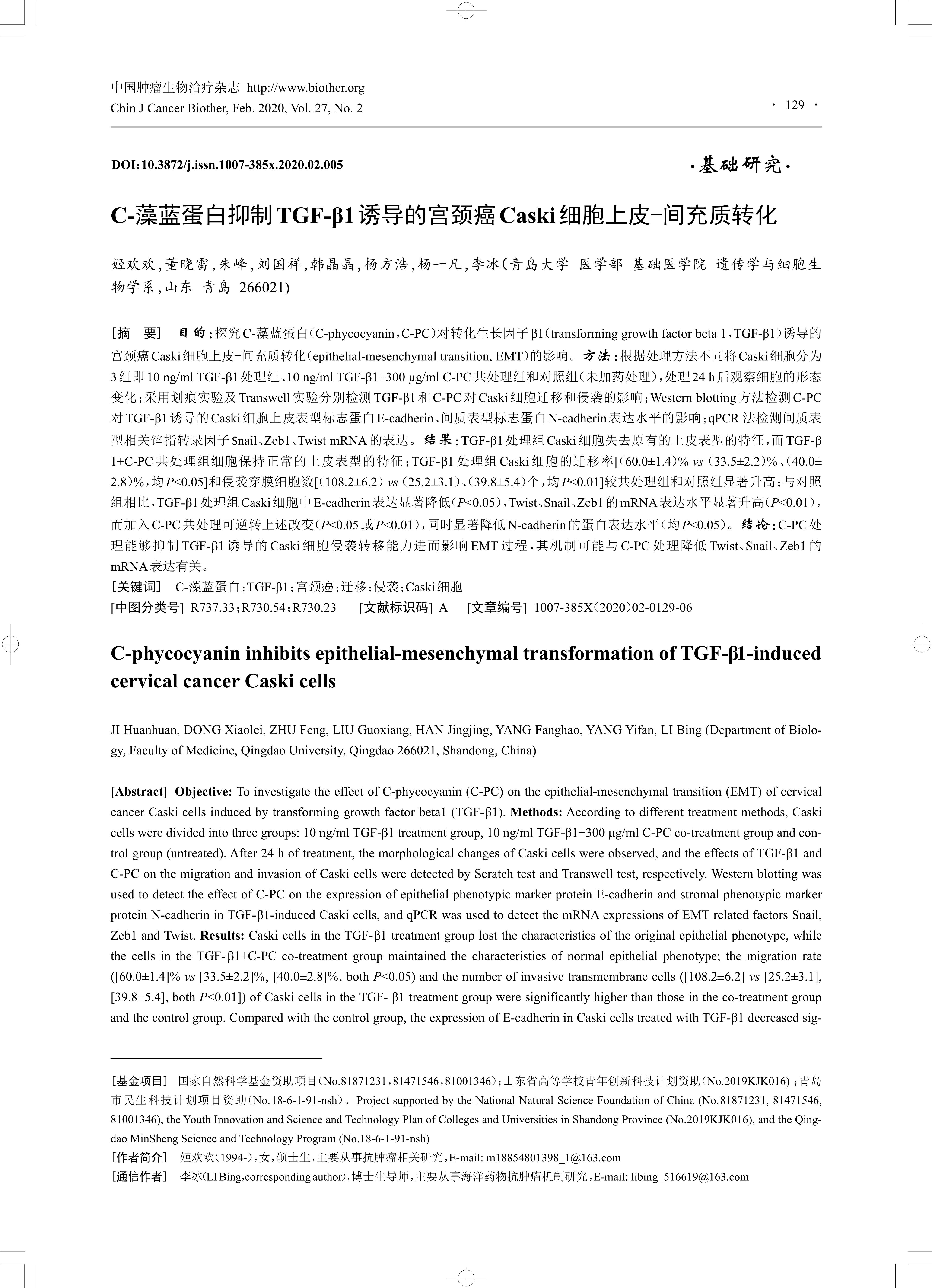 目的:探究C-藻蓝蛋白(C-phycocyanin,C-PC)对转化生长因子β1(transforming growth factor beta 1,TGF-β1)诱导的 宫颈癌Caski细胞上皮-间充质转化(epithelial-mesenchymal transition, EMT)的影响。方法:根据处理方法不同将Caski细胞分为 3组即10 ng/ml TGF-β1处理组、 10 ng/ml TGF-β1+300 μg/ml C-PC共处理组和对照组(未加药处理),处理24 h后观察细胞的形态 变化;采用划痕实验及Transwell实验分别检测TGF-β1和C-PC对Caski细胞迁移和侵袭的影响;Western blotting方法检测C-PC 对TGF-β1诱导的Caski细胞上皮表型标志蛋白E-cadherin、间质表型标志蛋白N-cadherin表达水平的影响;qPCR 法检测间质表 型相关锌指转录因子Snail、Zeb1、Twist mRNA的表达。结果:TGF-β1处理组Caski细胞失去原有的上皮表型的特征, 而TGF-β 1+C-PC共处理组细胞保持正常的上皮表型的特征;TGF-β1处理组Caski细胞的迁移率[(60.0±1.4) % vs(33.5±2.2) %、(40.0± 2.8) %, 均P<0.05]和侵袭穿膜细胞数[(108.2±6.2)vs(25.2±3.1)、(39.8±5.4)个, 均P<0.01]较共处理组和对照组显著升高;与对照 组相比,TGF-β1处理组Caski细胞中E-cadherin表达显著降低(P<0.05),Twist、Snail、Zeb1的mRNA表达水平显著升高(P<0.01), 而加入C-PC共处理可逆转上述改变(P<0.05或P<0.01),同时显著降低N-cadherin的蛋白表达水平(均P<0.05)。结论:C-PC处 理能够抑制TGF-β1诱导的Caski细胞侵袭转移能力进而影响EMT过程,其机制可能与C-PC处理降低Twist、Snail、Zeb1的 mRNA表达有关。