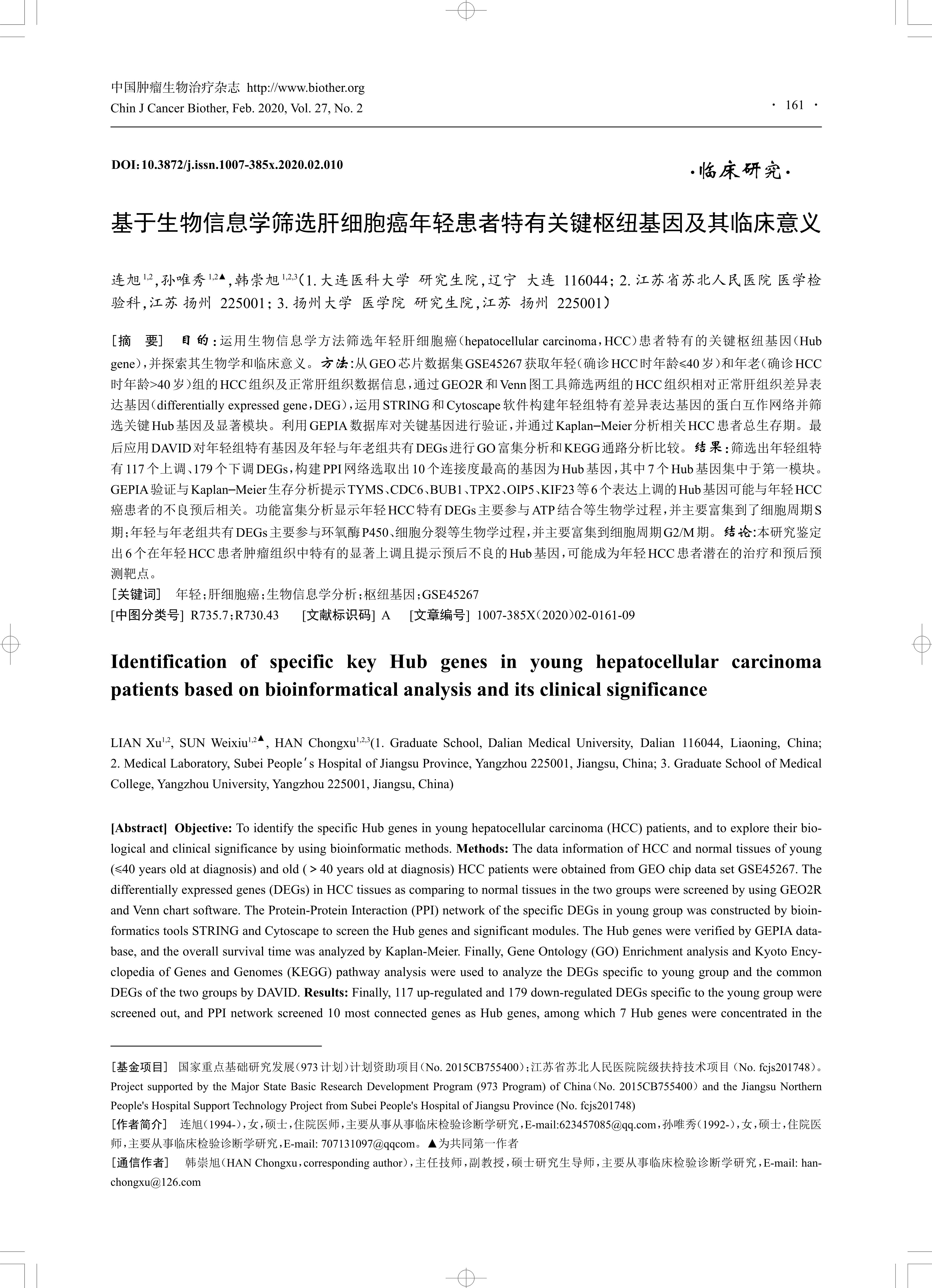 目的:运用生物信息学方法筛选年轻肝细胞癌(hepatocellular carcinoma,HCC)患者特有的关键枢纽基因(Hub gene),并探索其生物学和临床意义。方法:从GEO芯片数据集GSE45267获取年轻(确诊HCC时年龄≤40岁)和年老(确诊HCC 时年龄>40岁)组的HCC组织及正常肝组织数据信息,通过GEO2R和Venn图工具筛选两组的HCC组织相对正常肝组织差异表 达基因(differentially expressed gene,DEG),运用STRING和Cytoscape软件构建年轻组特有差异表达基因的蛋白互作网络并筛 选关键Hub基因及显著模块。利用GEPIA数据库对关键基因进行验证,并通过Kaplan–Meier分析相关HCC患者总生存期。最 后应用DAVID对年轻组特有基因及年轻与年老组共有DEGs进行GO富集分析和KEGG通路分析比较。结果:筛选出年轻组特 有117个上调、179个下调DEGs,构建PPI网络选取出10个连接度最高的基因为Hub基因,其中7个Hub基因集中于第一模块。 GEPIA验证与Kaplan–Meier生存分析提示TYMS、CDC6、BUB1、TPX2、OIP5、KIF23等6个表达上调的Hub基因可能与年轻HCC 癌患者的不良预后相关。功能富集分析显示年轻HCC特有DEGs主要参与ATP结合等生物学过程,并主要富集到了细胞周期S 期;年轻与年老组共有DEGs主要参与环氧酶P450、细胞分裂等生物学过程,并主要富集到细胞周期G2/M期。结论:本研究鉴定 出6个在年轻HCC患者肿瘤组织中特有的显著上调且提示预后不良的Hub基因,可能成为年轻HCC患者潜在的治疗和预后预 测靶点。