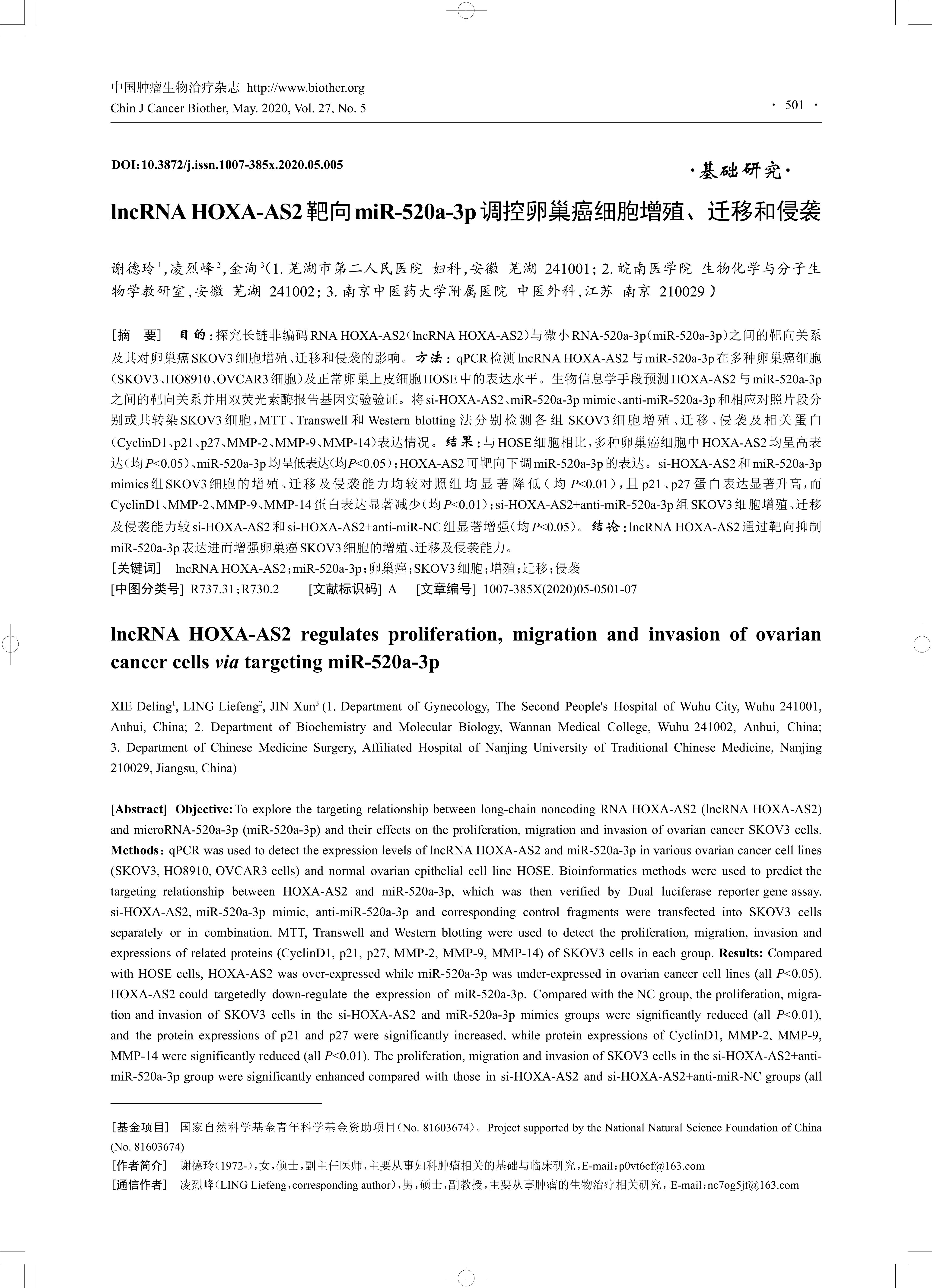 目的:探究长链非编码RNA HOXA-AS2(lncRNA HOXA-AS2)与微小RNA-520a-3p(miR-520a-3p)之间的靶向关系及其对卵巢癌SKOV3 细胞增殖、迁移和侵袭的影响。方法:qPCR检测lncRNA HOXA-AS2 与miR-520a-3p 在多种卵巢癌细胞(SKOV3、HO8910、OVCAR3 细胞)及正常卵巢上皮细胞HOSE中的表达水平。生物信息学手段预测HOXA-AS2 与miR-520a-3p之间的靶向关系并用双荧光素酶报告基因实验验证。将si-HOXA-AS2、miR-520a-3p mimic、anti-miR-520a-3p 和相应对照片段分别或共转染SKOV3 细胞,MTT、Transwell 和Western blotting 法分别检测各组SKOV3 细胞增殖、迁移、侵袭及相关蛋白(CyclinD1、p21、p27、MMP-2、MMP-9、MMP-14)表达情况。结果:与HOSE细胞相比,多种卵巢癌细胞中HOXA-AS2 均呈高表达(均P<0.05)、miR-520a-3p 均呈低表达(均P<0.05);HOXA-AS2 可靶向下调miR-520a-3p 的表达。si-HOXA-AS2 和miR-520a-3p mimics 组SKOV3 细胞的增殖、迁移及侵袭能力均较对照组均显著降低( 均P<0.01),且p21、p27 蛋白表达显著升高,而CyclinD1、MMP-2、MMP-9、MMP-14 蛋白表达显著减少(均P<0.01);si-HOXA-AS2+anti-miR-520a-3p 组SKOV3 细胞增殖、迁移及侵袭能力较si-HOXA-AS2 和si-HOXA-AS2+anti-miR-NC 组显著增强(均P<0.05)。结论:lncRNA HOXA-AS2 通过靶向抑制miR-520a-3p表达进而增强卵巢癌SKOV3 细胞的增殖、迁移及侵袭能力。