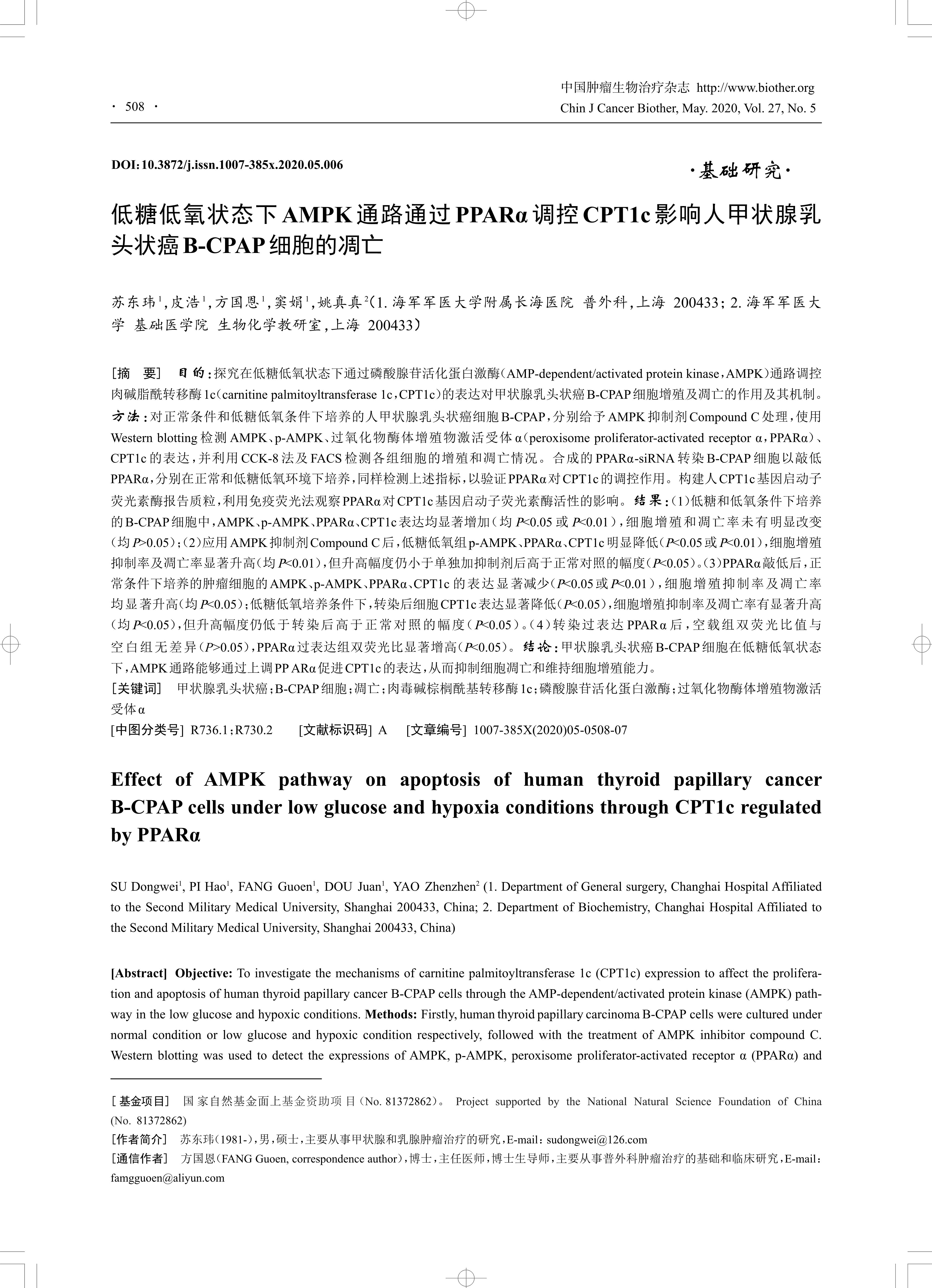 目的:探究在低糖低氧状态下通过磷酸腺苷活化蛋白激酶(AMP-dependent/activated protein kinase,AMPK)通路调控肉碱脂酰转移酶1c(carnitine palmitoyltransferase 1c,CPT1c)的表达对甲状腺乳头状癌B-CPAP细胞增殖及凋亡的作用及其机制。方法:对正常条件和低糖低氧条件下培养的人甲状腺乳头状癌细胞B-CPAP,分别给予AMPK抑制剂Compound C处理,使用Western blotting 检测AMPK、p-AMPK、过氧化物酶体增殖物激活受体α(peroxisome proliferator-activated receptor α,PPARα)、CPT1c 的表达,并利用CCK-8 法及FACS 检测各组细胞的增殖和凋亡情况。合成的PPARα-siRNA 转染B-CPAP 细胞以敲低PPARα,分别在正常和低糖低氧环境下培养,同样检测上述指标,以验证PPARα 对CPT1c 的调控作用。构建人CPT1c 基因启动子荧光素酶报告质粒,利用免疫荧光法观察PPARα 对CPT1c 基因启动子荧光素酶活性的影响。结果:(1)低糖和低氧条件下培养的B-CPAP细胞中,AMPK、p-AMPK、PPARα、CPT1c 表达均显著增加(均P<0.05 或P<0.01),细胞增殖和凋亡率未有明显改变(均P>0.05);(2)应用AMPK抑制剂Compound C后,低糖低氧组p-AMPK、PPARα、CPT1c 明显降低(P<0.05 或P<0.01),细胞增殖抑制率及凋亡率显著升高(均P<0.01),但升高幅度仍小于单独加抑制剂后高于正常对照的幅度(P<0.05)。(3)PPARα 敲低后,正常条件下培养的肿瘤细胞的AMPK、p-AMPK、PPARα、CPT1c 的表达显著减少(P<0.05 或P<0.01),细胞增殖抑制率及凋亡率均显著升高(均P<0.05);低糖低氧培养条件下,转染后细胞CPT1c 表达显著降低(P<0.05),细胞增殖抑制率及凋亡率有显著升高(均P<0.05),但升高幅度仍低于转染后高于正常对照的幅度(P<0.05)。(4)转染过表达PPARα 后,空载组双荧光比值与空白组无差异(P>0.05),PPARα 过表达组双荧光比显著增高(P<0.05)。结论:甲状腺乳头状癌B-CPAP细胞在低糖低氧状态下,AMPK通路能够通过上调PPARα 促进CPT1c的表达,从而抑制细胞凋亡和维持细胞增殖能力。