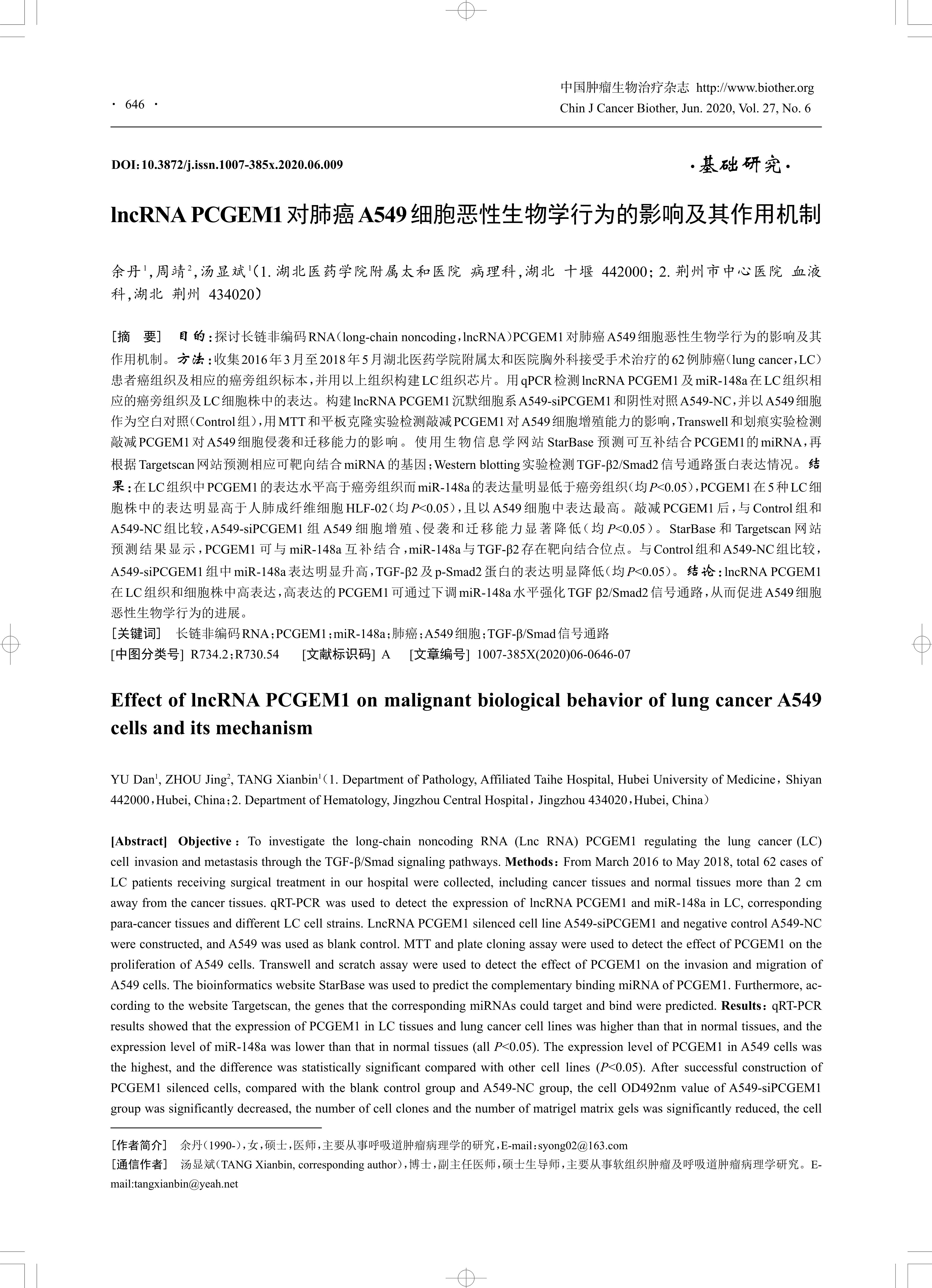 目的:探讨长链非编码RNA(long-chain noncoding,lncRNA)PCGEM1 对肺癌A549 细胞恶性生物学行为的影响及其作用机制。方法:收集2016 年3 月至2018 年5 月湖北医药学院附属太和医院胸外科接受手术治疗的62 例肺癌(lung cancer,LC)患者癌组织及相应的癌旁组织标本,并用以上组织构建LC组织芯片。用qPCR检测lncRNA PCGEM1 及miR-148a 在LC组织相应的癌旁组织及LC细胞株中的表达。构建lncRNA PCGEM1 沉默细胞系A549-siPCGEM1 和阴性对照A549-NC,并以A549 细胞作为空白对照(Control 组),用MTT和平板克隆实验检测敲减PCGEM1 对A549 细胞增殖能力的影响,Transwell 和划痕实验检测敲减PCGEM1 对A549 细胞侵袭和迁移能力的影响。使用生物信息学网站StarBase 预测可互补结合PCGEM1的miRNA,再根据Targetscan 网站预测相应可靶向结合miRNA的基因;Western blotting 实验检测TGF-β2/Smad2 信号通路蛋白表达情况。结果:在LC组织中PCGEM1 的表达水平高于癌旁组织而miR-148a 的表达量明显低于癌旁组织(均P<0.05),PCGEM1 在5 种LC细胞株中的表达明显高于人肺成纤维细胞HLF-02(均P<0.05),且以A549 细胞中表达最高。敲减PCGEM1 后,与Control 组和A549-NC 组比较,A549-siPCGEM1 组A549 细胞增殖、侵袭和迁移能力显著降低(均P<0.05)。StarBase 和Targetscan 网站预测结果显示,PCGEM1 可与miR-148a 互补结合,miR-148a 与TGF-β2 存在靶向结合位点。与Control 组和A549-NC组比较,A549-siPCGEM1 组中miR-148a 表达明显升高,TGF-β2 及p-Smad2 蛋白的表达明显降低(均P<0.05)。结论:lncRNA PCGEM1在LC组织和细胞株中高表达,高表达的PCGEM1 可通过下调miR-148a 水平强化TGF β2/Smad2 信号通路,从而促进A549 细胞恶性生物学行为的进展。