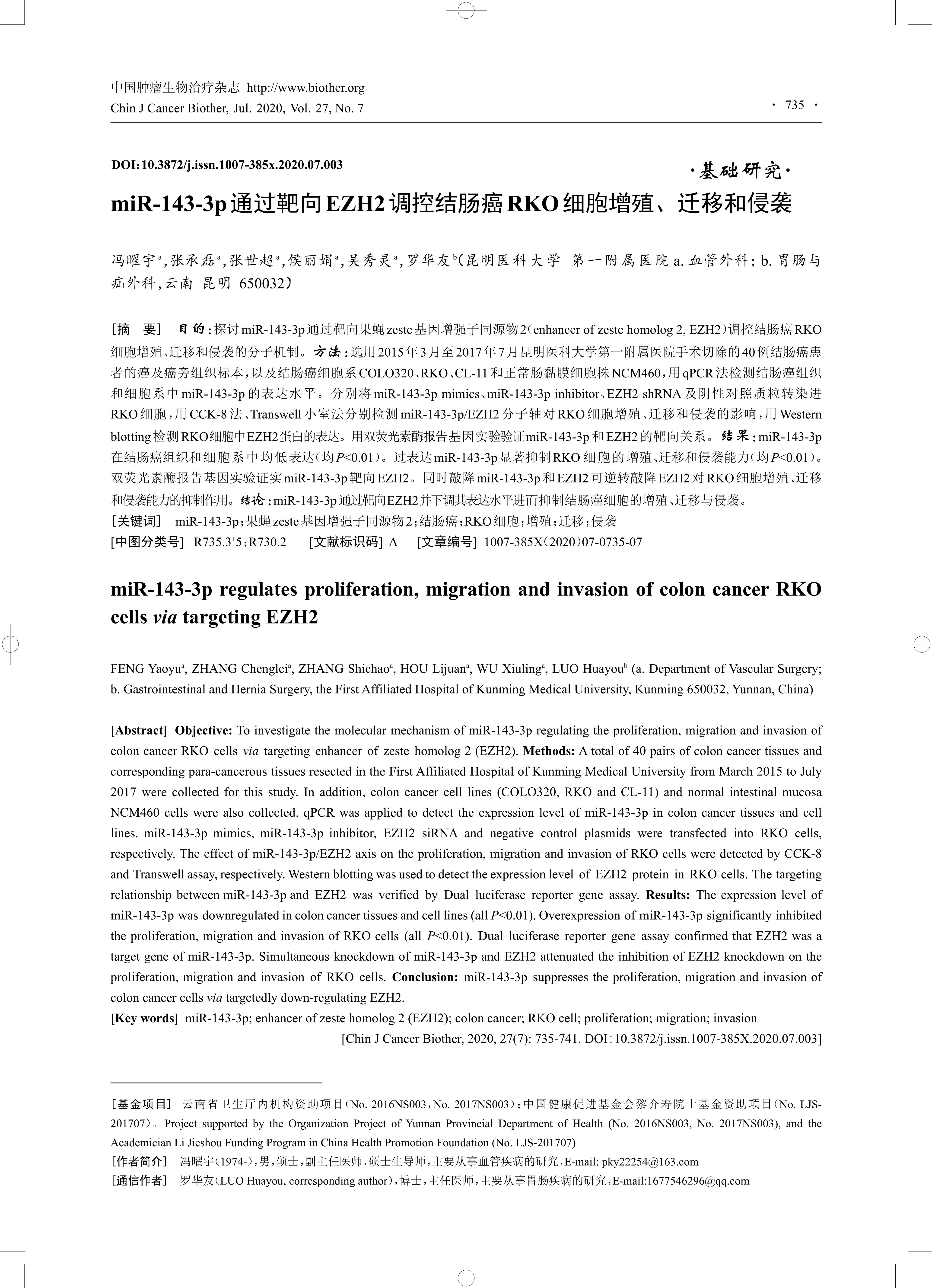 Objective: To investigate the molecular mechanism of miR-143-3p regulating the proliferation, migration and invasion of colon cancer RKO cells via targeting enhancer of zeste homolog 2 (EZH2). Methods: A total of 40 pairs of colon cancer tissues and corresponding para-cancerous tissues resected in the First Affiliated Hospital of Kunming Medical University from March 2015 to July 2017 were collected for this study. In addition, colon cancer cell lines (COLO320, RKO and CL-11) and normal intestinal mucosa NCM460 cells were also collected. qPCR was applied to detect the expression level of miR-143-3p in colon cancer tissues and cell lines. miR-143-3p mimics, miR-143-3p inhibitor, EZH2 siRNA and negative control plasmids were transfected into RKO cells,respectively. The effect of miR-143-3p/EZH2 axis on the proliferation, migration and invasion of RKO cells were detected by CCK-8 and Transwell assay, respectively.Western blotting was used to detect the expression level of EZH2 protein in RKO cells. The targeting relationship between miR-143-3p and EZH2 was verified by Dual luciferase reporter gene assay. Results: The expression level of miR-143-3p was downregulated in colon cancer tissues and cell lines (all P<0.01). Overexpression of miR-143-3p significantly inhibited the proliferation, migration and invasion of RKO cells (all P<0.01). Dual luciferase reporter gene assay confirmed that EZH2 was a target gene of miR-143-3p. Simultaneous knockdown of miR-143-3p and EZH2 attenuated the inhibition of EZH2 knockdown on the proliferation, migration and invasion of RKO cells. Conclusion: miR-143-3p suppresses the proliferation, migration and invasion of colon cancer cells via targetedly down-regulating EZH2.