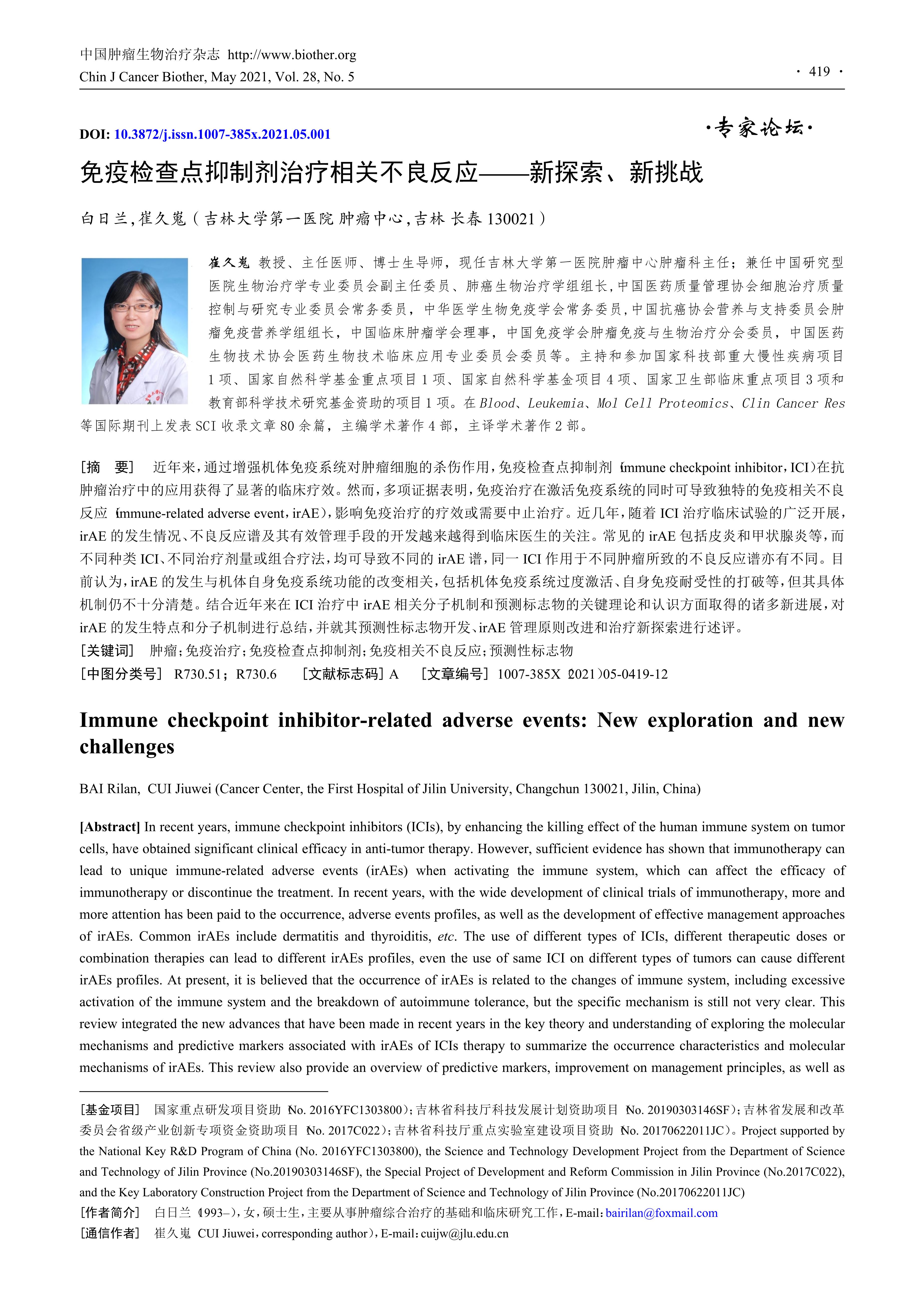 近年来,通过增强机体免疫系统对肿瘤细胞的杀伤作用,免疫检查点抑制剂(immune checkpoint inhibitor,ICI)在抗 肿瘤治疗中的应用获得了显著的临床疗效。然而,多项证据表明,免疫治疗在激活免疫系统的同时可导致独特的免疫相关不良 反应(immune-related adverse event,irAE),影响免疫治疗的疗效或需要中止治疗。近几年,随着 ICI 治疗临床试验的广泛开展, irAE 的发生情况、不良反应谱及其有效管理手段的开发越来越得到临床医生的关注。常见的 irAE 包括皮炎和甲状腺炎等,而 不同种类 ICI、不同治疗剂量或组合疗法,均可导致不同的 irAE 谱,同一 ICI 作用于不同肿瘤所致的不良反应谱亦有不同。目 前认为,irAE 的发生与机体自身免疫系统功能的改变相关,包括机体免疫系统过度激活、自身免疫耐受性的打破等,但其具体 机制仍不十分清楚。结合近年来在 ICI 治疗中 irAE 相关分子机制和预测标志物的关键理论和认识方面取得的诸多新进展,对 irAE 的发生特点和分子机制进行总结,并就其预测性标志物开发、irAE 管理原则改进和治疗新探索进行述评。