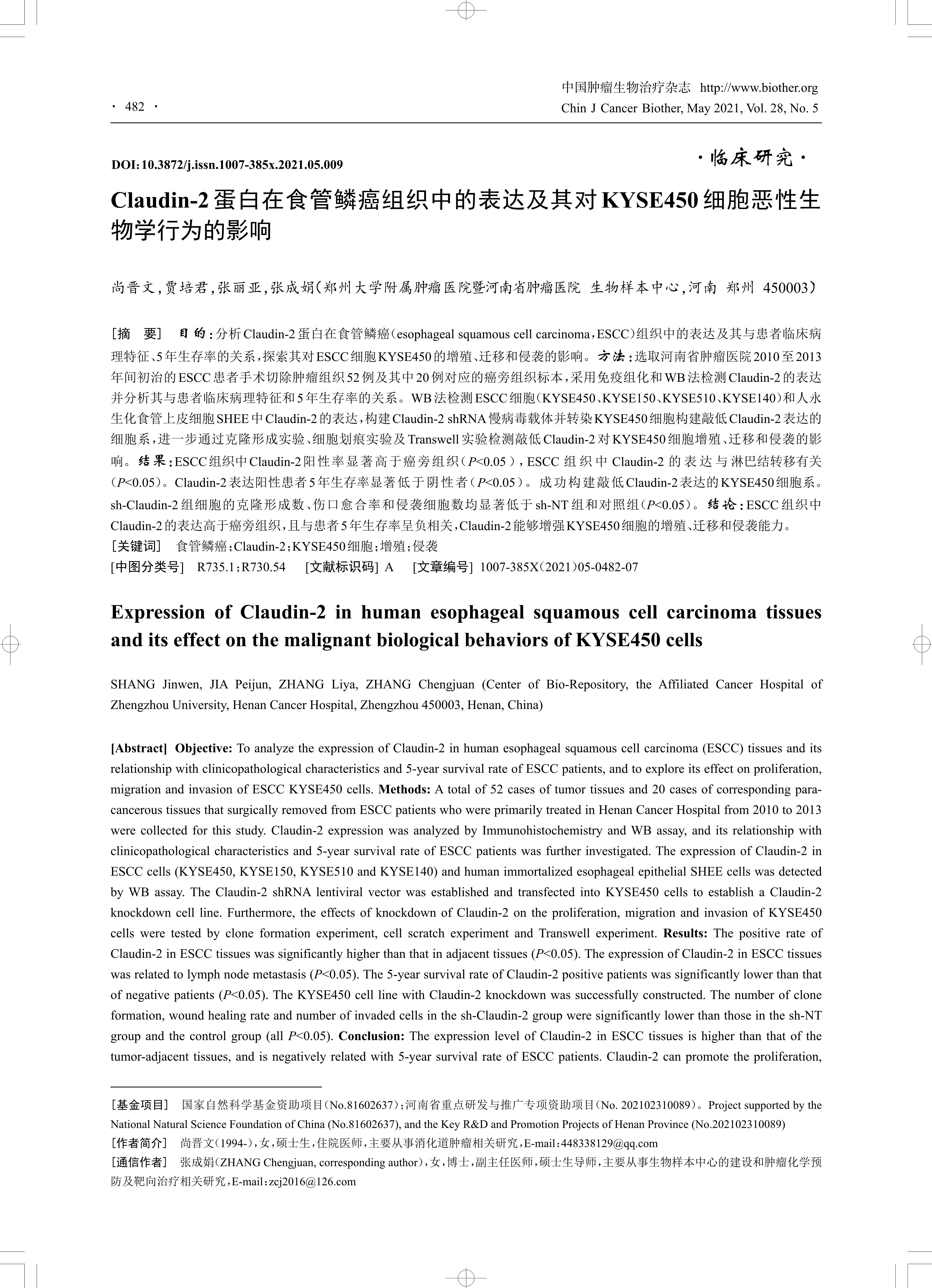 [Abstract] Objective: To analyze the expression of Claudin-2 in human esophageal squamous cell carcinoma (ESCC) tissues and its relationship with clinicopathological characteristics and 5-year survival rate of ESCC patients, and to explore its effect on proliferation, migration and invasion of ESCC KYSE450 cells. Methods: A total of 52 cases of tumor tissues and 20 cases of corresponding para-cancerous tissues that surgically removed from ESCC patients who were primarily treated in Henan Cancer Hospital from 2010 to 2013 were collected for this study. Claudin-2 expression was analyzed by Immunohistochemistry and WB assay, and its relationship with clinicopathological characteristics and 5-year survival rate of ESCC patients was further investigated. The expression of Claudin-2 in ESCC cells (KYSE450, KYSE150, KYSE510 and KYSE140) and human immortalized esophageal epithelial SHEE cells was detected by WB assay. The Claudin-2 shRNA lentiviral vector was established and transfected into KYSE450 cells to establish a Claudin-2 knockdown cell line. Furthermore, the effects of knockdown of Claudin-2 on the proliferation, migration and invasion of KYSE450 cells were tested by clone formation experiment, cell scratch experiment and Transwell experiment. Results: The positive rate of Claudin-2 in ESCC tissues was significantly higher than that in adjacent tissues (P<0.05). The expression of Claudin-2 in ESCC tissues was related to lymph node metastasis (P<0.05). The 5-year survival rate of Claudin-2 positive patients was significantly lower than that of negative patients (P<0.05). The KYSE450 cell line with Claudin-2 knockdown was successfully constructed. The number of clone formation, wound healing rate and number of invaded cells in the sh-Claudin-2 group were significantly lower than those in the sh-NT group and the control group (all P<0.05). Conclusion: The expression level of Claudin-2 in ESCC tissues is higher than that of the tumor-adjacent tissues, and is negatively related with 5-year survival rate of ESCC patients. Claudin-2 can promote the proliferation, migration and invasion of ESCC cells.