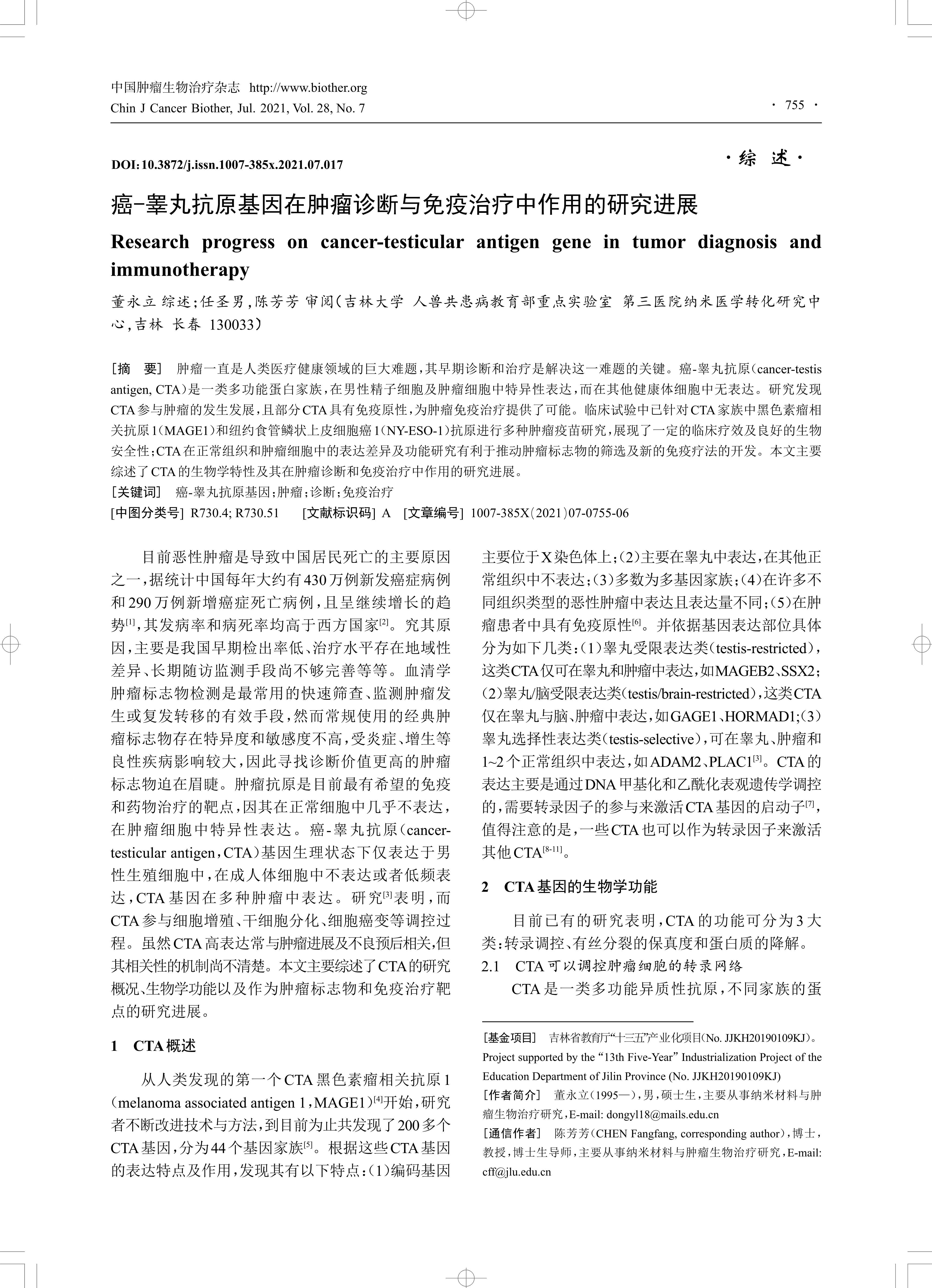肿瘤一直是人类医疗健康领域的巨大难题,其早期诊断和治疗是解决这一难题的关键。癌-睾丸抗原(cancer-testis antigen, CTA)是一类多功能蛋白家族,在男性精子细胞及肿瘤细胞中特异性表达,而在其他健康体细胞中无表达。研究发现 CTA参与肿瘤的发生发展,且部分CTA具有免疫原性,为肿瘤免疫治疗提供了可能。临床试验中已针对CTA家族中黑色素瘤相 关抗原1(MAGE1)和纽约食管鳞状上皮细胞癌1(NY-ESO-1)抗原进行多种肿瘤疫苗研究,展现了一定的临床疗效及良好的生物 安全性;CTA在正常组织和肿瘤细胞中的表达差异及功能研究有利于推动肿瘤标志物的筛选及新的免疫疗法的开发。本文主要 综述了CTA的生物学特性及其在肿瘤诊断和免疫治疗中作用的研究进展。