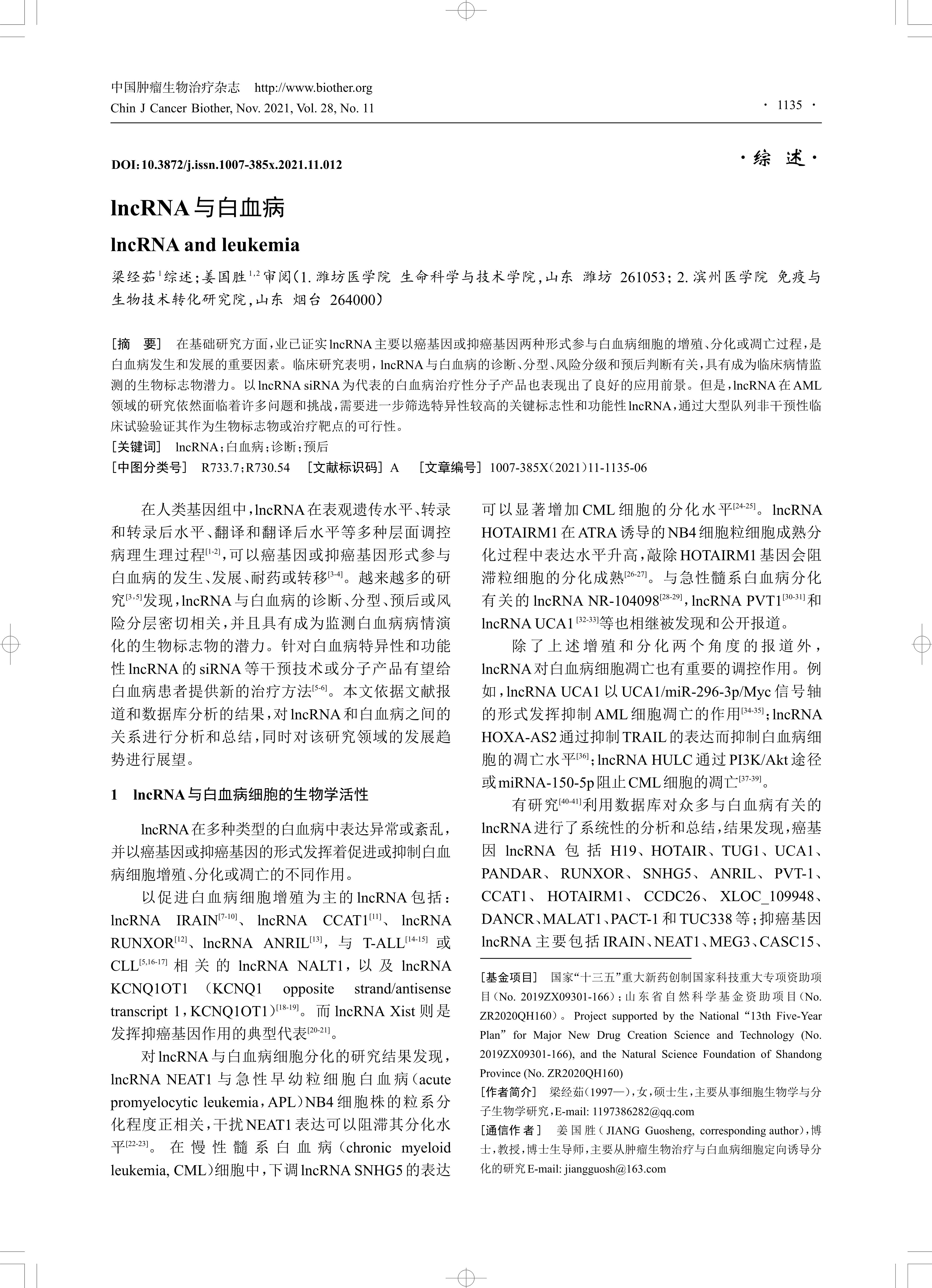 在基础研究方面,业已证实lncRNA主要以癌基因或抑癌基因两种形式参与白血病细胞的增殖、分化或凋亡过程,是 白血病发生和发展的重要因素。临床研究表明,lncRNA与白血病的诊断、分型、风险分级和预后判断有关,具有成为临床病情监 测的生物标志物潜力。以lncRNA siRNA为代表的白血病治疗性分子产品也表现出了良好的应用前景。但是,lncRNA在AML 领域的研究依然面临着许多问题和挑战,需要进一步筛选特异性较高的关键标志性和功能性lncRNA,通过大型队列非干预性临 床试验验证其作为生物标志物或治疗靶点的可行性。