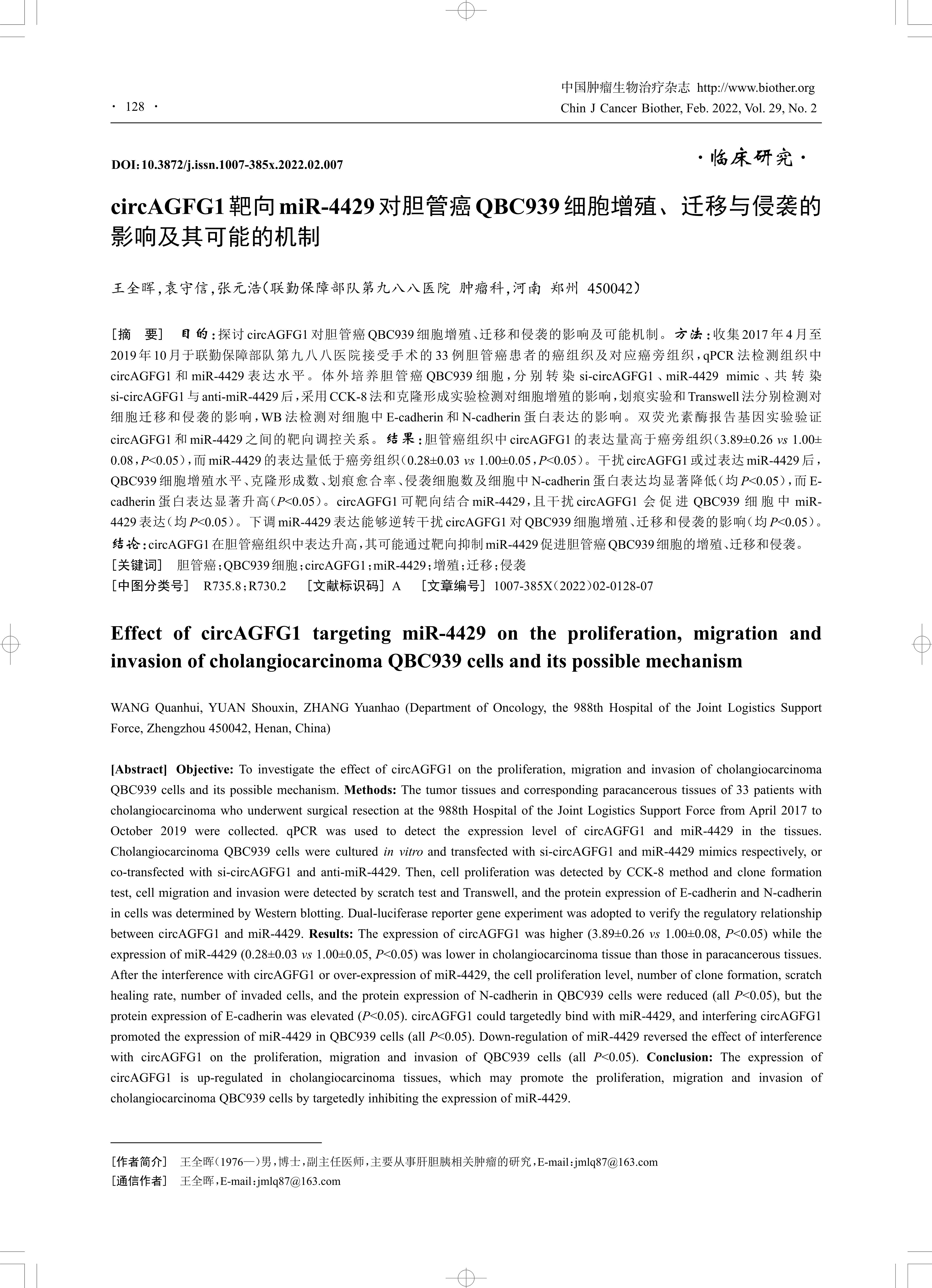 目的: 探讨circAGFG1对胆管癌QBC939细胞增殖、迁移和侵袭的影响及可能机制。 方法: 收集2017年4月至2019年10月于联勤保障部队第九八八医院接受手术的 33 例胆管癌患者的癌组织及对应癌旁组织,qPCR 法检测组织中circAGFG1 和 miR-4429 表达水平。体外培养胆管癌 QBC939 细胞,分 别 转 染 si-circAGFG1 、miR-4429 mimic 、共 转 染si-circAGFG1与anti-miR-4429后,采用CCK-8法和克隆形成实验检测对细胞增殖的影响,划痕实验和Transwell法分别检测对细胞迁移和侵袭的影响,WB 法检测对细胞中 E-cadherin 和 N-cadherin 蛋白表达的影响。双荧光素酶报告基因实验验证circAGFG1 和 miR-4429 之间的靶向调控关系。 结果: 胆管癌组织中 circAGFG1 的表达量高于癌旁组织(3.89±0.26 vs 1.00±0.08,P<0.05),而miR-4429的表达量低于癌旁组织(0.28±0.03 vs 1.00±0.05,P<0.05)。干扰circAGFG1或过表达miR-4429后,QBC939细胞增殖水平、克隆形成数、划痕愈合率、侵袭细胞数及细胞中 N-cadherin 蛋白表达均显著降低(均P<0.05),而E-cadherin蛋白表达显著升高(P<0.05)。circAGFG1可靶向结合miR-4429,且干扰circAGFG1会 促 进 QBC939 细 胞 中 miR-4429表达(均P<0.05)。下调miR-4429表达能够逆转干扰circAGFG1对QBC939细胞增殖、迁移和侵袭的影响(均P<0.05)。 结论:circAGFG1在胆管癌组织中表达升高,其可能通过靶向抑制miR-4429促进胆管癌QBC939细胞的增殖、迁移和侵袭。