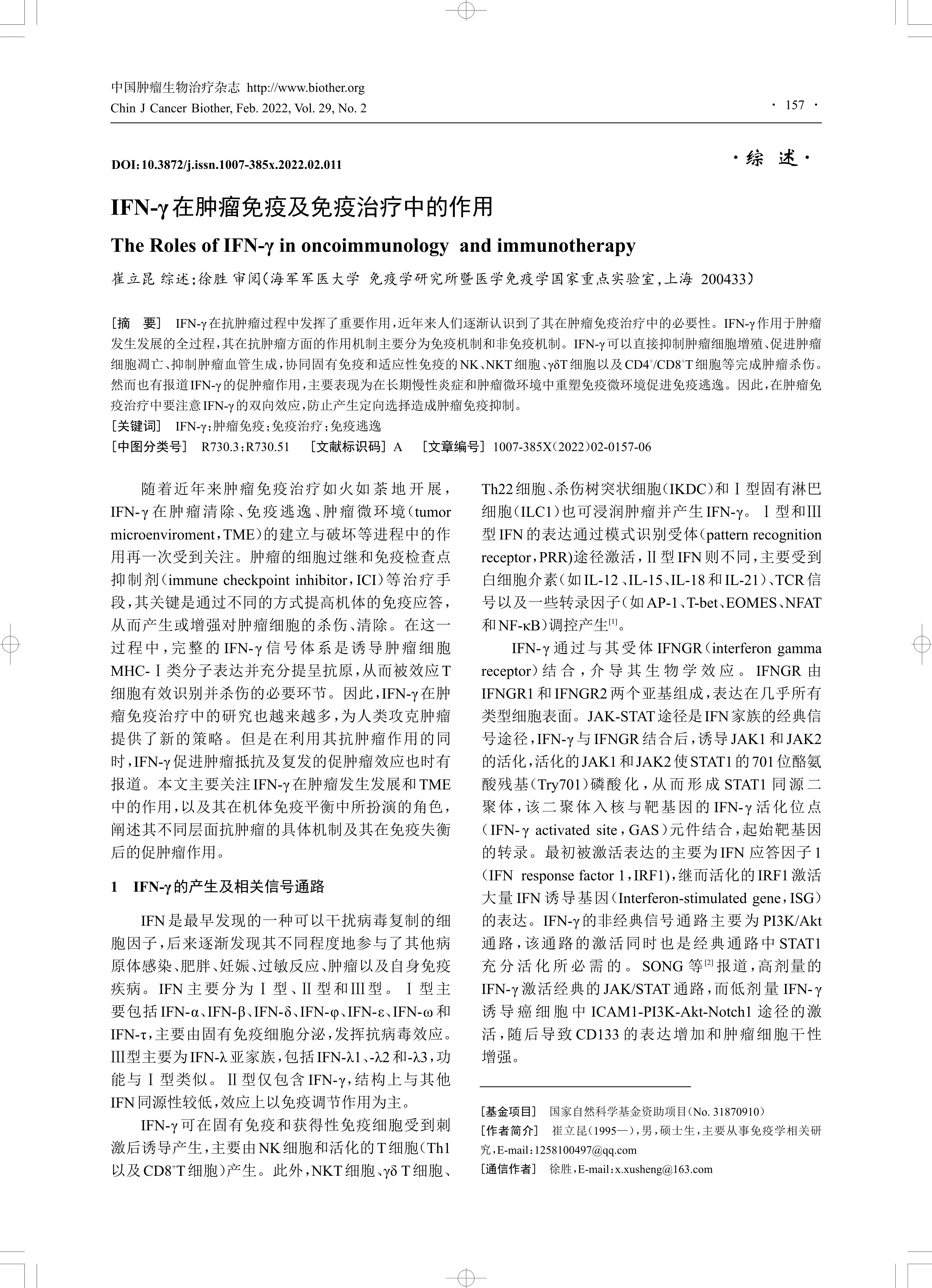 IFN-γ在抗肿瘤过程中发挥了重要作用,近年来人们逐渐认识到了其在肿瘤免疫治疗中的必要性。IFN-γ作用于肿瘤发生发展的全过程,其在抗肿瘤方面的作用机制主要分为免疫机制和非免疫机制。IFN-γ可以直接抑制肿瘤细胞增殖、促进肿瘤细胞凋亡、抑制肿瘤血管生成,协同固有免疫和适应性免疫的NK、NKT细胞、γδT细胞以及CD4 + /CD8 + T细胞等完成肿瘤杀伤。然而也有报道IFN-γ的促肿瘤作用,主要表现为在长期慢性炎症和肿瘤微环境中重塑免疫微环境促进免疫逃逸。因此,在肿瘤免疫治疗中要注意IFN-γ的双向效应,防止产生定向选择造成肿瘤免疫抑制。