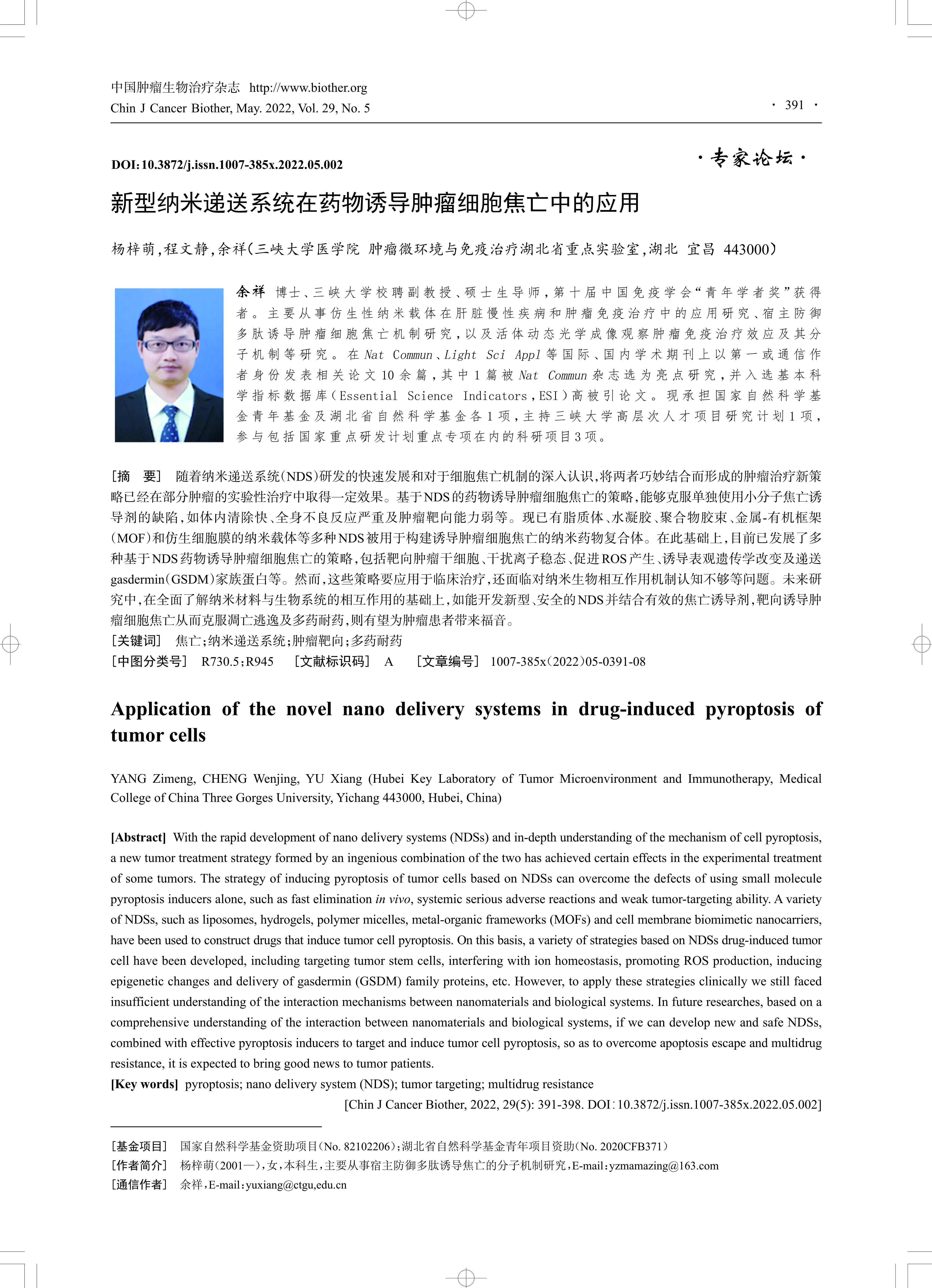 随着纳米递送系统(NDS)研发的快速发展和对于细胞焦亡机制的深入认识,将两者巧妙结合而形成的肿瘤治疗新策略已经在部分肿瘤的实验性治疗中取得一定效果。基于NDS的药物诱导肿瘤细胞焦亡的策略,能够克服单独使用小分子焦亡诱导剂的缺陷,如体内清除快、全身不良反应严重及肿瘤靶向能力弱等。现已有脂质体、水凝胶、聚合物胶束、金属-有机框架(MOF)和仿生细胞膜的纳米载体等多种NDS被用于构建诱导肿瘤细胞焦亡的纳米药物复合体。在此基础上,目前已发展了多种基于NDS药物诱导肿瘤细胞焦亡的策略,包括靶向肿瘤干细胞、干扰离子稳态、促进ROS产生、诱导表观遗传学改变及递送gasdermin(GSDM)家族蛋白等。然而,这些策略要应用于临床治疗,还面临对纳米生物相互作用机制认知不够等问题。未来研究中,在全面了解纳米材料与生物系统的相互作用的基础上,如能开发新型、安全的NDS并结合有效的焦亡诱导剂,靶向诱导肿瘤细胞焦亡从而克服凋亡逃逸及多药耐药,则有望为肿瘤患者带来福音。