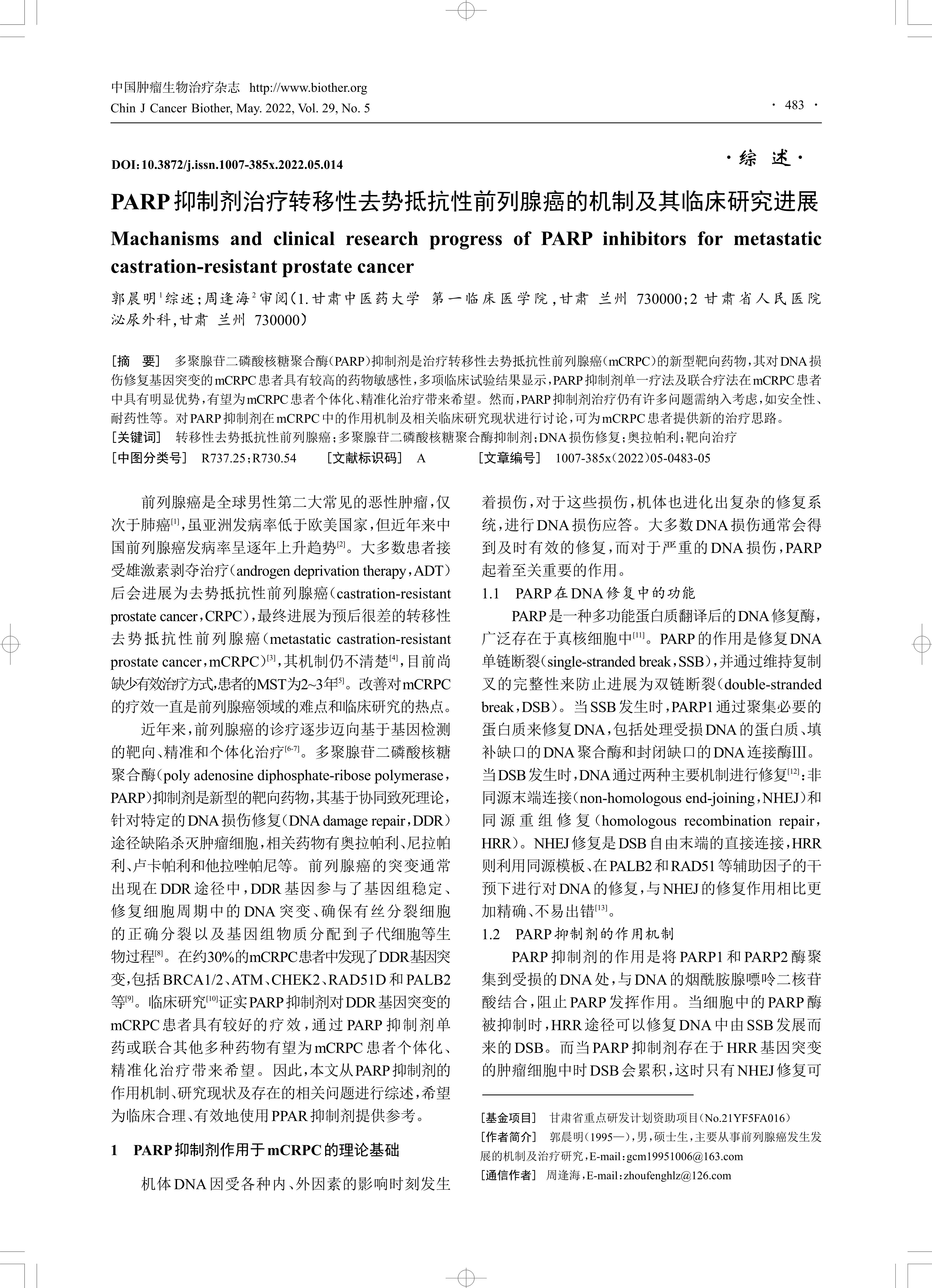 多聚腺苷二磷酸核糖聚合酶(PARP)抑制剂是治疗转移性去势抵抗性前列腺癌(mCRPC)的新型靶向药物,其对DNA损伤修复基因突变的mCRPC患者具有较高的药物敏感性,多项临床试验结果显示,PARP抑制剂单一疗法及联合疗法在mCRPC患者中具有明显优势,有望为mCRPC患者个体化、精准化治疗带来希望。然而,PARP抑制剂治疗仍有许多问题需纳入考虑,如安全性、耐药性等。对PARP抑制剂在mCRPC中的作用机制及相关临床研究现状进行讨论,可为mCRPC患者提供新的治疗思路。
