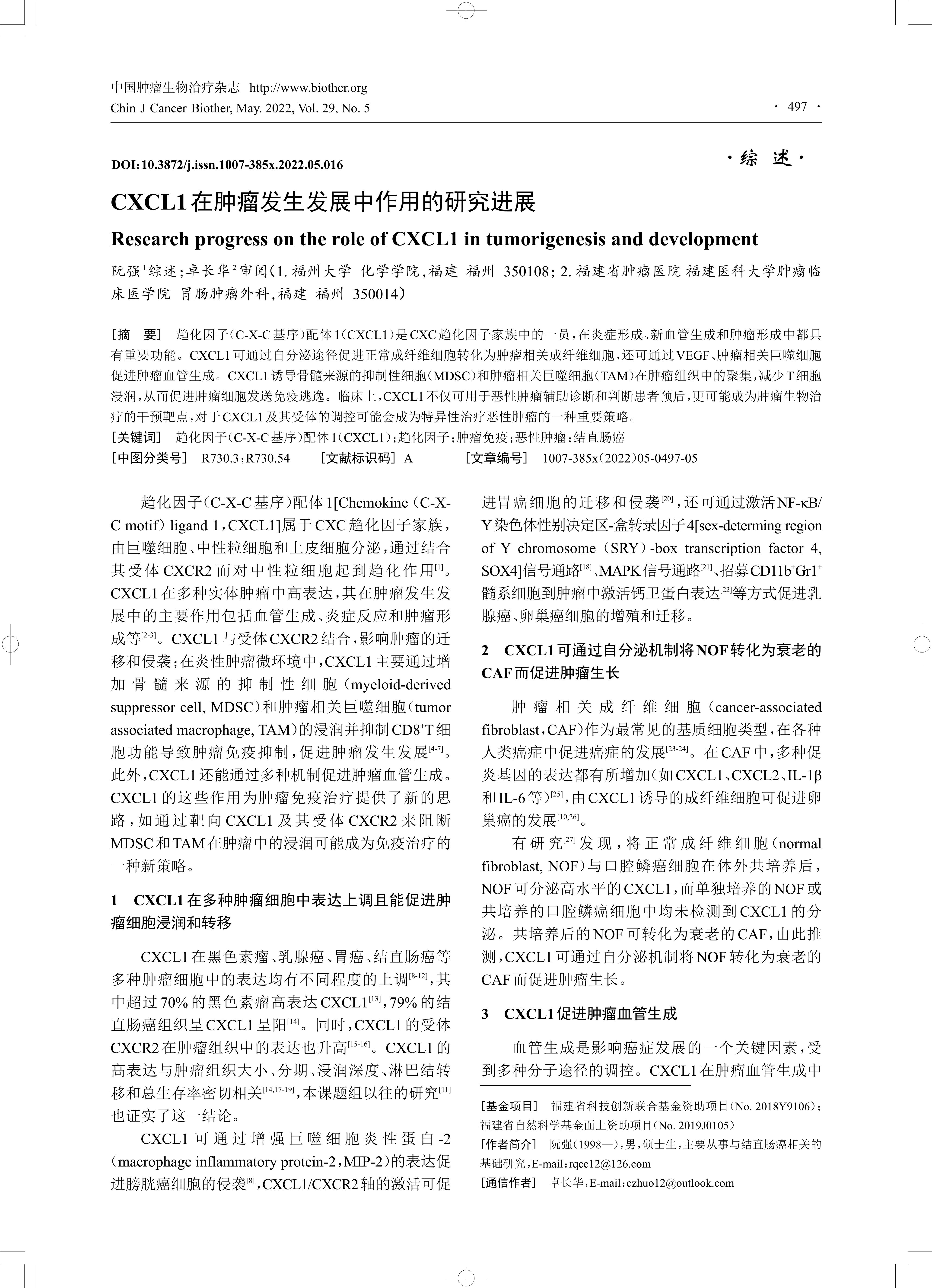 趋化因子(C-X-C基序)配体1(CXCL1)是CXC趋化因子家族中的一员,在炎症形成、新血管生成和肿瘤形成中都具有重要功能。CXCL1可通过自分泌途径促进正常成纤维细胞转化为肿瘤相关成纤维细胞,还可通过VEGF、肿瘤相关巨噬细胞促进肿瘤血管生成。CXCL1诱导骨髓来源的抑制性细胞(MDSC)和肿瘤相关巨噬细胞(TAM)在肿瘤组织中的聚集,减少T细胞浸润,从而促进肿瘤细胞发送免疫逃逸。临床上,CXCL1不仅可用于恶性肿瘤辅助诊断和判断患者预后,更可能成为肿瘤生物治疗的干预靶点,对于CXCL1及其受体的调控可能会成为特异性治疗恶性肿瘤的一种重要策略。