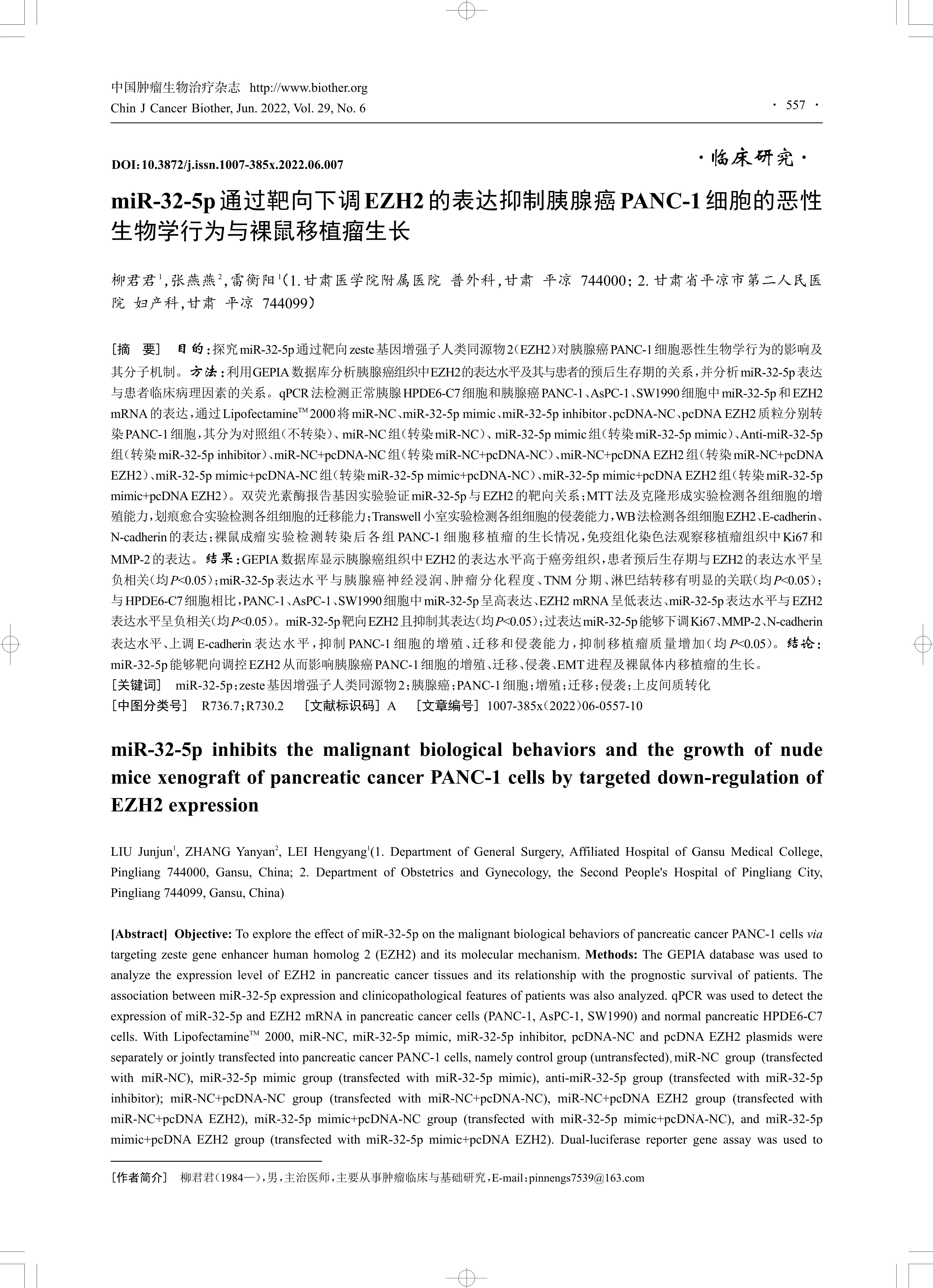 目的:探究miR-32-5p通过靶向zeste基因增强子人类同源物2(EZH2)对胰腺癌PANC-1细胞恶性生物学行为的影响及其分子机制。方法:利用GEPIA数据库分析胰腺癌组织中EZH2的表达水平及其与患者的预后生存期的关系,并分析miR-32-5p表达与患者临床病理因素的关系。qPCR法检测正常胰腺HPDE6-C7细胞和胰腺癌PANC-1、AsPC-1、SW1990细胞中miR-32-5p和EZH2 mRNA的表达,通过LipofectamineTM 2000将miR-NC、miR-32-5p mimic、miR-32-5p inhibitor、pcDNA-NC、pcDNA EZH2质粒分别转染PANC-1细胞,其分为对照组(不转染)、miR-NC组(转染miR-NC)、miR-32-5p mimic组(转染miR-32-5p mimic)、Anti-miR-32-5p 组(转染miR-32-5p inhibitor)、miR-NC+pcDNA-NC组(转染miR-NC+pcDNA-NC)、miR-NC+pcDNA EZH2组(转染miR-NC+pcDNA EZH2)、miR-32-5p mimic+pcDNA-NC组(转染miR-32-5p mimic+pcDNA-NC)、miR-32-5p mimic+pcDNA EZH2组(转染miR-32-5p mimic+pcDNA EZH2)。双荧光素酶报告基因实验验证miR-32-5p与EZH2的靶向关系;MTT法及克隆形成实验检测各组细胞的增殖能力,划痕愈合实验检测各组细胞的迁移能力;Transwell小室实验检测各组细胞的侵袭能力,WB法检测各组细胞EZH2、E-cadherin、N-cadherin的表达;裸鼠成瘤实验检测转染后各组 PANC-1 细胞移植瘤的生长情况,免疫组化染色法观察移植瘤组织中Ki67和MMP-2的表达。结果:GEPIA数据库显示胰腺癌组织中EZH2的表达水平高于癌旁组织,患者预后生存期与EZH2的表达水平呈负相关(均P<0.05);miR-32-5p表达水平与胰腺癌神经浸润、肿瘤分化程度、TNM 分期、淋巴结转移有明显的关联(均P<0.05);与HPDE6-C7细胞相比,PANC-1、AsPC-1、SW1990细胞中miR-32-5p呈高表达、EZH2 mRNA呈低表达、miR-32-5p表达水平与EZH2 表达水平呈负相关(均P<0.05)。miR-32-5p靶向EZH2且抑制其表达(均P<0.05);过表达miR-32-5p能够下调Ki67、MMP-2、N-cadherin 表达水平、上调 E-cadherin 表达水平,抑制 PANC-1 细胞的增殖、迁移和侵袭能力,抑制移植瘤质量增加(均 P<0.05)。结论:miR-32-5p能够靶向调控EZH2从而影响胰腺癌PANC-1细胞的增殖、迁移、侵袭、EMT进程及裸鼠体内移植瘤的生长。
