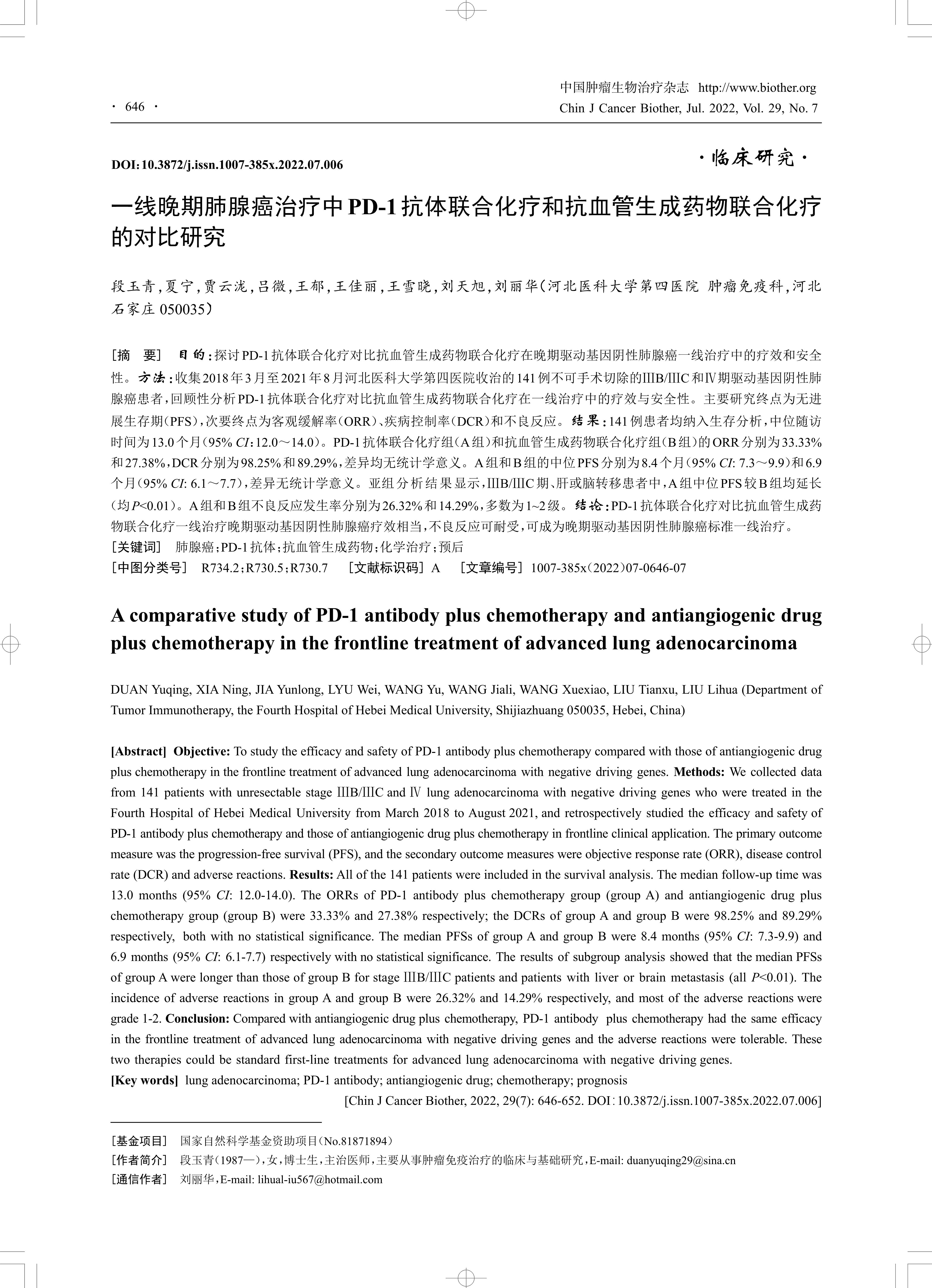 目的:探讨PD-1抗体联合化疗对比抗血管生成药物联合化疗在晚期驱动基因阴性肺腺癌一线治疗中的疗效和安全性。方法:收集2018年3月至2021年8月河北医科大学第四医院收治的141例不可手术切除的ⅢB/ⅢC和Ⅳ期驱动基因阴性肺腺癌患者,回顾性分析PD-1抗体联合化疗对比抗血管生成药物联合化疗在一线治疗中的疗效与安全性。主要研究终点为无进展生存期(PFS),次要终点为客观缓解率(ORR)、疾病控制率(DCR)和不良反应。结果:141例患者均纳入生存分析,中位随访时间为13.0个月(95% CI:12.0~14.0)。PD-1抗体联合化疗组(A组)和抗血管生成药物联合化疗组(B组)的ORR分别为33.33%和27.38%,DCR分别为98.25%和89.29%,差异均无统计学意义。A组和B组的中位PFS分别为8.4个月(95% CI: 7.3~9.9)和6.9个月(95% CI: 6.1~7.7),差异无统计学意义。亚组分析结果显示,ⅢB/ⅢC期、肝或脑转移患者中,A组中位PFS较B组均延长(均P<0.01)。A组和B组不良反应发生率分别为26.32%和14.29%,多数为1~2级。结论:PD-1抗体联合化疗对比抗血管生成药物联合化疗一线治疗晚期驱动基因阴性肺腺癌疗效相当,不良反应可耐受,可成为晚期驱动基因阴性肺腺癌标准一线治疗。