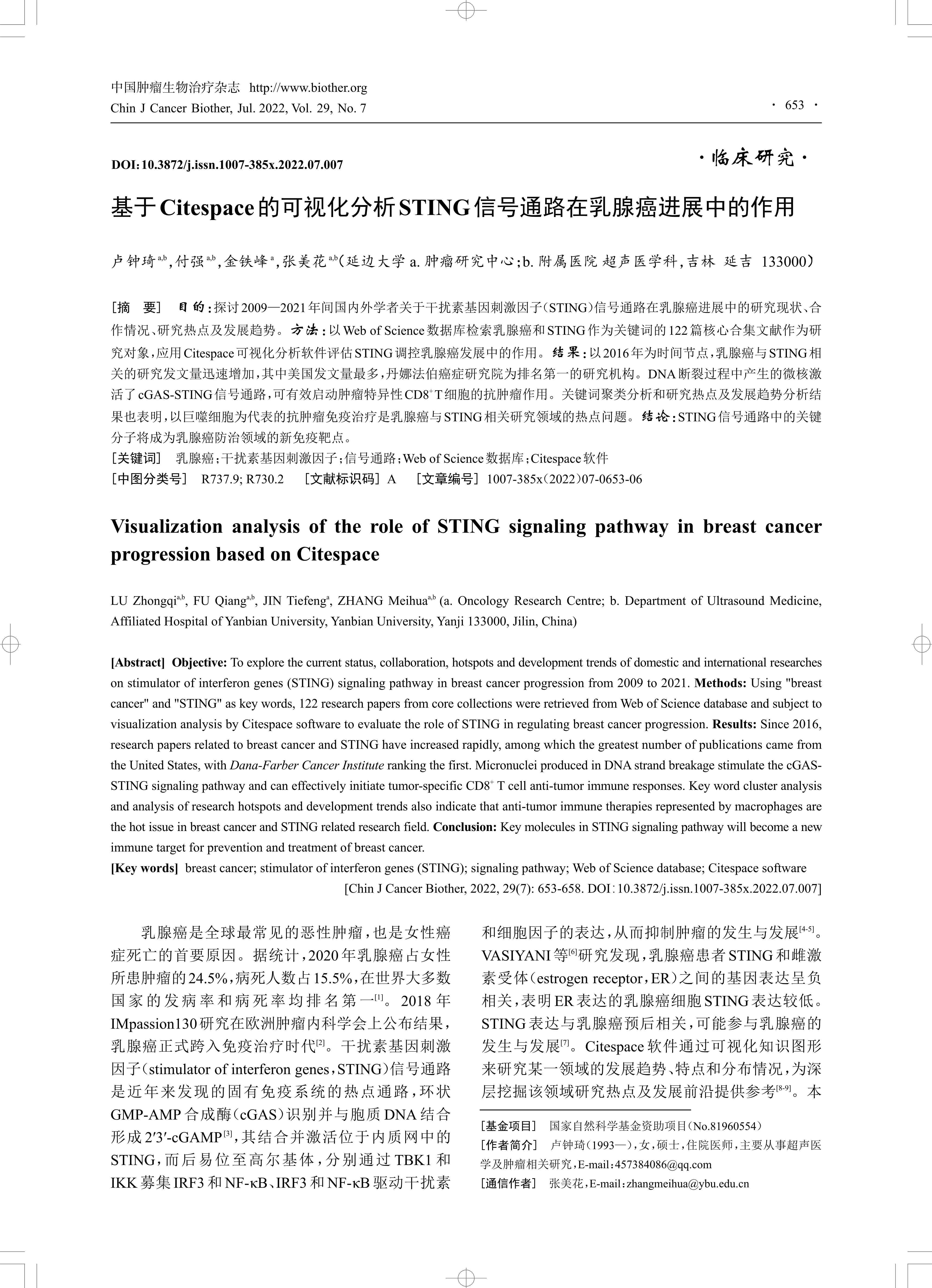 目的:探讨2009—2021年间国内外学者关于干扰素基因刺激因子(STING)信号通路在乳腺癌进展中的研究现状、合 作情况、研究热点及发展趋势。方法:以Web of Science数据库检索乳腺癌和STING作为关键词的122篇核心合集文献作为研 究对象,应用Citespace可视化分析软件评估STING调控乳腺癌发展中的作用。结果:以2016年为时间节点,乳腺癌与STING相 关的研究发文量迅速增加,其中美国发文量最多,丹娜法伯癌症研究院为排名第一的研究机构。DNA断裂过程中产生的微核激 活了cGAS-STING信号通路,可有效启动肿瘤特异性CD8+ T细胞的抗肿瘤作用。关键词聚类分析和研究热点及发展趋势分析结 果也表明,以巨噬细胞为代表的抗肿瘤免疫治疗是乳腺癌与STING相关研究领域的热点问题。结论:STING信号通路中的关键 分子将成为乳腺癌防治领域的新免疫靶点。