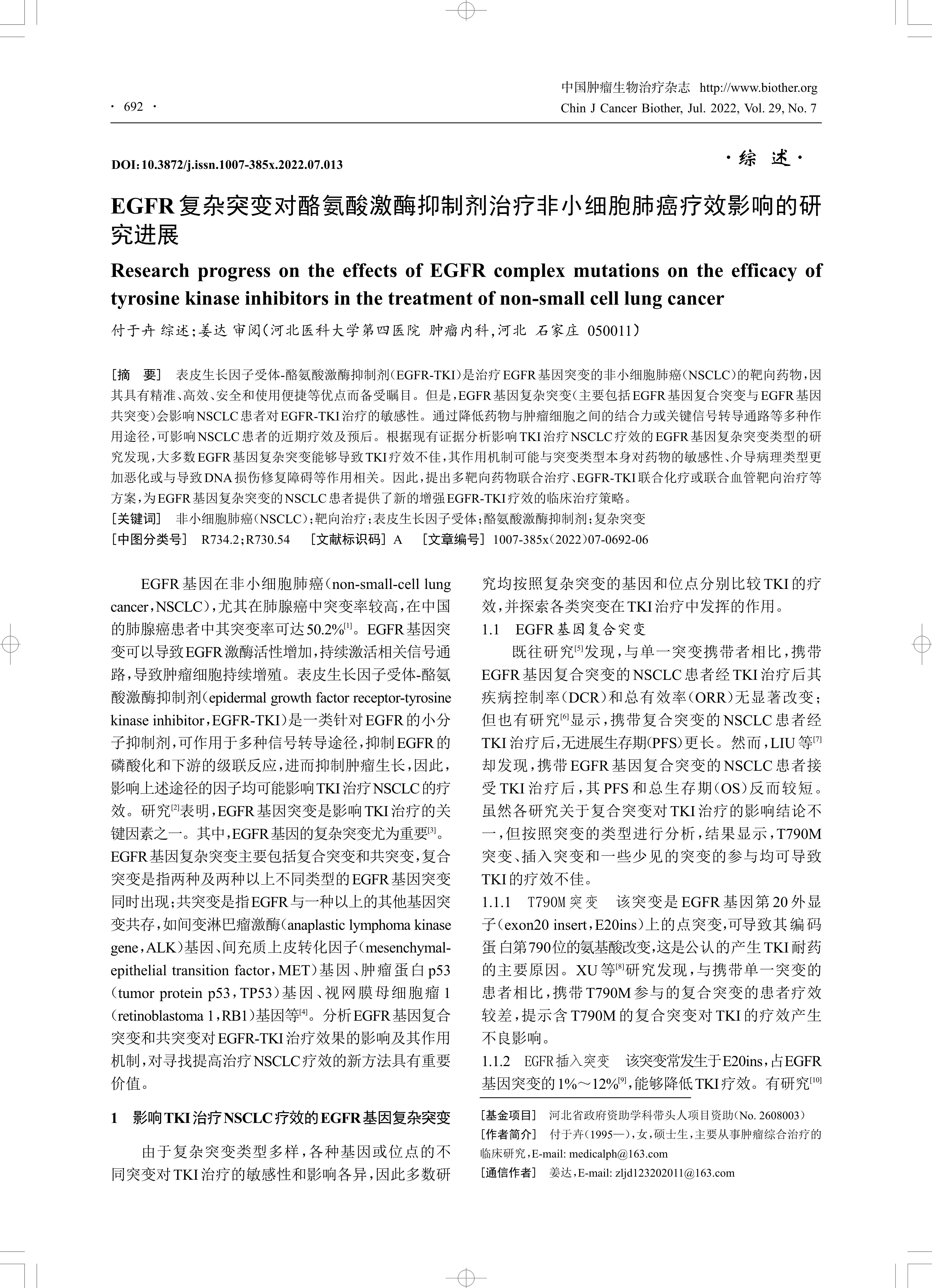 表皮生长因子受体-酪氨酸激酶抑制剂(EGFR-TKI)是治疗EGFR基因突变的非小细胞肺癌(NSCLC)的靶向药物,因 其具有精准、高效、安全和使用便捷等优点而备受瞩目。但是,EGFR基因复杂突变(主要包括EGFR基因复合突变与EGFR基因 共突变)会影响NSCLC患者对EGFR-TKI治疗的敏感性。通过降低药物与肿瘤细胞之间的结合力或关键信号转导通路等多种作 用途径,可影响NSCLC患者的近期疗效及预后。根据现有证据分析影响TKI治疗NSCLC疗效的EGFR基因复杂突变类型的研 究发现,大多数EGFR基因复杂突变能够导致TKI疗效不佳,其作用机制可能与突变类型本身对药物的敏感性、介导病理类型更 加恶化或与导致DNA损伤修复障碍等作用相关。因此,提出多靶向药物联合治疗、EGFR-TKI联合化疗或联合血管靶向治疗等 方案,为EGFR基因复杂突变的NSCLC患者提供了新的增强EGFR-TKI疗效的临床治疗策略。