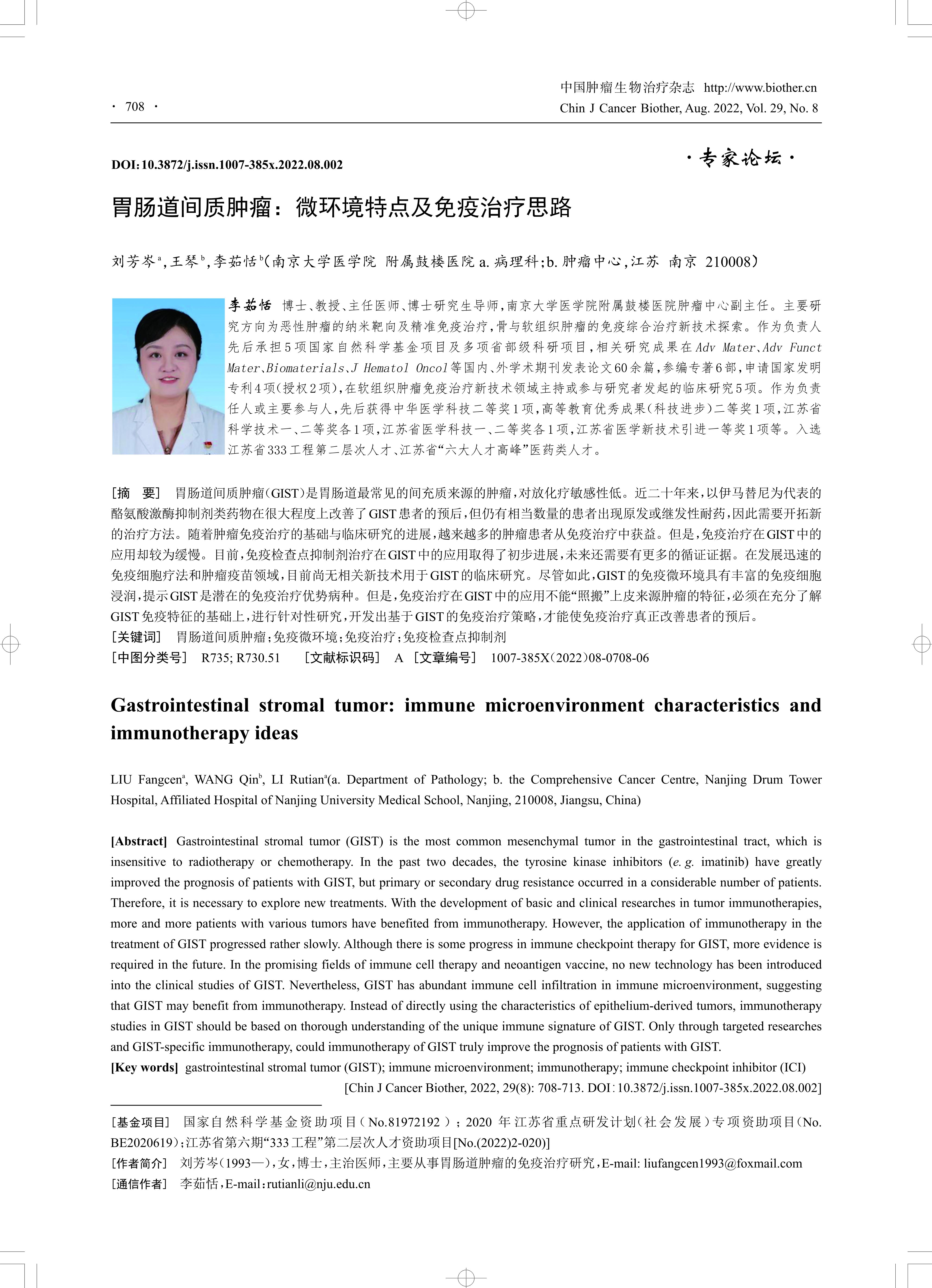 胃肠道间质肿瘤(GIST)是胃肠道最常见的间充质来源的肿瘤,对放化疗敏感性低。近二十年来,以伊马替尼为代表的 酪氨酸激酶抑制剂类药物在很大程度上改善了GIST患者的预后,但仍有相当数量的患者出现原发或继发性耐药,因此需要开拓新 的治疗方法。随着肿瘤免疫治疗的基础与临床研究的进展,越来越多的肿瘤患者从免疫治疗中获益。但是,免疫治疗在GIST中的 应用却较为缓慢。目前,免疫检查点抑制剂治疗在GIST中的应用取得了初步进展,未来还需要有更多的循证证据。在发展迅速的 免疫细胞疗法和肿瘤疫苗领域,目前尚无相关新技术用于GIST的临床研究。尽管如此,GIST的免疫微环境具有丰富的免疫细胞 浸润,提示GIST是潜在的免疫治疗优势病种。但是,免疫治疗在GIST中的应用不能“照搬”上皮来源肿瘤的特征,必须在充分了解 GIST免疫特征的基础上,进行针对性研究,开发出基于GIST的免疫治疗策略,才能使免疫治疗真正改善患者的预后。