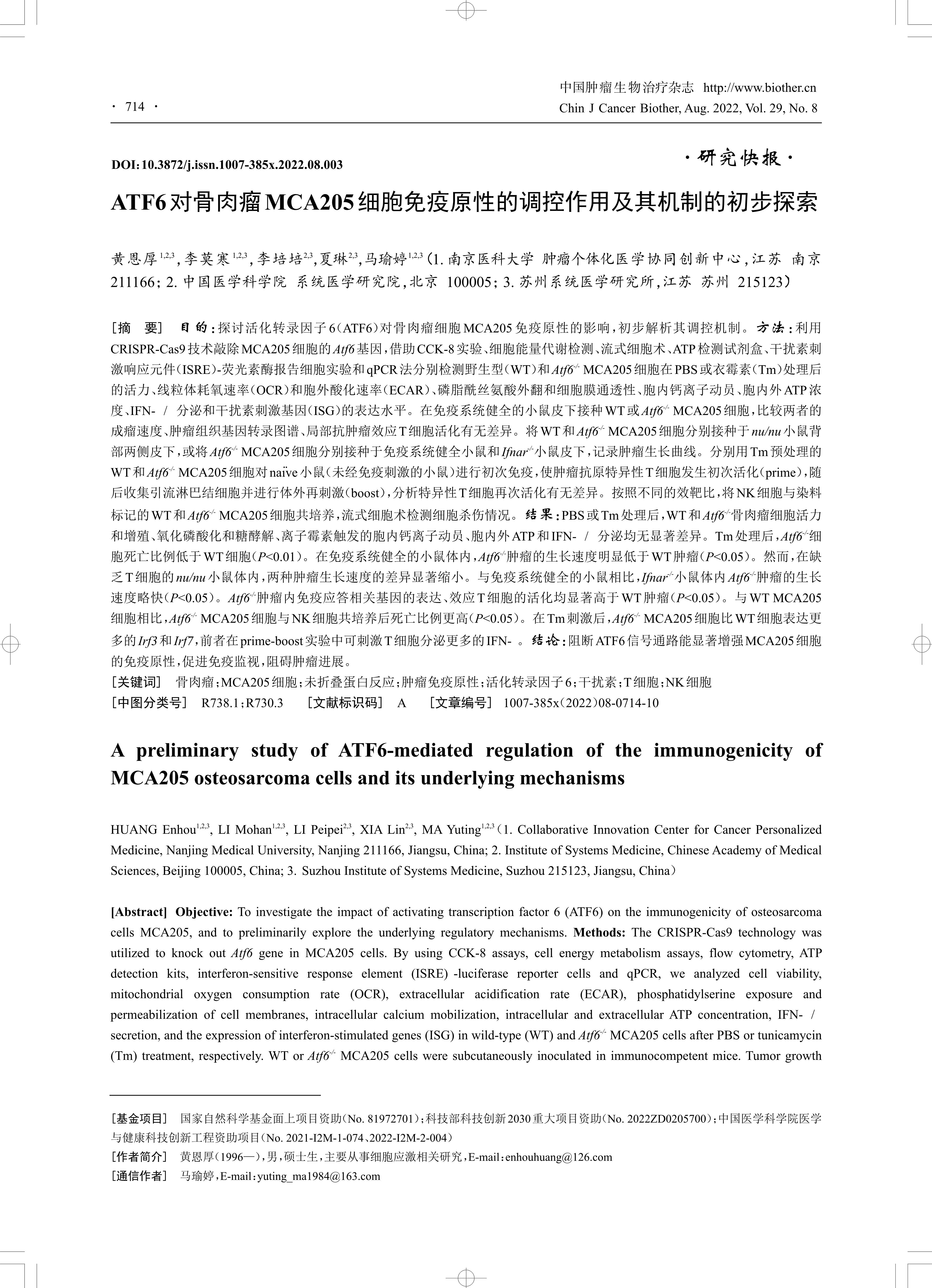 目的:探讨活化转录因子 6(ATF6)对骨肉瘤细胞 MCA205 免疫原性的影响,初步解析其调控机制。方法:利用CRISPR-Cas9技术敲除MCA205细胞的Atf6基因,借助CCK-8实验、细胞能量代谢检测、流式细胞术、ATP检测试剂盒、干扰素刺激响应元件(ISRE)-荧光素酶报告细胞实验和qPCR法分别检测野生型(WT)和Atf6-/- MCA205细胞在PBS或衣霉素(Tm)处理后的活力、线粒体耗氧速率(OCR)和胞外酸化速率(ECAR)、磷脂酰丝氨酸外翻和细胞膜通透性、胞内钙离子动员、胞内外ATP浓度、IFN-a/b分泌和干扰素刺激基因(ISG)的表达水平。在免疫系统健全的小鼠皮下接种WT或Atf6-/- MCA205细胞,比较两者的成瘤速度、肿瘤组织基因转录图谱、局部抗肿瘤效应T细胞活化有无差异。将WT和Atf6-/- MCA205细胞分别接种于nu/nu小鼠背部两侧皮下,或将Atf6-/- MCA205细胞分别接种于免疫系统健全小鼠和Ifnar-/-小鼠皮下,记录肿瘤生长曲线。分别用Tm预处理的WT和Atf6-/- MCA205细胞对na?ve小鼠(未经免疫刺激的小鼠)进行初次免疫,使肿瘤抗原特异性T细胞发生初次活化(prime),随后收集引流淋巴结细胞并进行体外再刺激(boost),分析特异性T细胞再次活化有无差异。按照不同的效靶比,将NK细胞与染料标记的WT和Atf6-/- MCA205细胞共培养,流式细胞术检测细胞杀伤情况。结果:PBS或Tm处理后,WT和Atf6-/-骨肉瘤细胞活力和增殖、氧化磷酸化和糖酵解、离子霉素触发的胞内钙离子动员、胞内外ATP和IFN-a/b分泌均无显著差异。Tm处理后,Atf6-/-细胞死亡比例低于WT细胞(P<0.01)。在免疫系统健全的小鼠体内,Atf6-/-肿瘤的生长速度明显低于WT肿瘤(P<0.05)。然而,在缺乏T细胞的nu/nu小鼠体内,两种肿瘤生长速度的差异显著缩小。与免疫系统健全的小鼠相比,Ifnar-/-小鼠体内Atf6-/-肿瘤的生长速度略快(P<0.05)。Atf6-/-肿瘤内免疫应答相关基因的表达、效应T细胞的活化均显著高于WT肿瘤(P<0.05)。与WT MCA205细胞相比,Atf6-/- MCA205细胞与NK细胞共培养后死亡比例更高(P<0.05)。在Tm刺激后,Atf6-/- MCA205细胞比WT细胞表达更多的Irf3和Irf7,前者在prime-boost实验中可刺激T细胞分泌更多的IFN-g。结论:阻断ATF6信号通路能显著增强MCA205细胞的免疫原性,促进免疫监视,阻碍肿瘤进展。