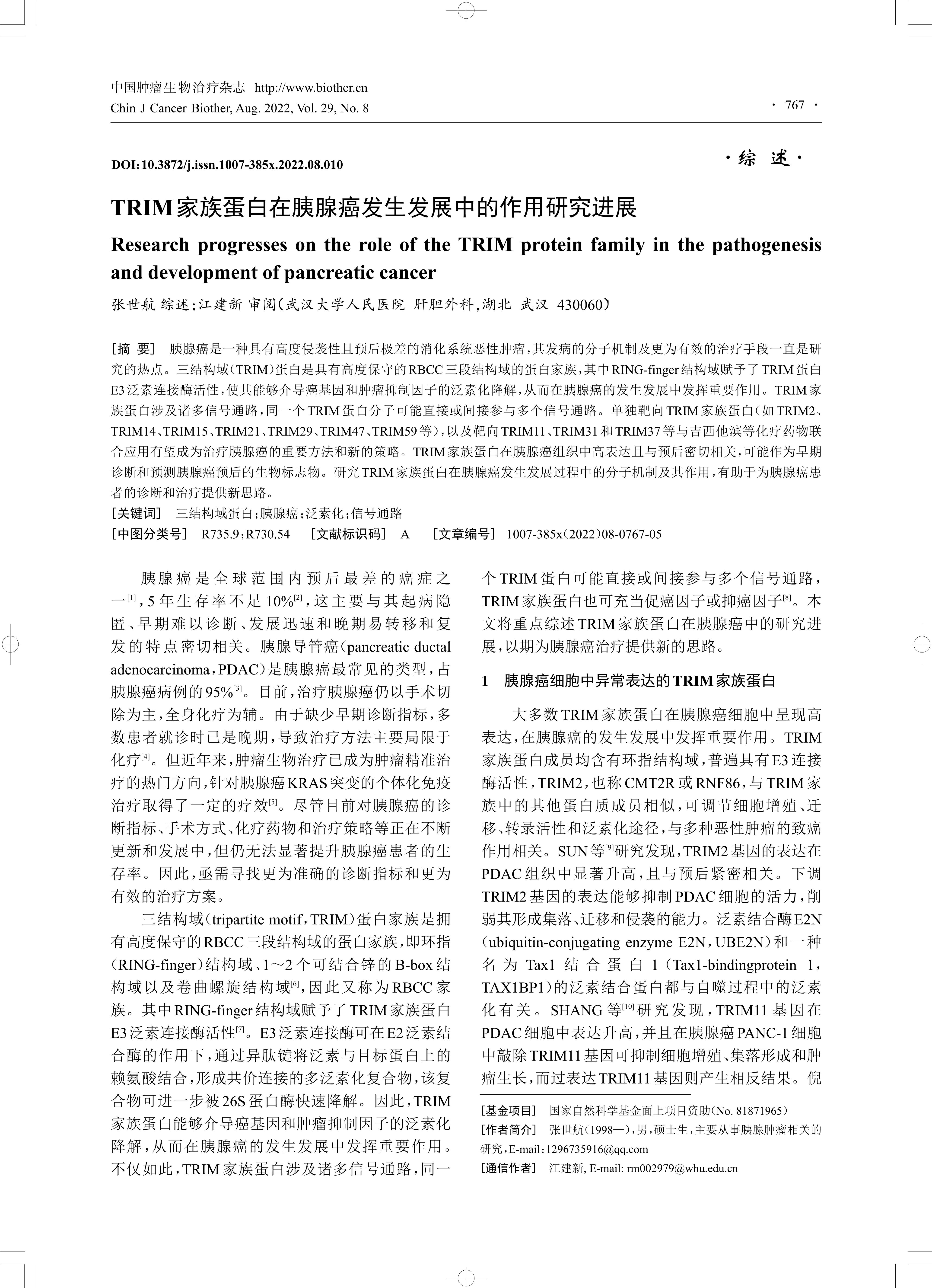 胰腺癌是一种具有高度侵袭性且预后极差的消化系统恶性肿瘤,其发病的分子机制及更为有效的治疗手段一直是研 究的热点。三结构域(TRIM)蛋白是具有高度保守的RBCC三段结构域的蛋白家族,其中RING-finger结构域赋予了TRIM蛋白 E3泛素连接酶活性,使其能够介导癌基因和肿瘤抑制因子的泛素化降解,从而在胰腺癌的发生发展中发挥重要作用。TRIM家 族蛋白涉及诸多信号通路,同一个TRIM蛋白分子可能直接或间接参与多个信号通路。单独靶向TRIM家族蛋白(如TRIM2、 TRIM14、TRIM15、TRIM21、TRIM29、TRIM47、TRIM59等),以及靶向TRIM11、TRIM31和TRIM37等与吉西他滨等化疗药物联 合应用有望成为治疗胰腺癌的重要方法和新的策略。TRIM家族蛋白在胰腺癌组织中高表达且与预后密切相关,可能作为早期 诊断和预测胰腺癌预后的生物标志物。研究TRIM家族蛋白在胰腺癌发生发展过程中的分子机制及其作用,有助于为胰腺癌患 者的诊断和治疗提供新思路。