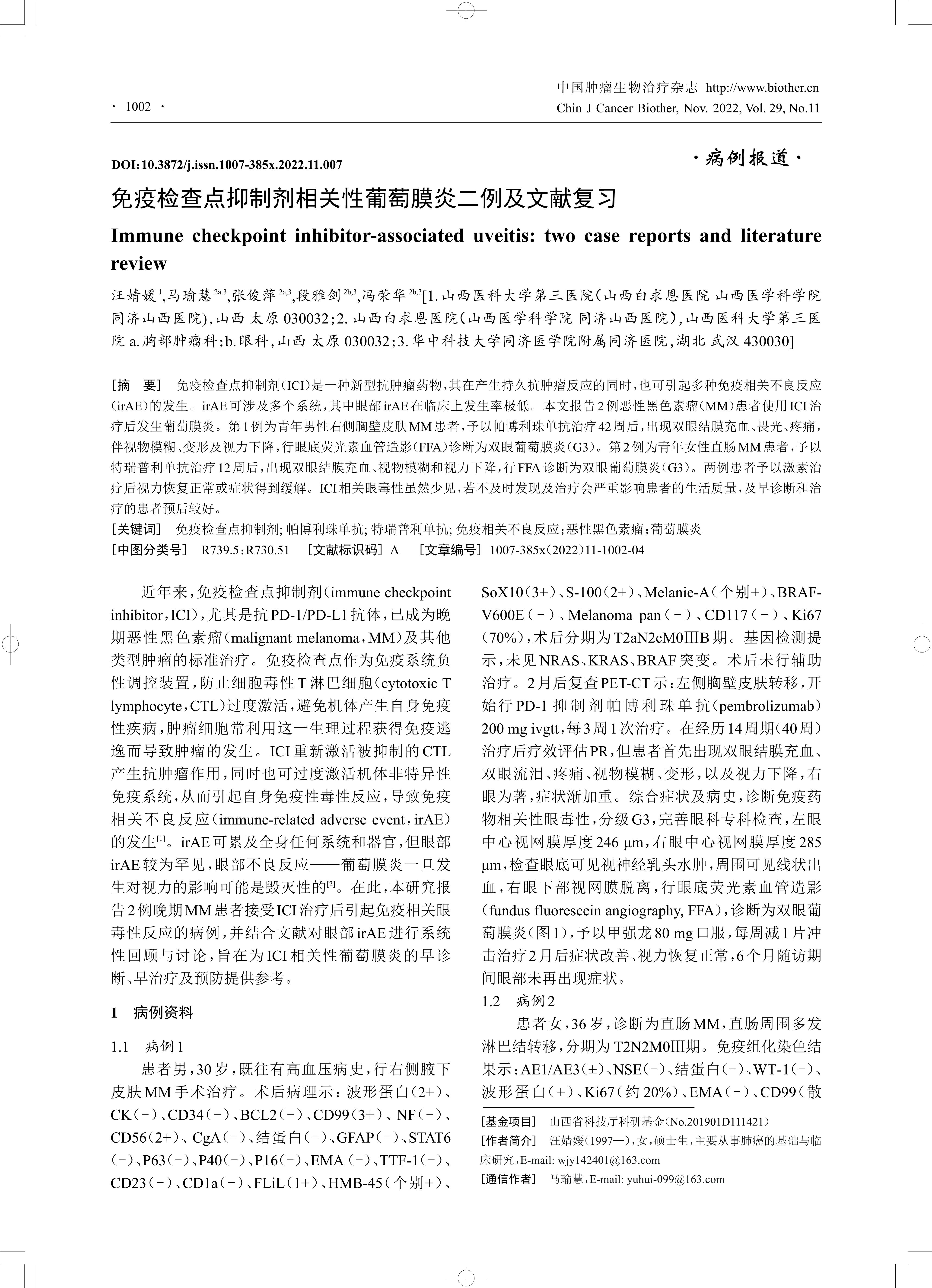 免疫检查点抑制剂(ICI)是一种新型抗肿瘤药物,其在产生持久抗肿瘤反应的同时,也可引起多种免疫相关不良反应 (irAE)的发生。irAE 可涉及多个系统,其中眼部irAE 在临床上发生率极低。本文报告2 例恶性黑色素瘤(MM)患者使用ICI 治疗后发生葡萄膜炎。第1 例为青年男性右侧胸壁皮肤MM 患者,予以帕博利珠单抗治疗42 周后,出现双眼结膜充血、畏光、疼痛, 伴视物模糊、变形及视力下降,行眼底荧光素血管造影(FFA)诊断为双眼葡萄膜炎(G3)。第2 例为青年女性直肠MM 患者,予以 特瑞普利单抗治疗12 周后,出现双眼结膜充血、视物模糊和视力下降,行FFA 诊断为双眼葡萄膜炎(G3)。两例患者予以激素治 疗后视力恢复正常或症状得到缓解。ICI 相关眼毒性虽然少见,若不及时发现及治疗会严重影响患者的生活质量,及早诊断和治疗的患者预后较好。