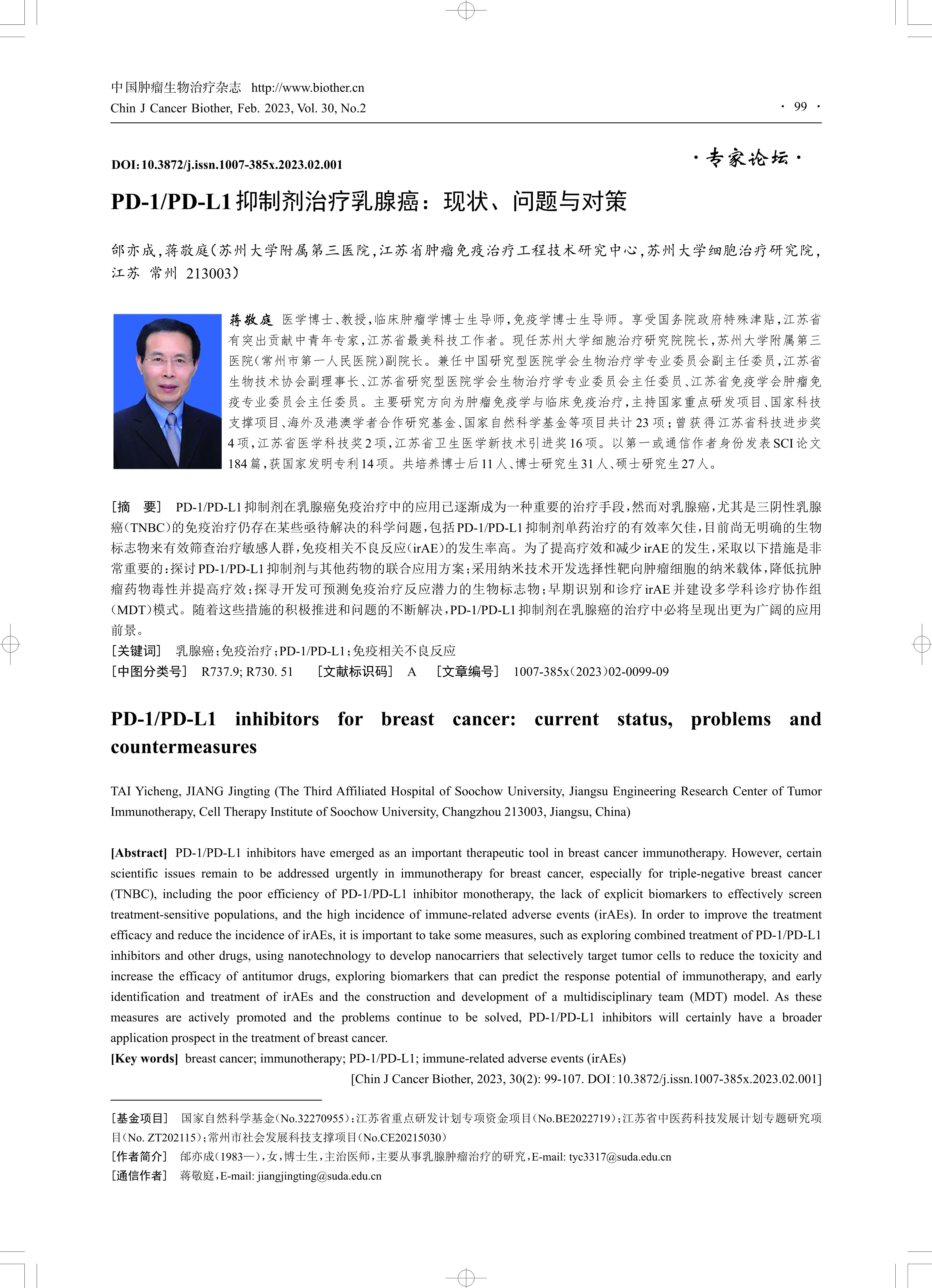 PD-1/PD-L1抑制剂在乳腺癌免疫治疗中的应用已逐渐成为一种重要的治疗手段,然而对乳腺癌,尤其是三阴性乳腺癌(TNBC)的免疫治疗仍存在某些亟待解决的科学问题,包括PD-1/PD-L1抑制剂单药治疗的有效率欠佳,目前尚无明确的生物标志物来有效筛查治疗敏感人群,免疫相关不良反应(irAE)的发生率高。为了提高疗效和减少irAE 的发生,采取以下措施是非常重要的:探讨PD-1/PD-L1抑制剂与其他药物的联合应用方案;采用纳米技术开发选择性靶向肿瘤细胞的纳米载体,降低抗肿瘤药物毒性并提高疗效;探寻开发可预测免疫治疗反应潜力的生物标志物;早期识别和诊疗irAE 并建设多学科诊疗协作组(MDT)模式。随着这些措施的积极推进和问题的不断解决,PD-1/PD-L1抑制剂在乳腺癌的治疗中必将呈现出更为广阔的应用前景。