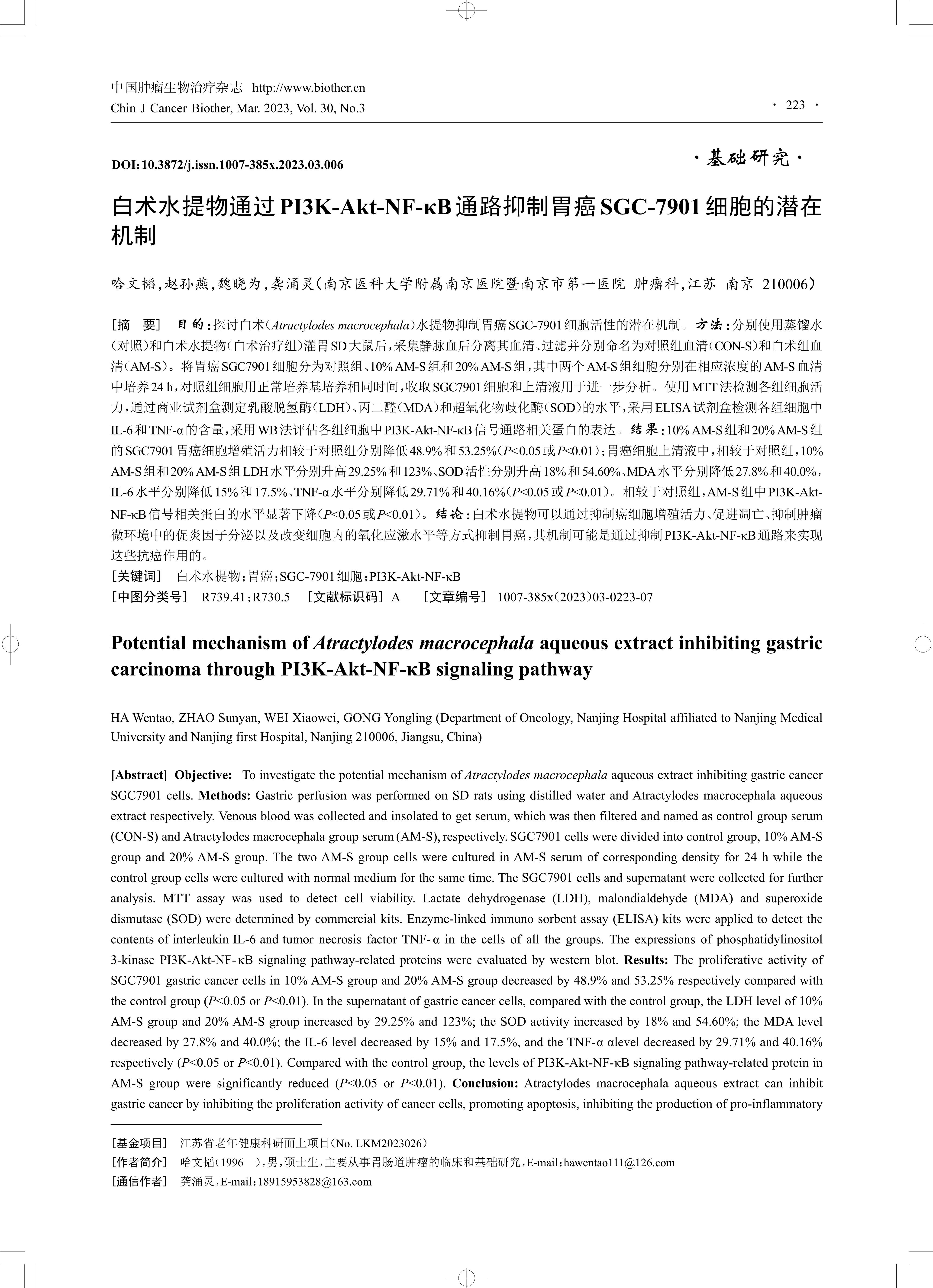 Objective: To investigate the potential mechanism of Atractylodes macrocephala aqueous extract inhibiting gastric cancer SGC7901 cells. Methods: Gastric perfusion was performed on SD rats using distilled water and Atractylodes macrocephala aqueous extract respectively. Venous blood was collected and insolated to get serum, which was then filtered and named as control group serum (CON-S) and Atractylodes macrocephala group serum (AM-S), respectively. SGC7901 cells were divided into control group, 10% AM-S group and 20% AM-S group. The two AM-S group cells were cultured in AM-S serum of corresponding density for 24 h while the control group cells were cultured with normal medium for the same time. The SGC7901 cells and supernatant were collected for further analysis. MTT assay was used to detect cell viability. Lactate dehydrogenase (LDH), malondialdehyde (MDA) and superoxide dismutase (SOD) were determined by commercial kits. Enzyme-linked immuno sorbent assay (ELISA) kits were applied to detect thecontents of interleukin IL-6 and tumor necrosis factor TNF- α in the cells of all the groups. The expressions of phosphatidylinositol 3-kinase PI3K-Akt-NF- κB signaling pathway-related proteins were evaluated by western blot. Results: The proliferative activity of SGC7901 gastric cancer cells in 10% AM-S group and 20% AM-S group decreased by 48.9% and 53.25% respectively compared with the control group (P<0.05 or P<0.01). In the supernatant of gastric cancer cells, compared with the control group, the LDH level of 10% AM-S group and 20% AM-S group increased by 29.25% and 123%; the SOD activity increased by 18% and 54.60%; the MDA leveldecreased by 27.8% and 40.0%; the IL-6 level decreased by 15% and 17.5%, and the TNF-α αlevel decreased by 29.71% and 40.16% respectively (P<0.05 or P<0.01). Compared with the control group, the levels of PI3K-Akt-NF-κB signaling pathway-related protein in AM-S group were significantly reduced (P<0.05 or P<0.01). Conclusion: Atractylodes macrocephala aqueous extract can inhibit gastric cancer by inhibiting the proliferation activity of cancer cells, promoting apoptosis, inhibiting the production of pro-inflammatory factors in tumor microenvironment and changing the level of intracellular oxidative stress, the mechanism of which might be that these anti-cancerous effects are achieved by inhibiting PI3K-Akt-NF-κB signaling pathway.