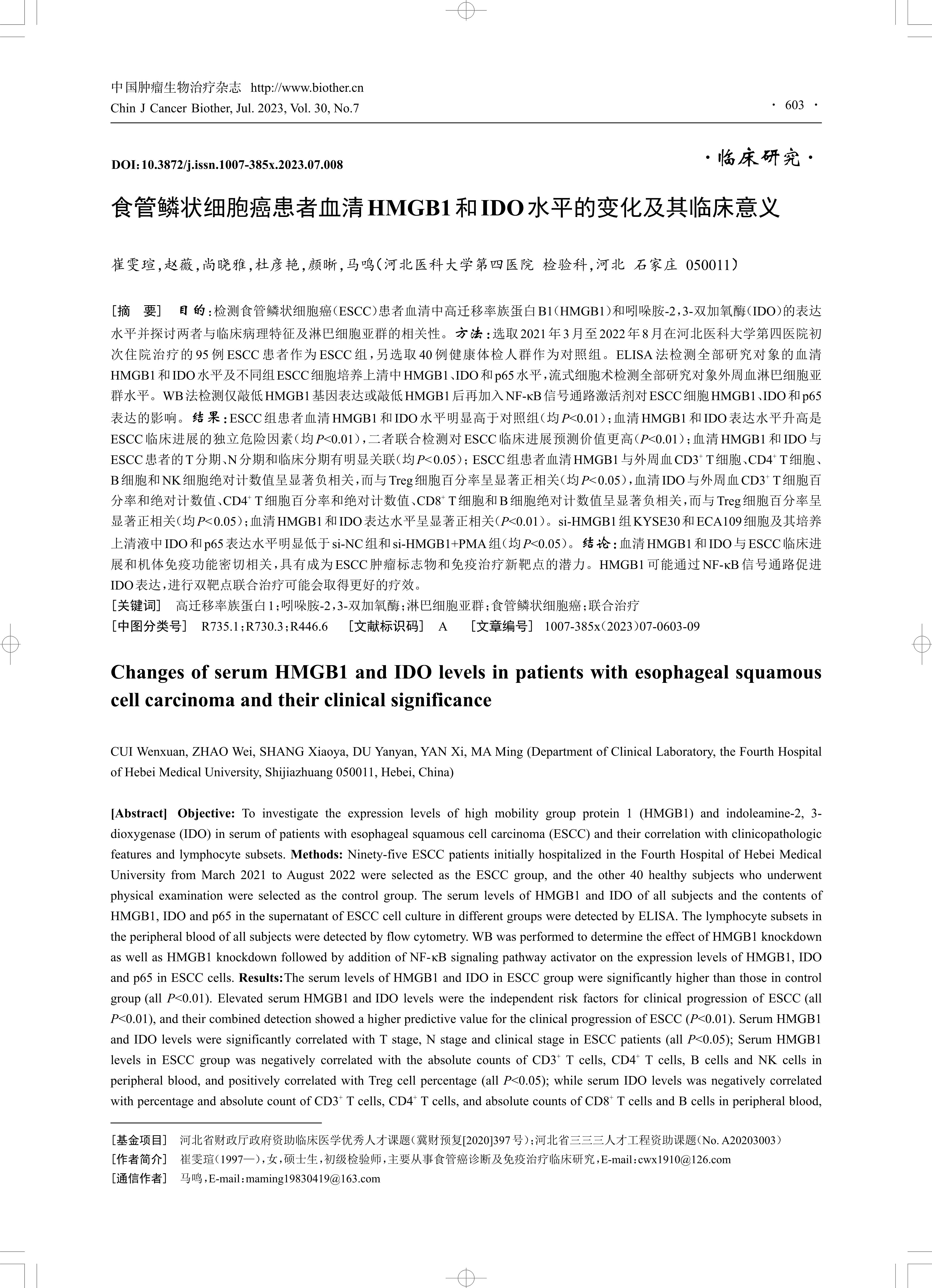 Objective: To investigate the expression levels of high mobility group protein 1 (HMGB1) and indoleamine-2, 3-dioxygenase (IDO) in serum of patients with esophageal squamous cell carcinoma (ESCC) and their correlation with clinicopathologic features and lymphocyte subsets. Methods: Ninety-five ESCC patients initially hospitalized in the Fourth Hospital of Hebei Medical University from March 2021 to August 2022 were selected as the ESCC group, and the other 40 healthy subjects who underwent physical examination were selected as the control group. The serum levels of HMGB1 and IDO of all subjects and the contents of HMGB1, IDO and p65 in the supernatant of ESCC cell culture in different groups were detected by ELISA. The lymphocyte subsets in the peripheral blood of all subjects were detected by flow cytometry. WB was performed to determine the effect of HMGB1 knockdown as well as HMGB1 knockdown followed by addition of NF-κB signaling pathway activator on the expression levels of HMGB1, IDO and p65 in ESCC cells. Results:The serum levels of HMGB1 and IDO in ESCC group were significantly higher than those in control group (all P<0.01). Elevated serum HMGB1 and IDO levels were the independent risk factors for clinical progression of ESCC (all P<0.01), and their combined detection showed a higher predictive value for the clinical progression of ESCC (P<0.01). Serum HMGB1 and IDO levels were significantly correlated with T stage, N stage and clinical stage in ESCC patients (all P<0.05); Serum HMGB1 levels in ESCC group was negatively correlated with the absolute counts of CD3+ T cells, CD4+ T cells, B cells and NK cells in peripheral blood, and positively correlated with Treg cell percentage (all P<0.05); while serum IDO levels was negatively correlated with percentage and absolute count of CD3+ T cells, CD4+ T cells, and absolute counts of CD8+ T cells and B cells in peripheral blood,but positively correlated with the percentage of Treg cells (all P<0.05). Serum HMGB1 was positively correlated with IDO (P<0.01). The expression levels of IDO and p65 in KYSE30 and ECA109 cells and their culture supernatant in si-HMGB1 group were significantly lower than those in si-NC group and si-HMGB1+PMA group (all P<0.05). Conclusion: Serum HMGB1 and IDO are closely related to the clinical progression of ESCC and immune function of ESCC patients, and have the potential to serve as tumor markers and new immunotherapy targets of ESCC. HMGB1 may promote IDO expression through NF-κB signaling pathway, and dual-target combination therapy may achieve better efficacy.