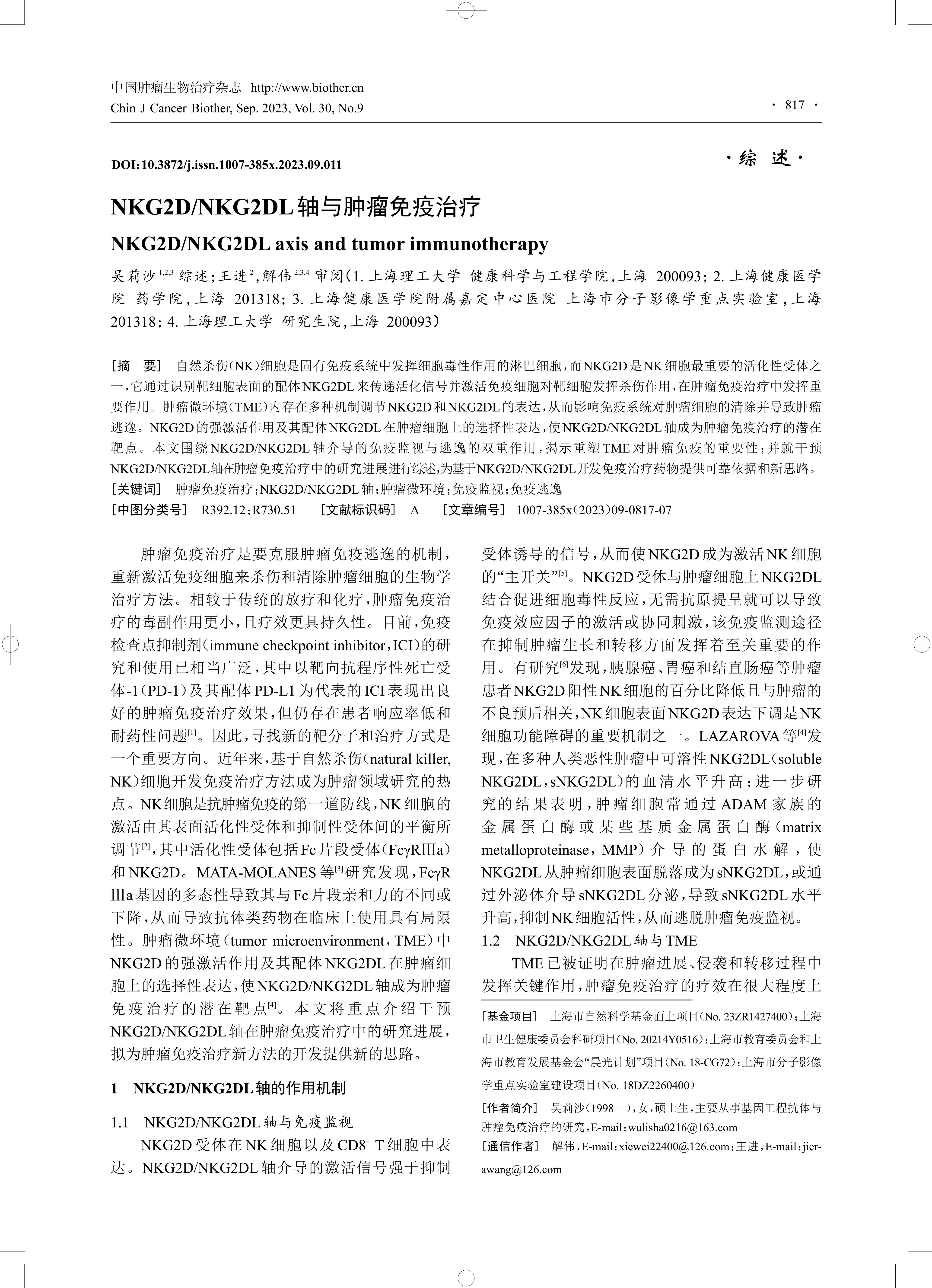 自然杀伤(NK)细胞是固有免疫系统中发挥细胞毒性作用的淋巴细胞,而NKG2D是NK细胞最重要的活化性受体之一,它通过识别靶细胞表面的配体NKG2DL来传递活化信号并激活免疫细胞对靶细胞发挥杀伤作用,在肿瘤免疫治疗中发挥重要作用。肿瘤微环境(TME)内存在多种机制调节NKG2D和NKG2DL的表达,从而影响免疫系统对肿瘤细胞的清除并导致肿瘤逃逸。NKG2D的强激活作用及其配体NKG2DL在肿瘤细胞上的选择性表达,使NKG2D/NKG2DL轴成为肿瘤免疫治疗的潜在靶点。本文围绕NKG2D/NKG2DL 轴介导的免疫监视与逃逸的双重作用,揭示重塑TME 对肿瘤免疫的重要性;并就干预NKG2D/NKG2DL轴在肿瘤免疫治疗中的研究进展进行综述,为基于NKG2D/NKG2DL开发免疫治疗药物提供可靠依据和新思路。